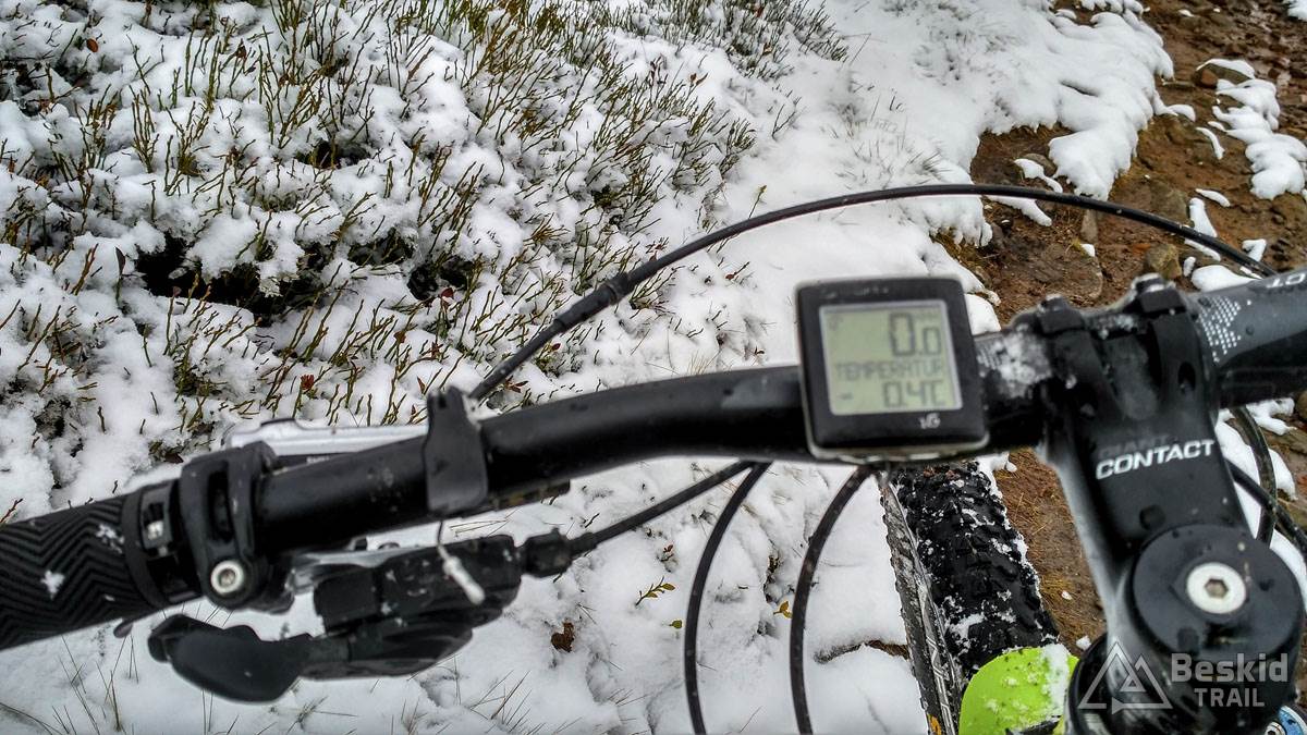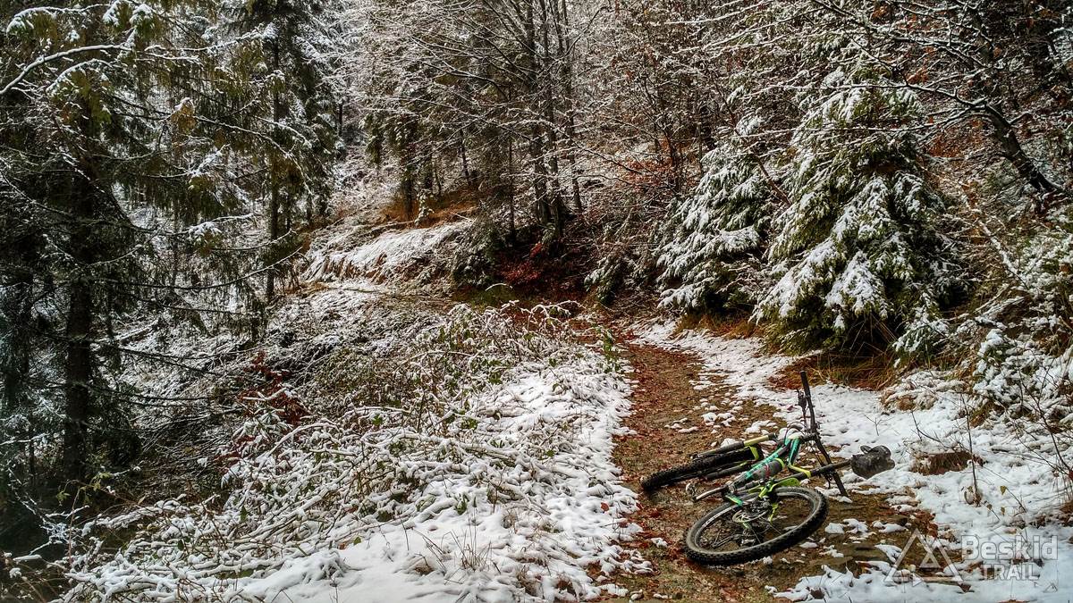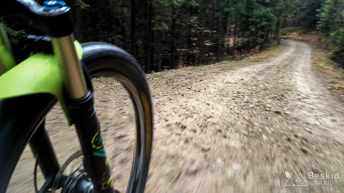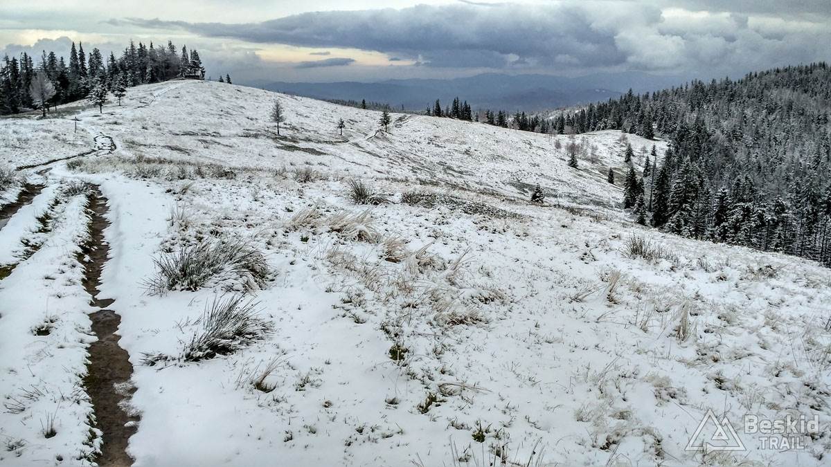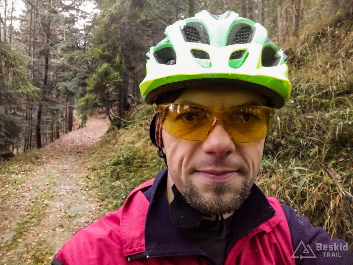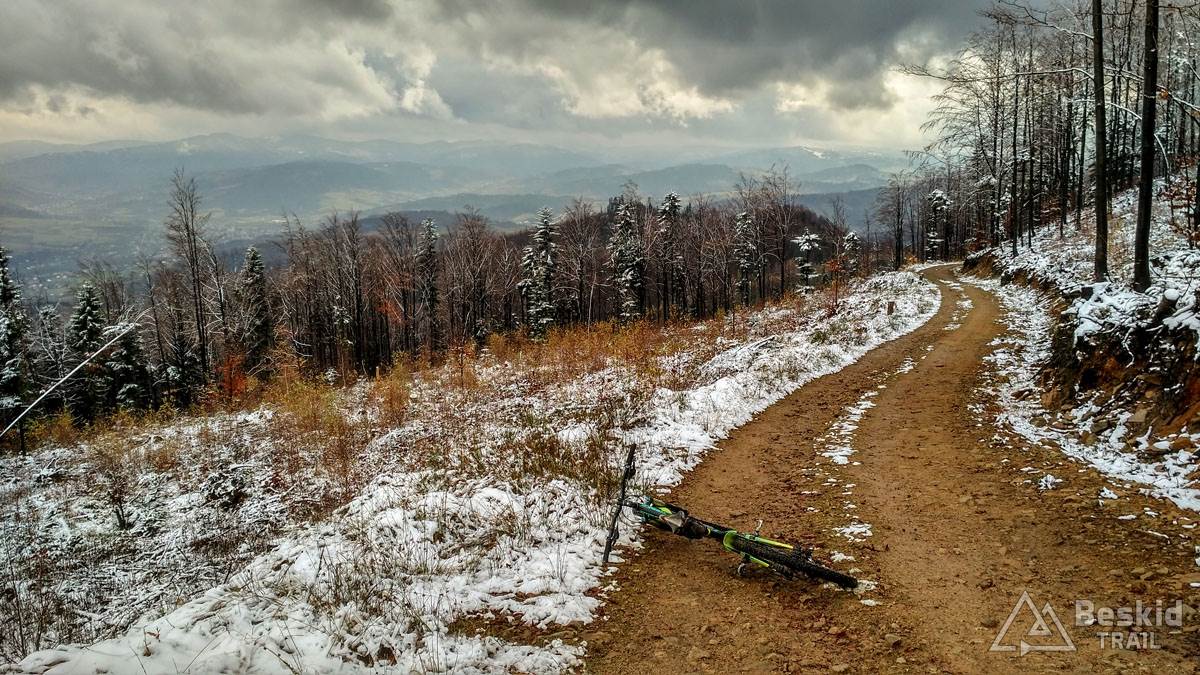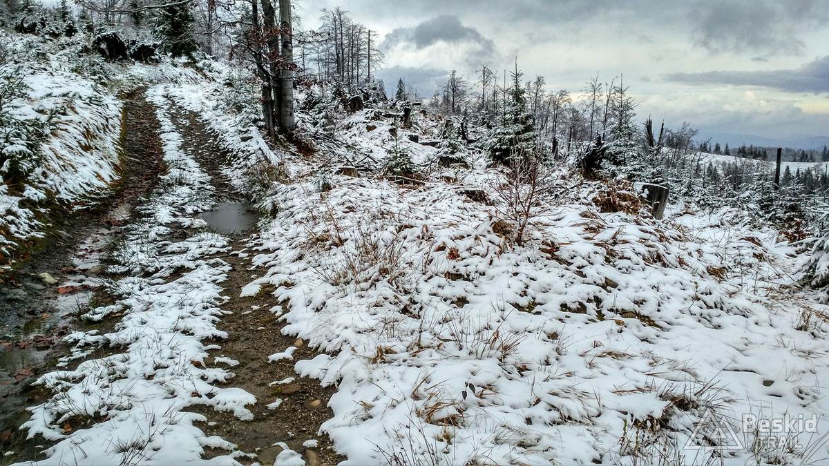 Podjazd dobrze mnie rozgrzał i trawers południowymi stokami Glinnego i Magurki Radziechowskiej nawet niespecjalnie wychłodził. Gdy tylko wiatr nie doskwiera, niska temperatura na rowerze jest jeszcze do wytrzymania. Natomiast mokre podłoże dość szybko przemoczyło mi buty i pomimo ochraniaczy neoprenowych, stopy zaczęły nieco się wychładzać. Wiedziałem, że nie mogę za wiele dziś w tych warunkach przejechać, stąd też i plan trasy był taki a nie inny.