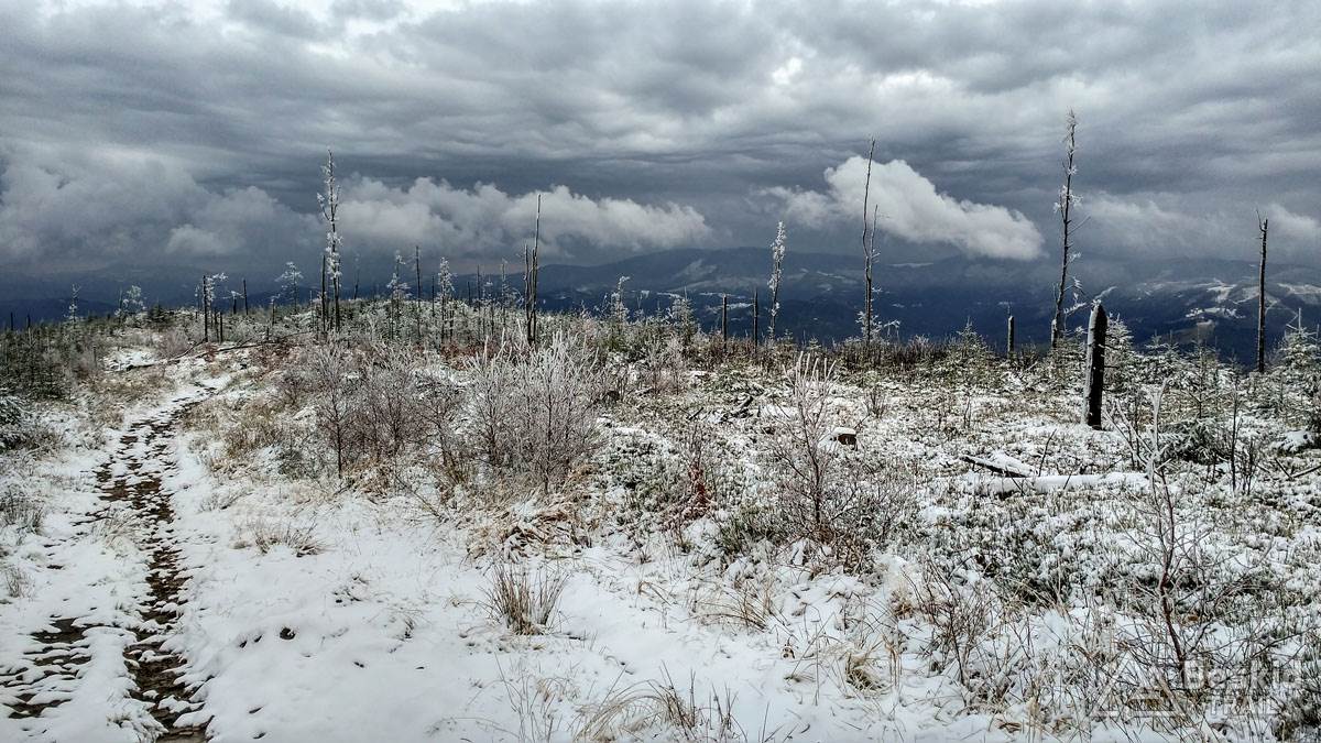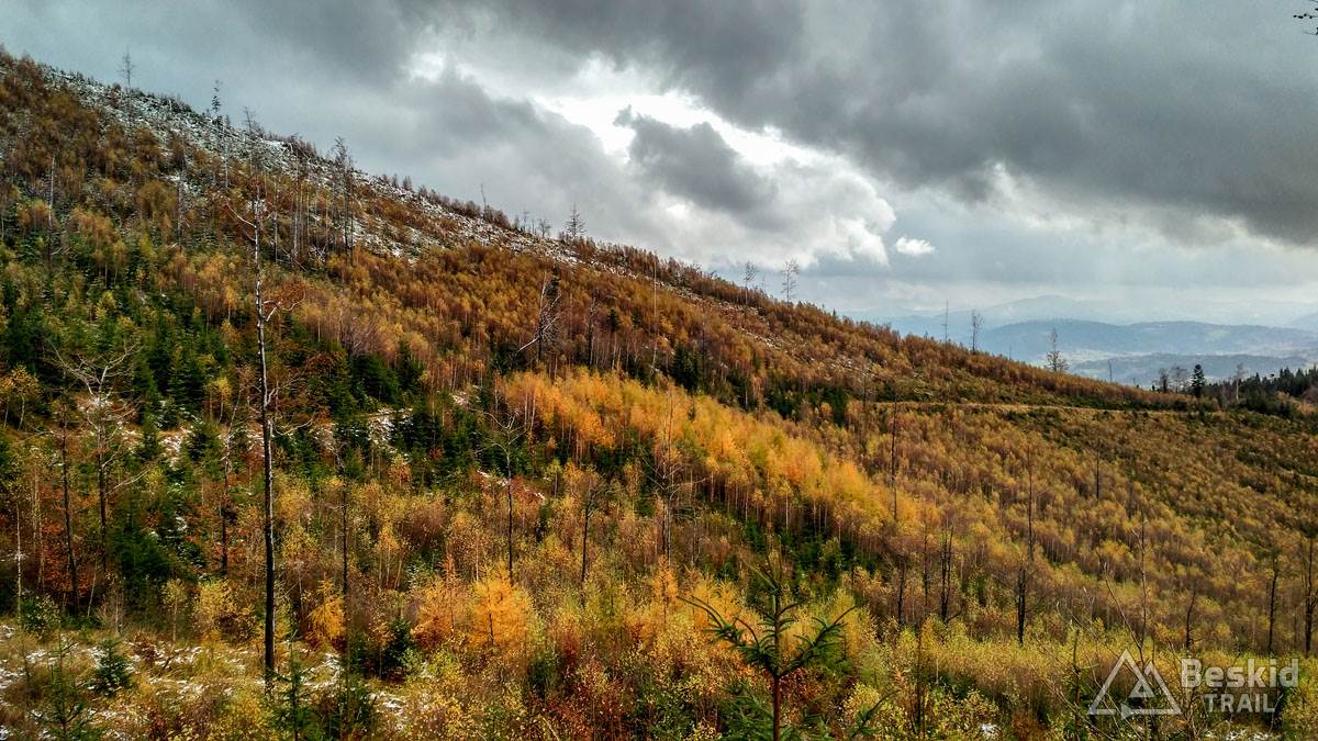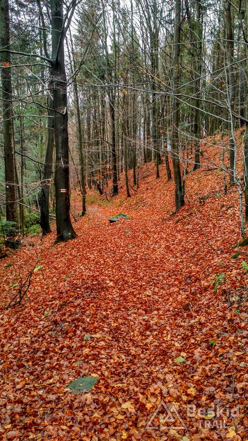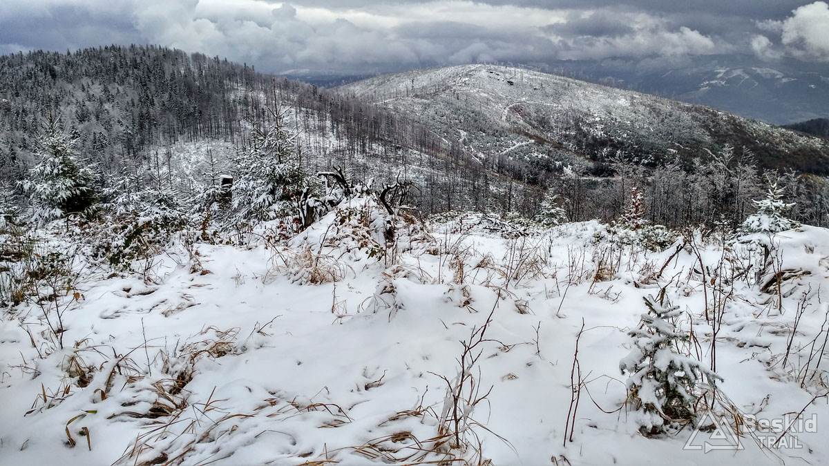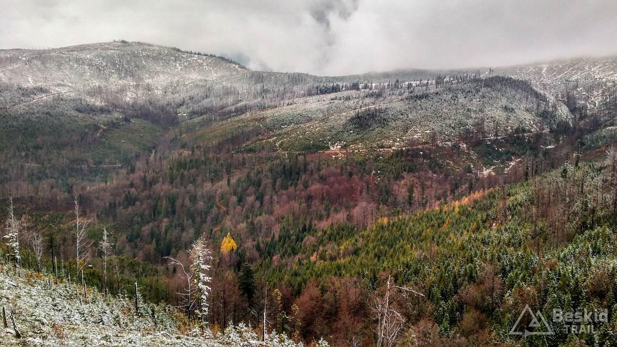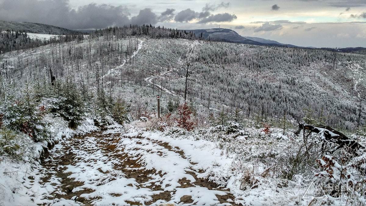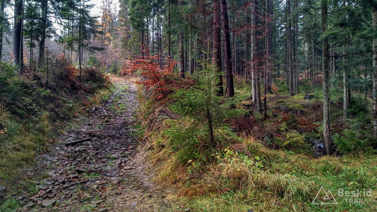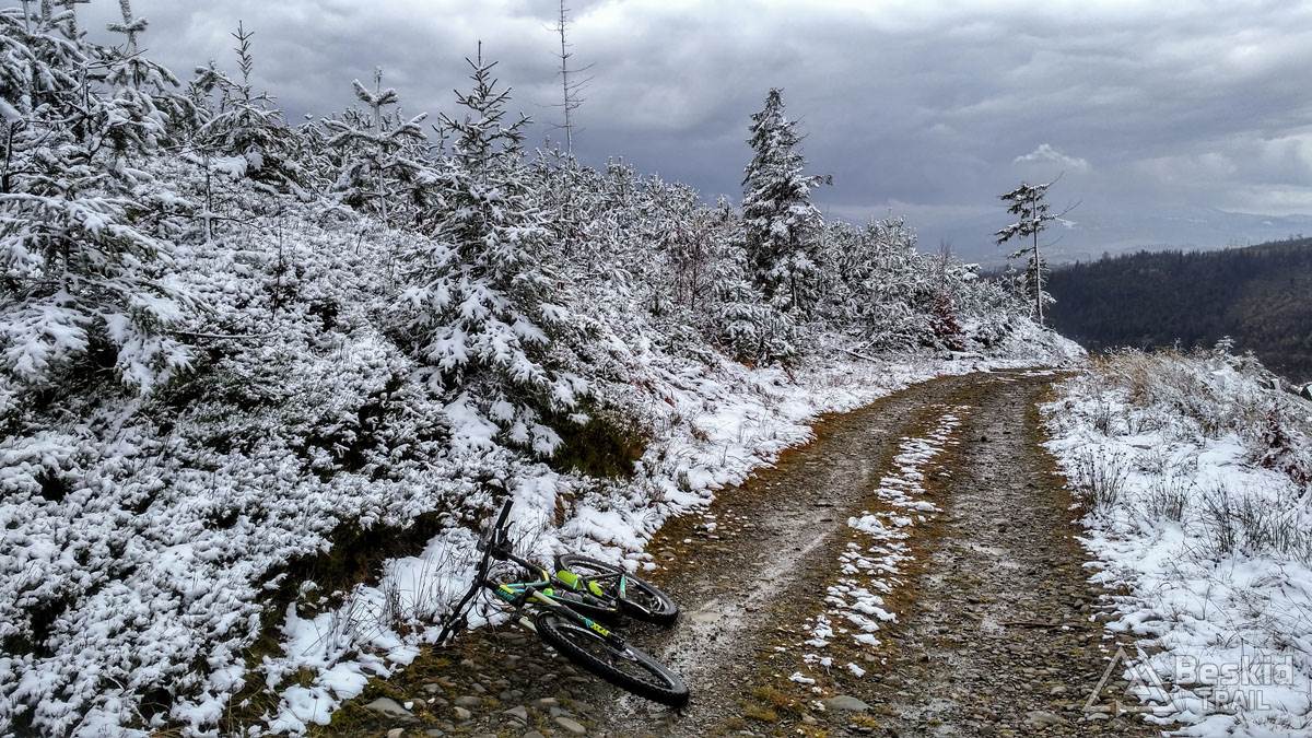 Podjazd dobrze mnie rozgrzał i trawers południowymi stokami Glinnego i Magurki Radziechowskiej nawet niespecjalnie wychłodził. Gdy tylko wiatr nie doskwiera, niska temperatura na rowerze jest jeszcze do wytrzymania. Natomiast mokre podłoże dość szybko przemoczyło mi buty i pomimo ochraniaczy neoprenowych, stopy zaczęły nieco się wychładzać. Wiedziałem, że nie mogę za wiele dziś w tych warunkach przejechać, stąd też i plan trasy był taki a nie inny.