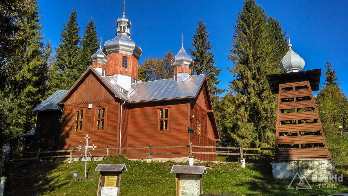 Po dwóch godzinach dojeżdżam do niebieskiego szlaku, którym zjeżdżam do Kamiannej. Przy cerkwi św. Paraskwy, w ogrzewających promieniach słońca, robię sobie krótką przerwę, nieco schnę i przede wszystkim grzeję się. Trasę w kierunku Przełęczy Huta kontynuuje już nie szlakiem, a drogą leśną, ponieważ ilość błota i opóźnienie z tego wynikające, mogłyby mi skutecznie uniemożliwić zrealizowanie zaplanowanej trasy. Poza tym trzeba sobie coś na później zostawić. A nie ukrywam, że nie skłonny jestem tak łatwo odpuszczać przejechania wcześniej przygotowanej trasy.
