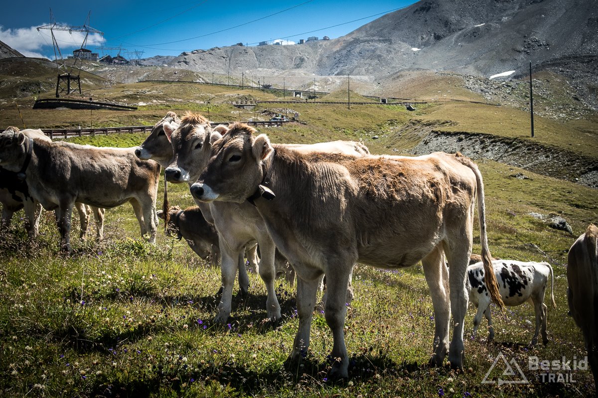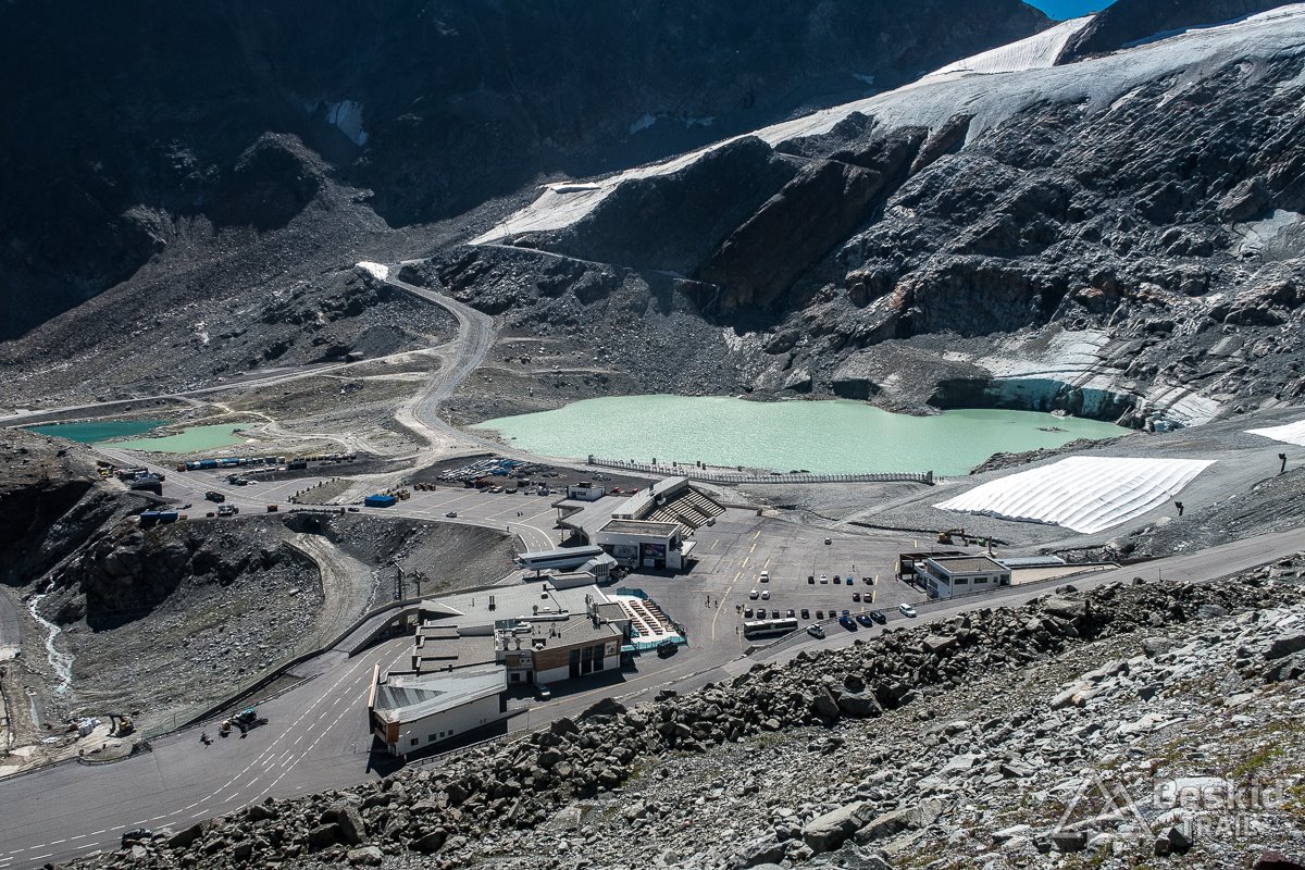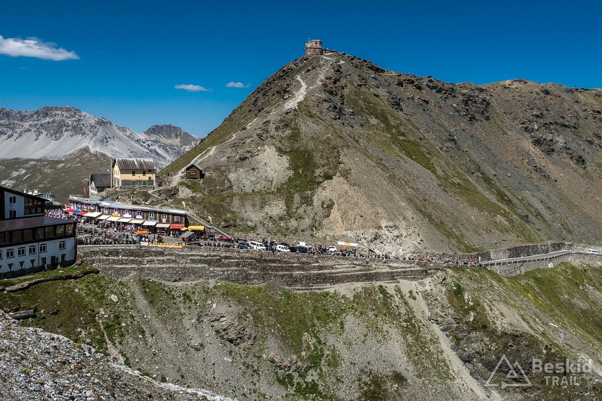 Ruch na przełęczy tego dnia był spory. Zresztą – w niemal każdy pogodny dzień wakacji tak jest, co można na przykład sprawdzić na kilku dostępnych kamerach (https://www.bergfex.pl/stilfser-joch-ortler/webcams/c2292/ ). Warto więc podjechać kawałek wyżej lub na osobny parking, by cieszyć się względnym spokojem.