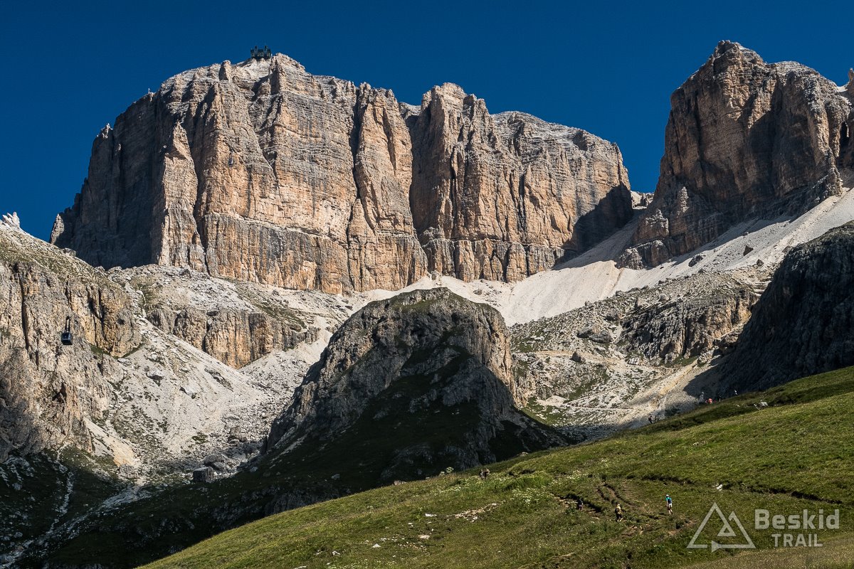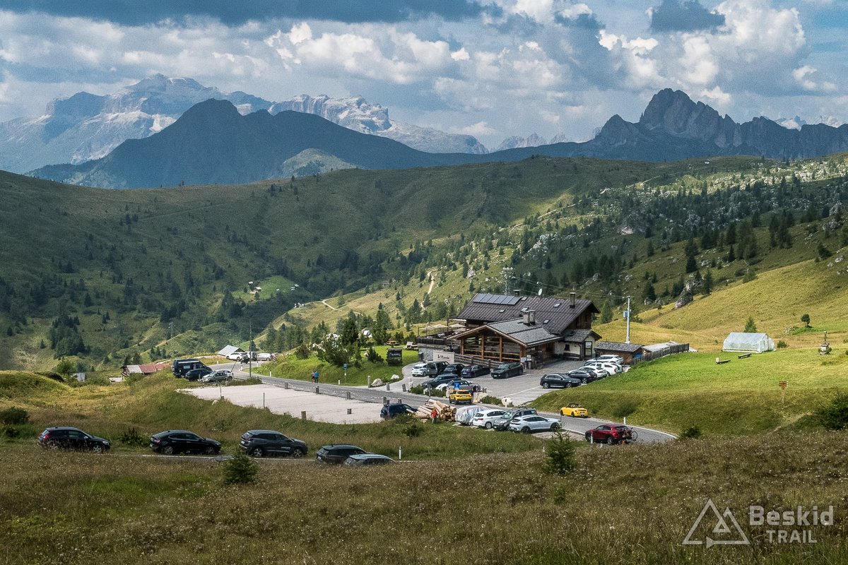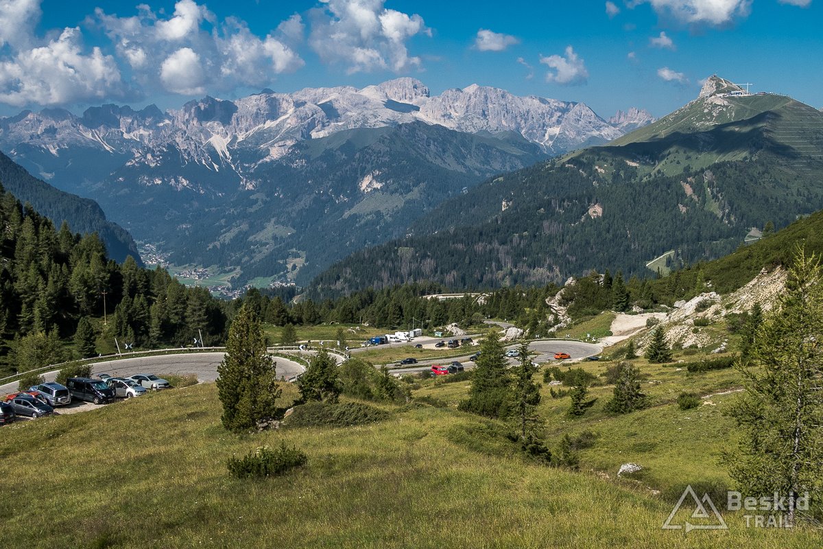 Passo Pordoi (2239 m. n.p.m.) była już bardziej obleganą przez rowerzystów przełęczą, szczególnie że do grup szosowców dołączyli eMTeBowcy, którzy czy to na ebajkach, czy przy pomocy wyciągów, korzystali z lokalnych tras enduro. Zrobiłem kilka zdjęć i pojechałem dalej, do Arabby, gdzie uzupełniłem nieco prowiant, wiedząc że kolejna okazja będzie najwcześniej po drugiej stronie przełęczy Passo di Campolongo (1875m. n.p.m.) – w Corvara in Badia, dokąd jednak zamierzałem dotrzeć bardziej okrężną drogą ;).