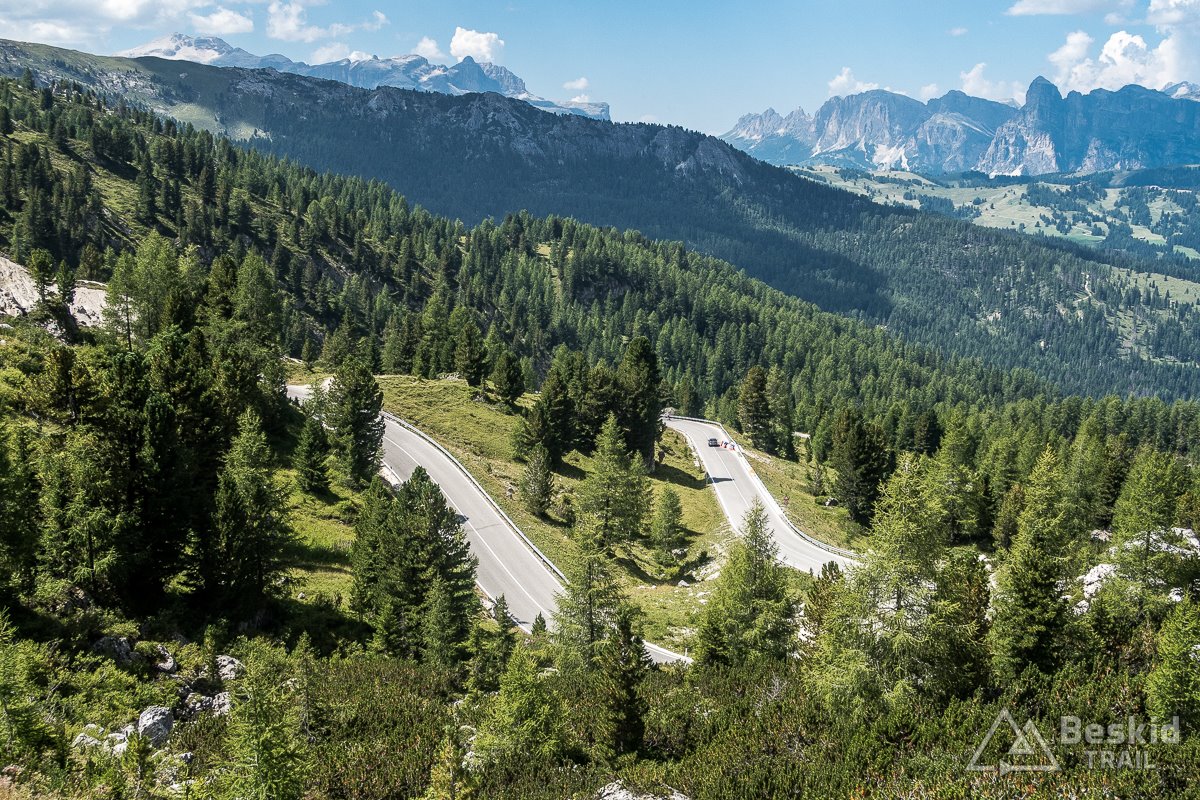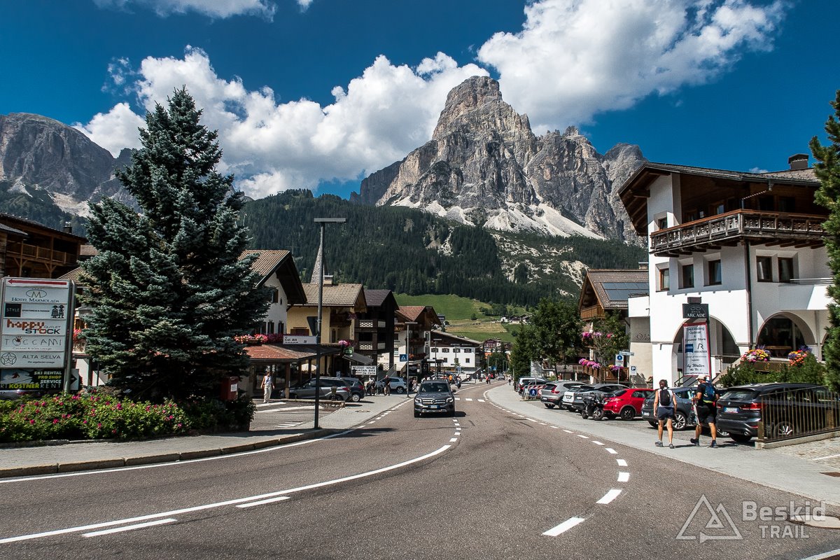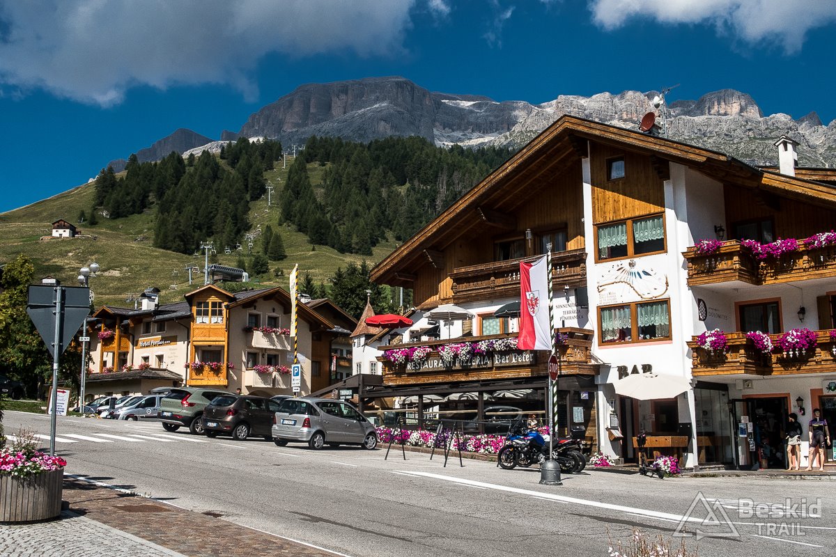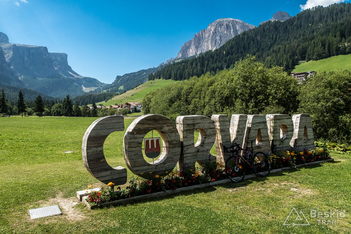 Zjazd z Valparoli jest bardzo długi i przyjemny, szczególnie że widokowo – jak to w Dolomitach bywa – imponujący. Na rondzie w Badii skręcam w lewo, i powoli zaczynam podjazd w kierunku ostatniej przełęczy tego dnia. A jako że trasa całkiem sprawnie mi idzie, postanawiam jeszcze zrobić krótki postój w Corvara in Badia, by korzystając z jedynego otwartego sklepu w czasie sjesty – uzupełnić prowiant i nieco schłodzić się, ponieważ słońce już solidnie rozgrzało dzień.