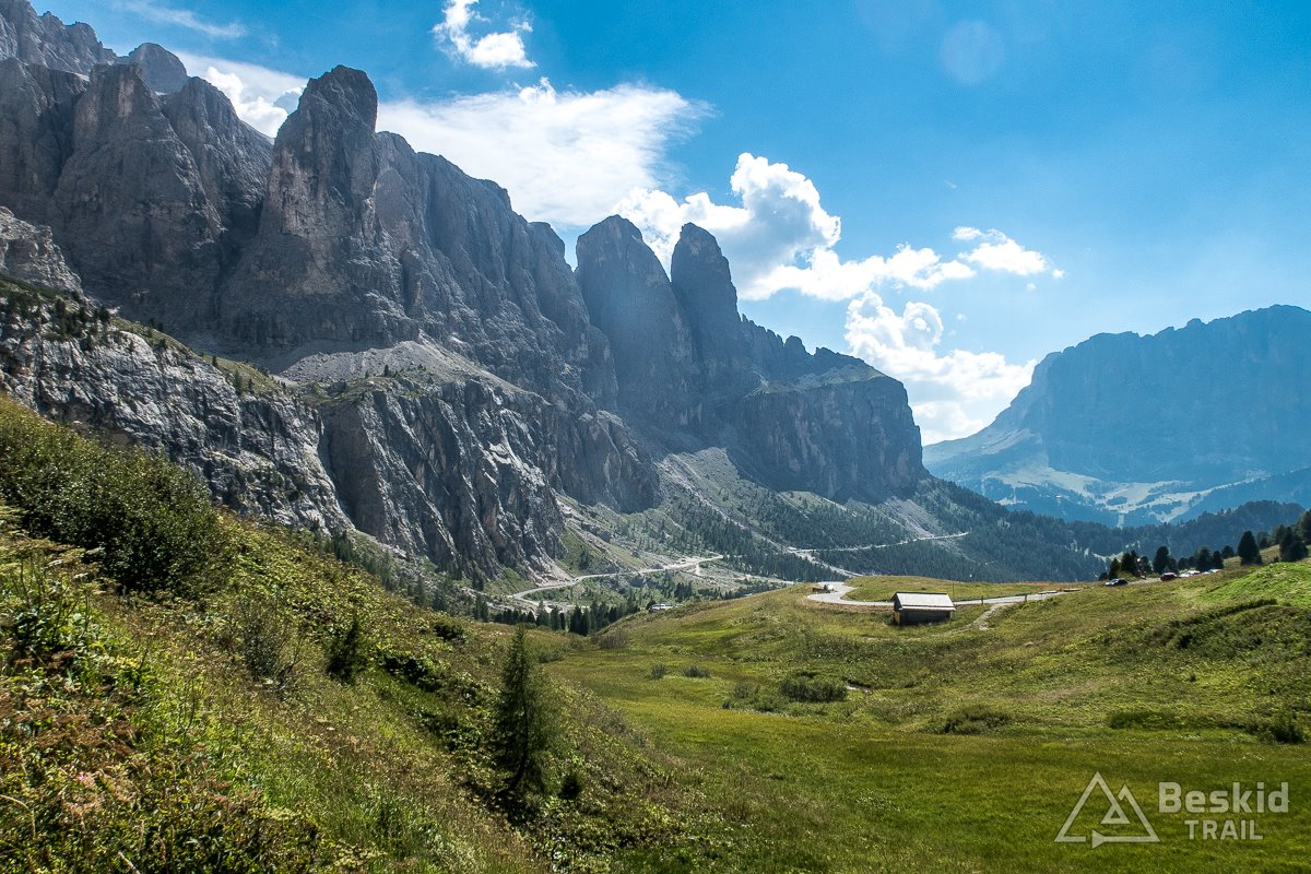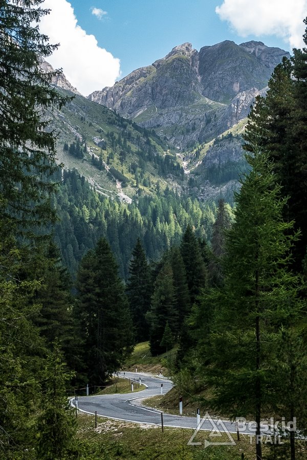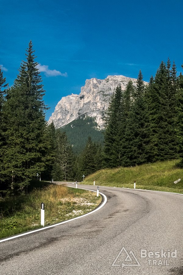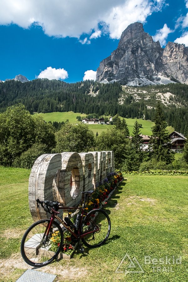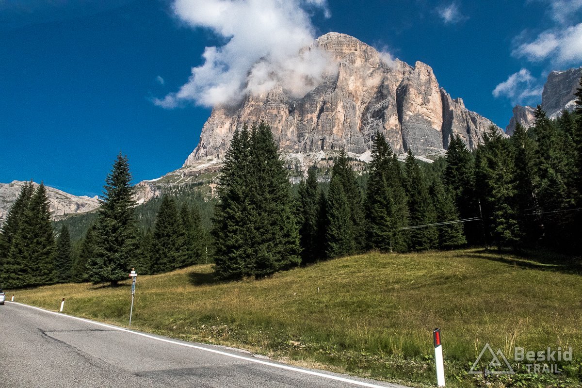 Zjazd z Valparoli jest bardzo długi i przyjemny, szczególnie że widokowo – jak to w Dolomitach bywa – imponujący. Na rondzie w Badii skręcam w lewo, i powoli zaczynam podjazd w kierunku ostatniej przełęczy tego dnia. A jako że trasa całkiem sprawnie mi idzie, postanawiam jeszcze zrobić krótki postój w Corvara in Badia, by korzystając z jedynego otwartego sklepu w czasie sjesty – uzupełnić prowiant i nieco schłodzić się, ponieważ słońce już solidnie rozgrzało dzień.