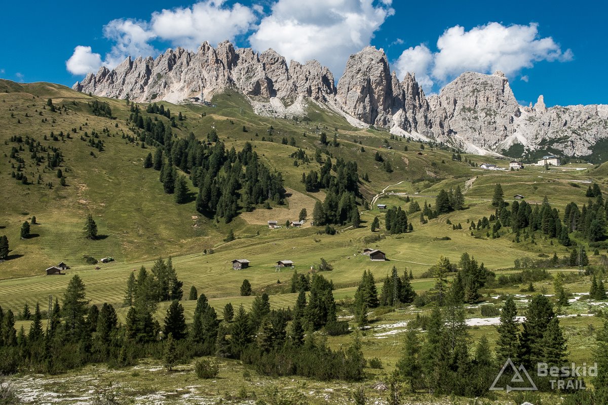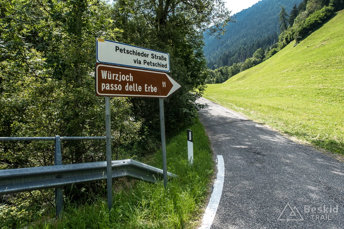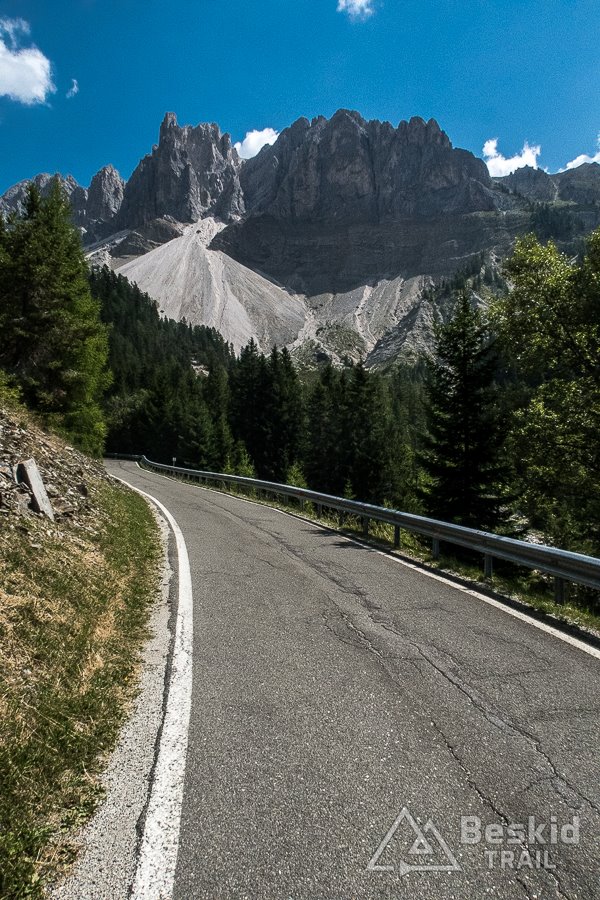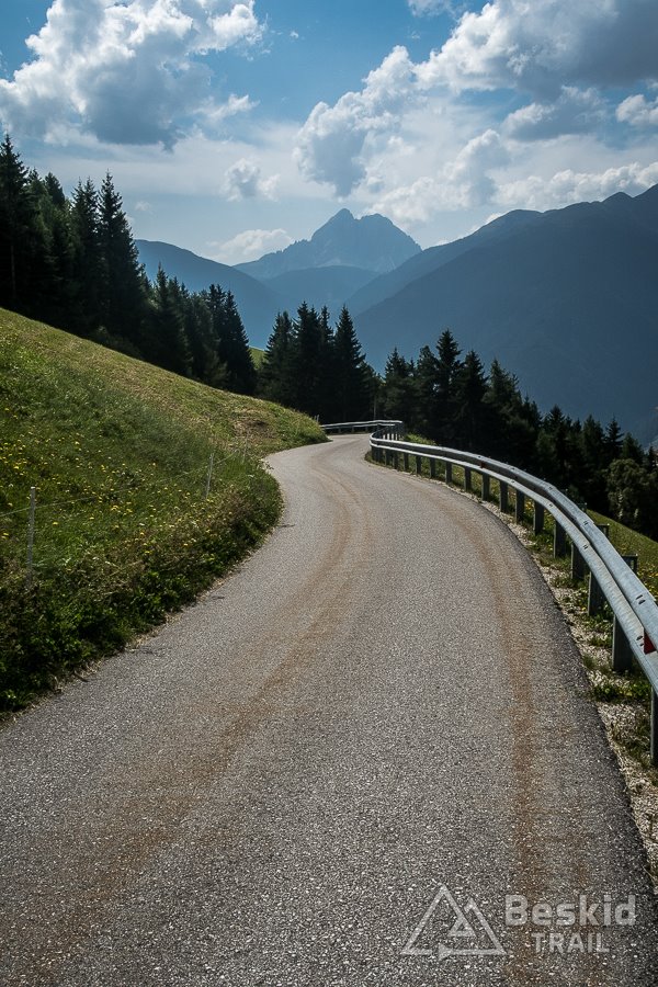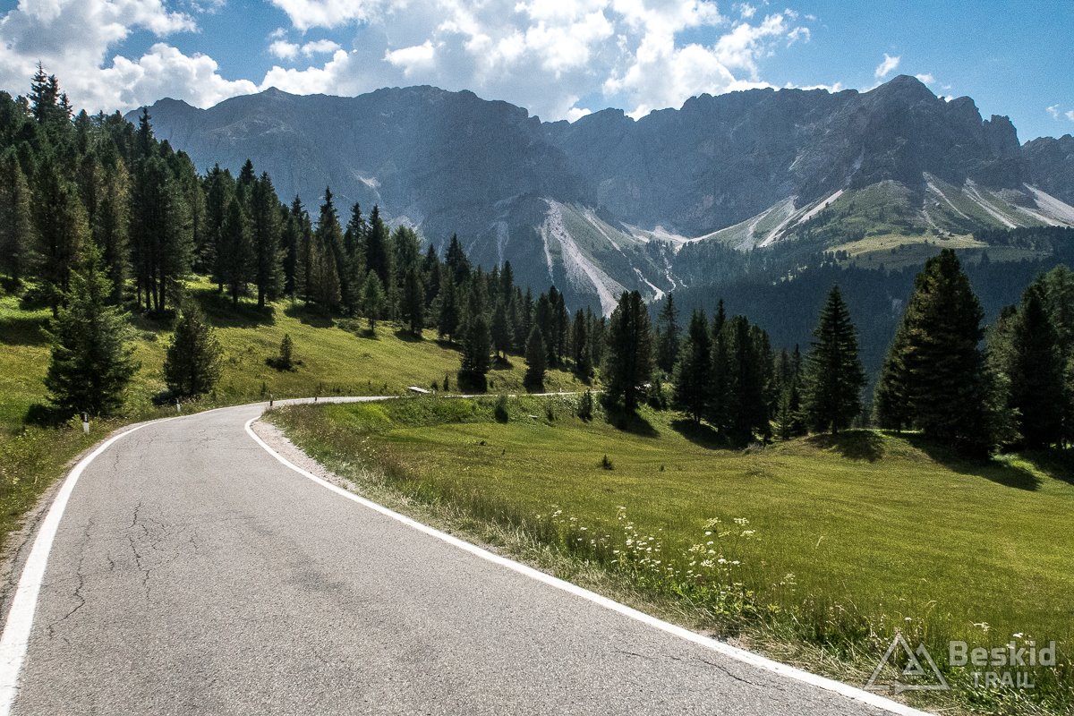 Swą wycieczkę rozpocząłem w Urtijëi kilkukilometrowym, lekkim zjazdem. Zaraz po zjechaniu z głównej drogi, czekał mnie pierwszy z dwóch stromszych podjazdów tego dnia. Tyle, że ten właśnie był bardziej wymagający i miejscami naprawdę stromy. A czekało mnie zdobycie – wydawać by się mogło – niepozornej przełęczy Passo Pinei (1437 m. n.p.m.). Z obu stron jest trudna do wjechania, i zależnie od aktualnie wybranej wersji – jest poważnym wyzwaniem dla kolarza. Mnie tego dnia przyszło pokonać ją w krótszej wersji, a nagrodą był długi, niemal stały zjazd aż do Castelrotto