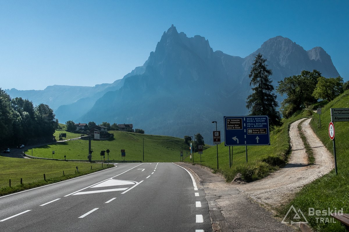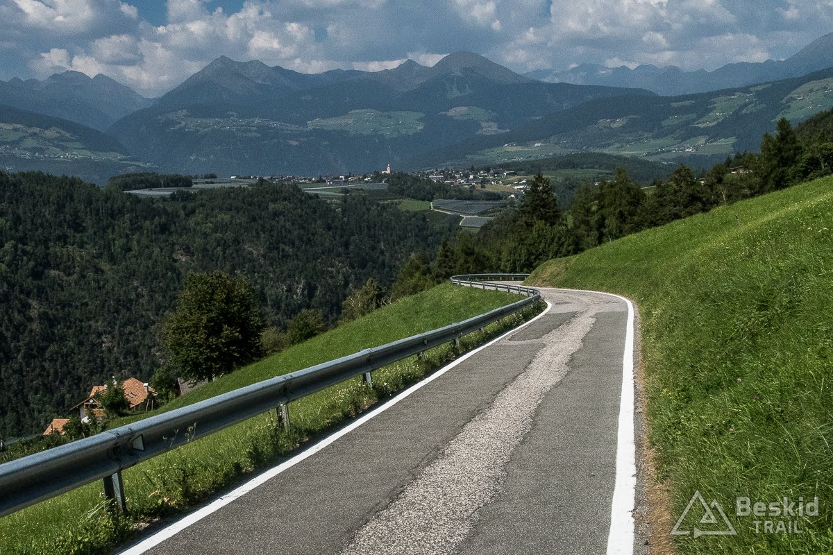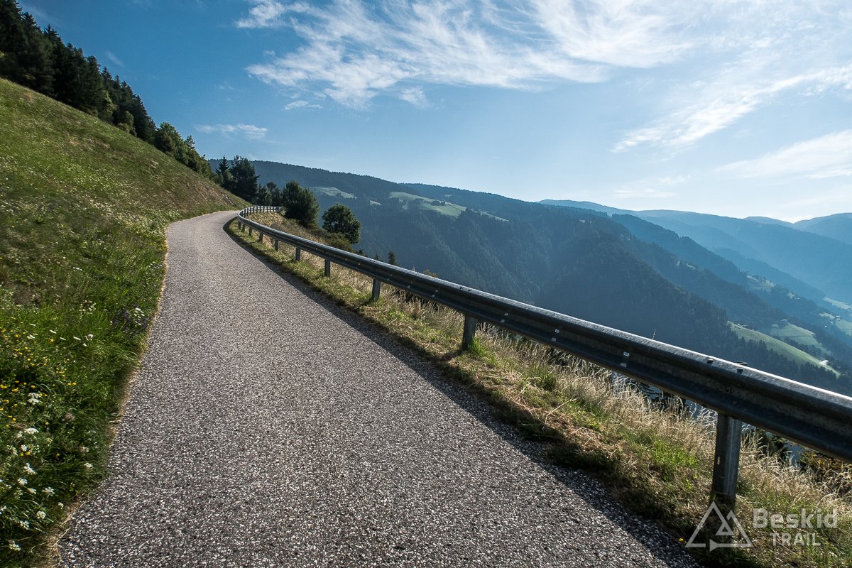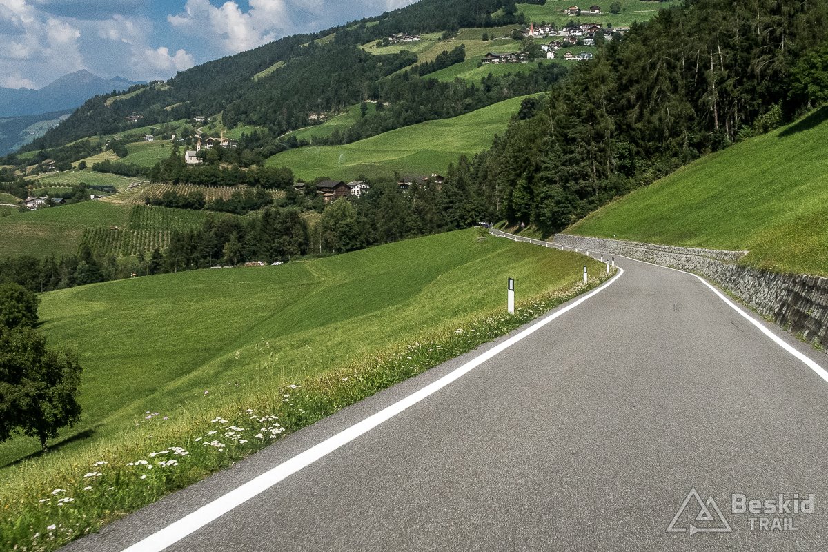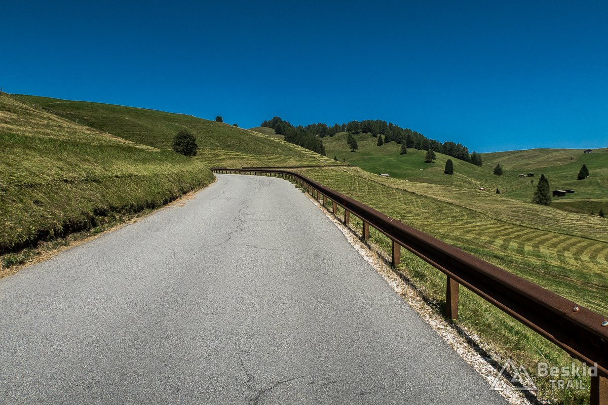 Pokręciłem się trochę po bocznych drogach, robiąc sobie całkiem chilloutową rundkę po  Alpe di Siusi. Do zjazdu wybrałem sobie wariant, którego raczej nie polecam. Co prawda pierwsze kilka kilometrów było całkiem dobre – wąska droga (choć słabej jakości) prowadziła ciasnym kanionem. Gdy po czasie minęła jeden z progów doliny, mocno przybrała na nachyleniu oraz jednocześnie jej nawierzchnia (której czasem brakowało) znacznie się pogorszyła. Niektóre odcinki widać były w trakcie remontu, ale nie wyglądało to na jakieś poważne prace remontowe. Może za kilka lat poprawią trasę, choć w sumie gdyby tak się wydarzyło, to droga byłaby bardziej zatłoczona, a przez to bardzo niebezpieczna (prowadzi bardzo stromym zboczem, niekoniecznie jakkolwiek zabezpieczonym, z kilkoma ostrymi zakrętami).