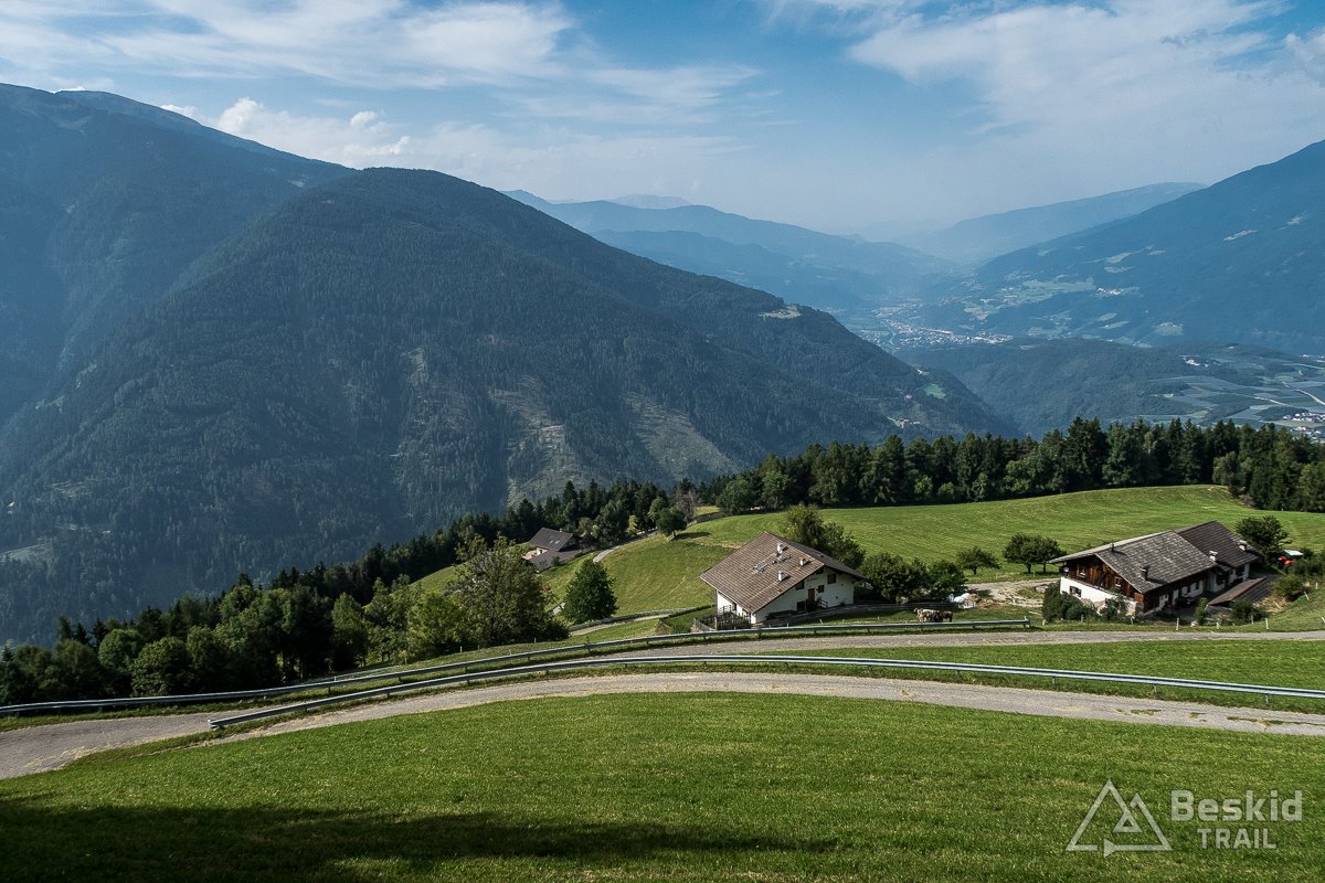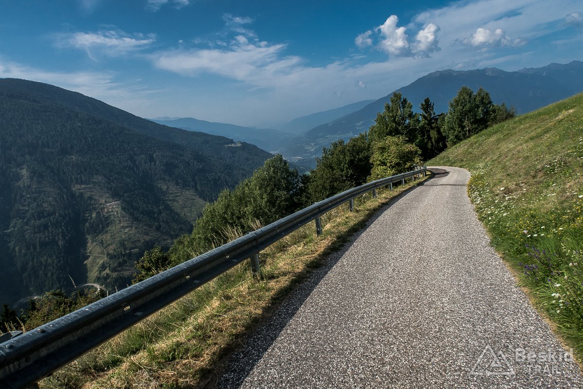 Z parkingu/przełęczy Alpe di Rodengo (ok 1720 m. n.p.m.) zjechałem drugim wariantem pojazdu (u mnie zjazdu). Po drodze miałem jeszcze co prawda kilkadziesiąt metrów dodatkowo do wjechania, ale nie bolały jakoś bardzo. A zjazd – górą – bardzo widokowy! Doprawdy trudno było ciągiem zjechać całość, bo co rusz chciało się zatrzymać i popatrzeć na okolice. Ponadto był to odcinek taki, na którym zdecydowanie musisz mieć dobre hamulce i umieć ich używać. Bardzo szybko nabierało się prędkości, co przy dobrej nawierzchni kusiło do bardziej odważnej jazdy, jednak wybrane fragmenty trasy mogły miejscami mocno zaskoczyć (zakręty, samochody, itp.).