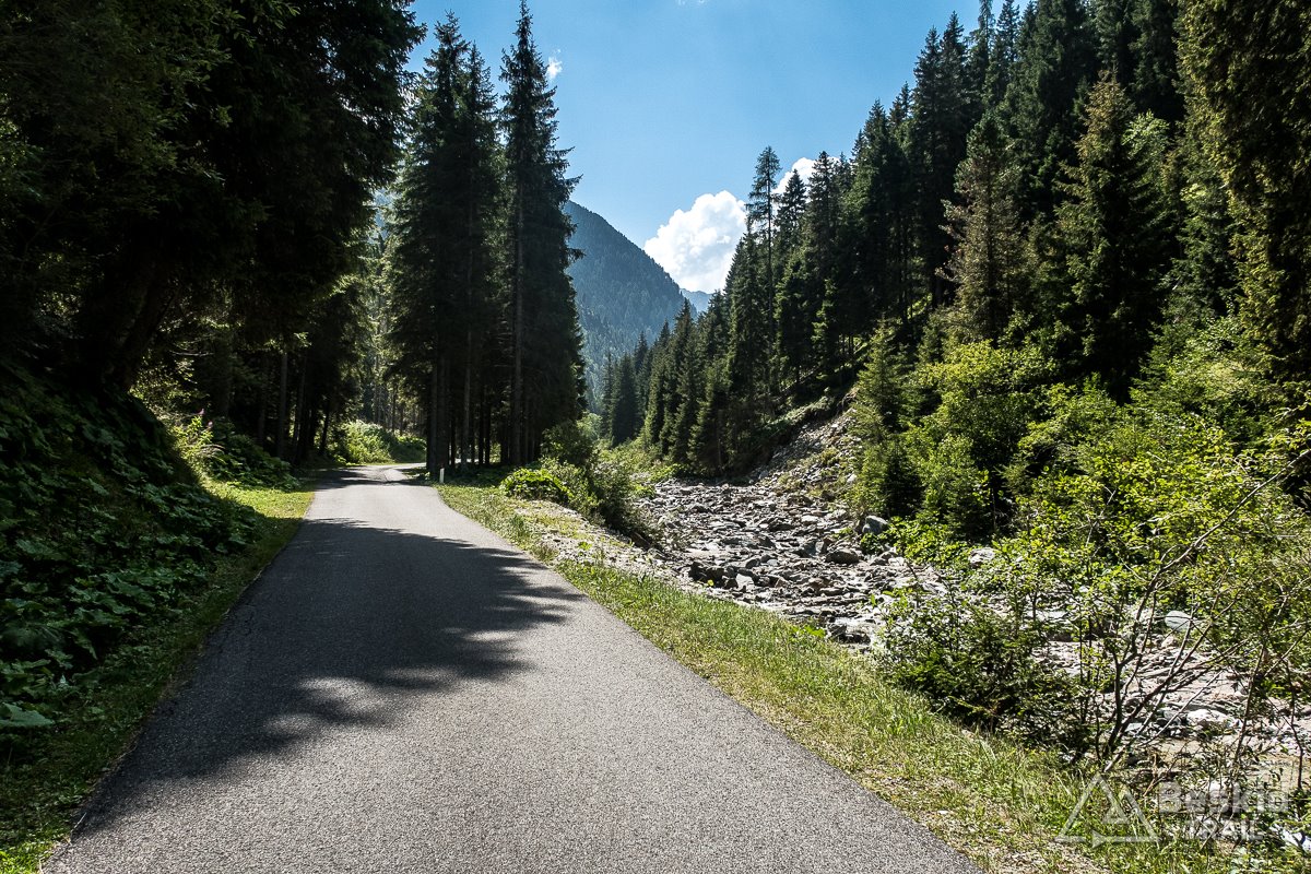 W ciągu doliny Val Luson, droga niemal z każdym metrem się zwężała, a kąt podjazdu jakby rósł, by zatrzymać się na niemal stałych 8-10 %. Widać było, że nie jest to zbyt często uczęszczana trasa, za to miałem okazję niemal samotnie pokonać ją w całości. W międzyczasie minęło mnie może kilka samochodów i tylko kilkunastu rowerzystów jadących w przeciwnym kierunku.