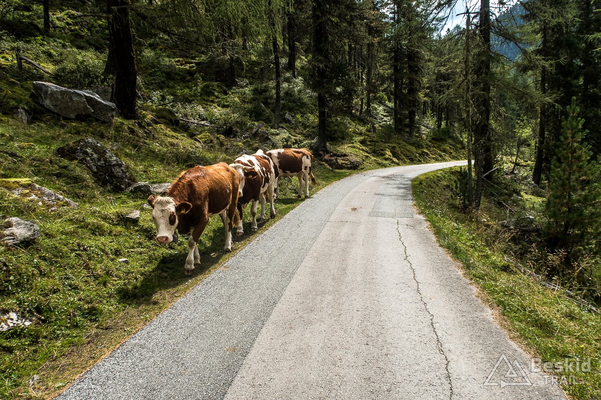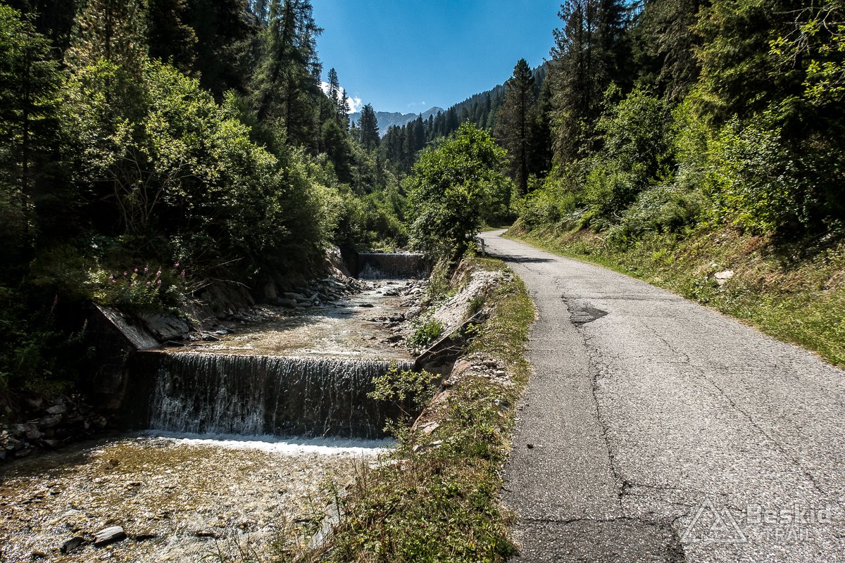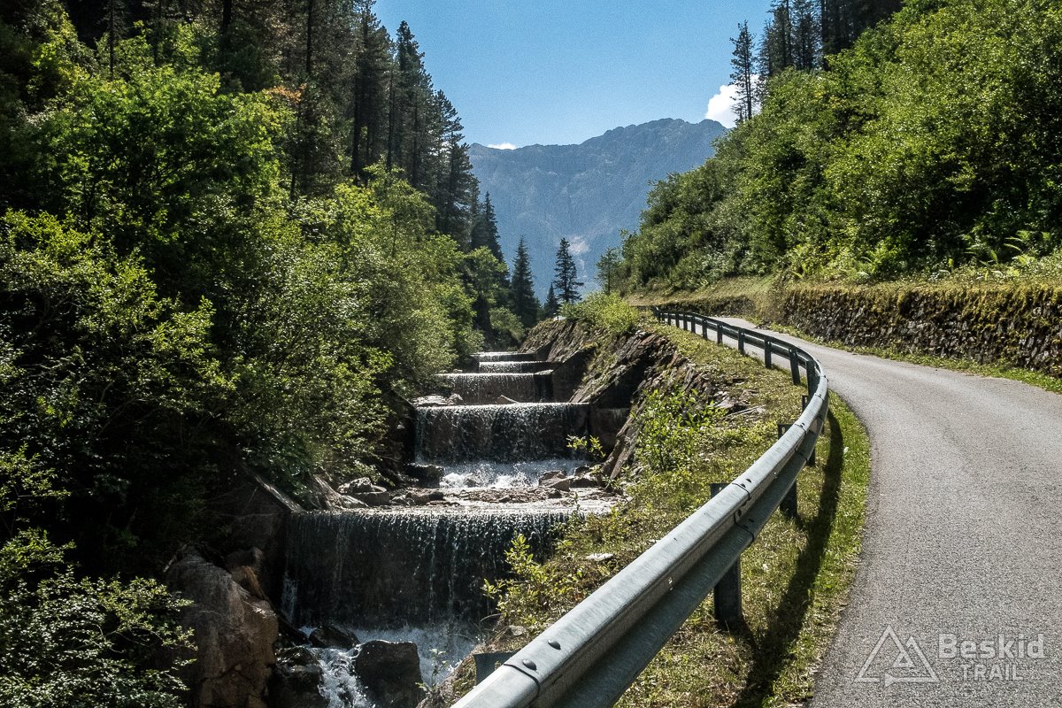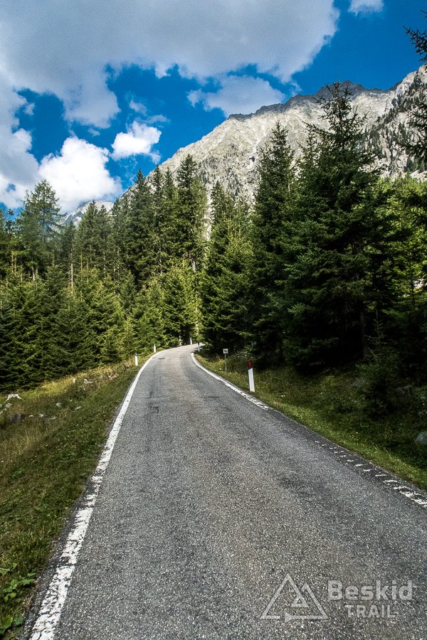 Po tej „rozgrzewce”, po zjechaniu z głównej drogi i przejechaniu wzdłuż potoku w dolinie, zaczęła się przygoda. Niemal od razu podjazd nabrał solidnego kąta, i tak trzymał – z drobnymi wyjątkami – niemal do samego końca. 8-12% trzymało równo, lecz będąc niemal samemu na drodze – bardzo komfortowo zdobywało się kolejne metry; szczególnie że dość szybko udało się wyjechać na bardziej otwartą przestrzeń, dzięki czemu pokonując liczne zakręty, miałem okazję spojrzeć na okoliczne góry z każdej ich strony ;). Podjazd – blisko 800 metrów „na raz” – wszedł o dziwo całkiem przyjaźnie, dzięki czemu na górze – na parkingu Zumis – miałem chwilę dla siebie, by bliżej zapoznać się z okolicą. A można stąd wyjść np. na łatwe wycieczki piesze czy nietrudne mtb. Możliwości jest sporo, a z racji tego, że jesteśmy już na wysokości ponad 1700 m. n.p.m., a okoliczne szczyty są tylko kilkaset metrów wyższe, prowadzą tam wygodne i bardzo widokowe szlaki i ścieżki.