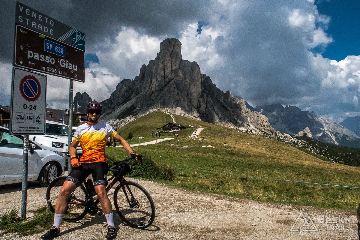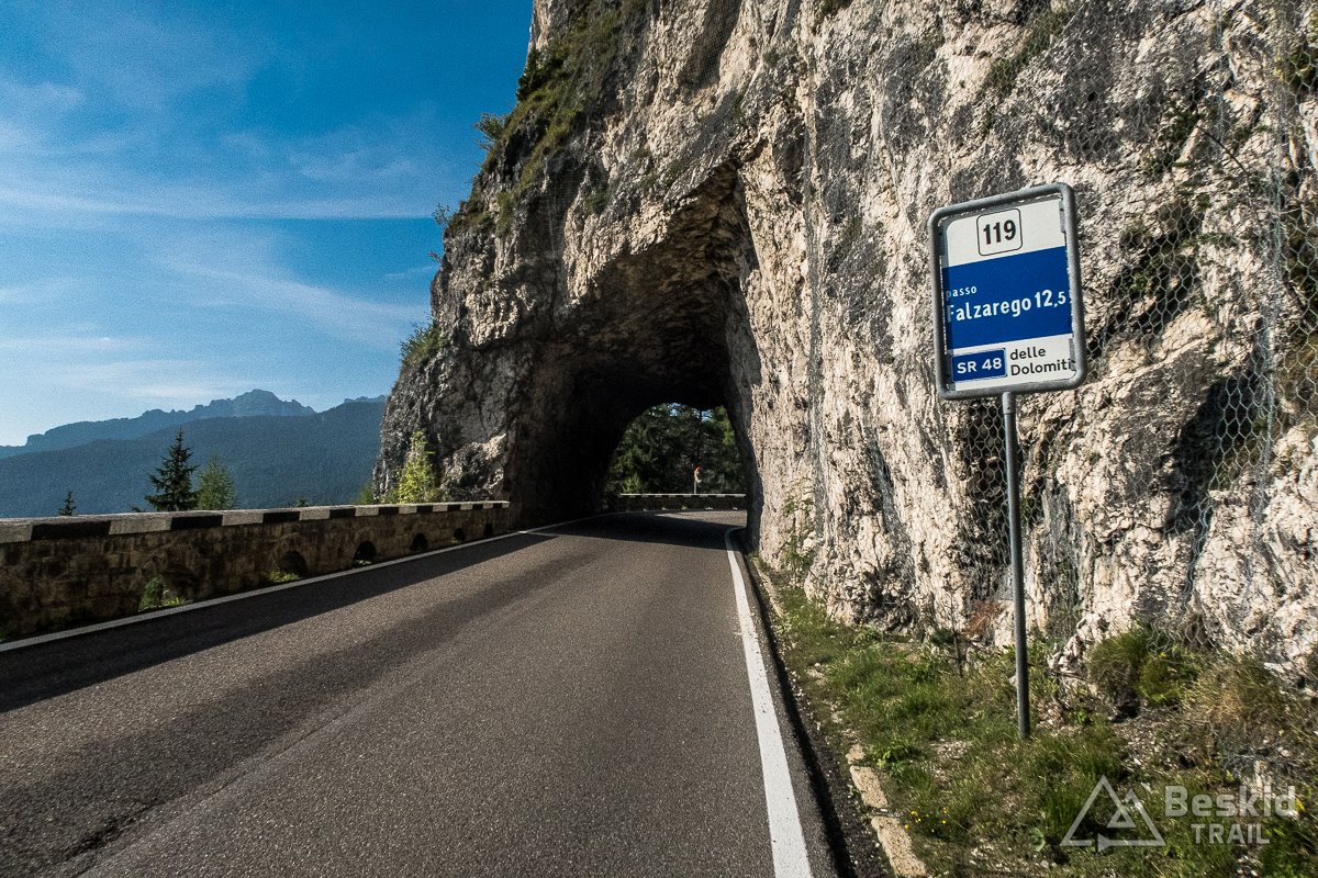 Jadę dalej – opadającym trawersem docieram do  Livinallongo del Col di Lana, gdzie nawet pomimo szybszej jazdy w dół, słońce i temperatura daje się we znaki. Docieram do skrzyżowania, gdzie tabliczki wskazują dwie przełęcze: Passo GiauPasso Falzarego. Dziś jadę na tę drugą, mając z tyłu głowy plan na tę pierwszą, za kilka dni.