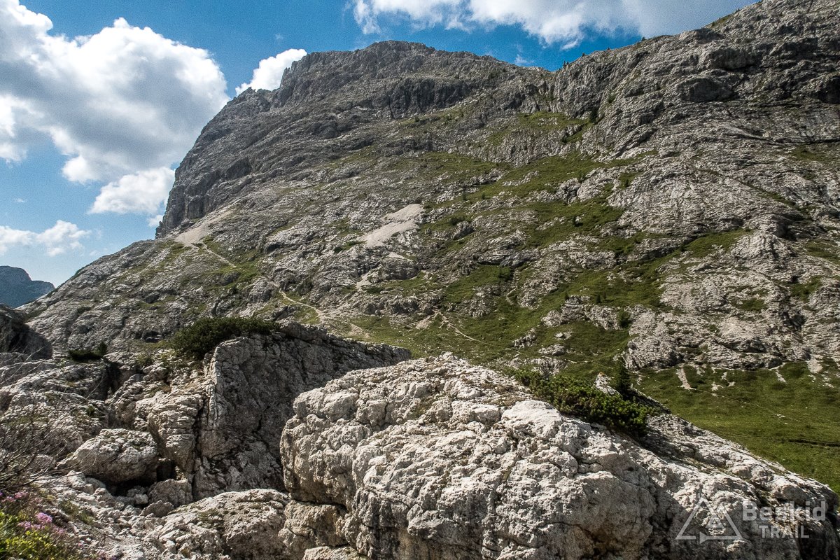 Nogom nawet udało się odpocząć po wczorajszych wojażach, więc podjazd po krótkiej rozgrzewce wchodzi całkiem dobrze. Sam jestem nawet zaskoczony tym, że poniżej zakładanego czasu udaje się wjechać na Passo Falzarego (2105 m. n.p.m.), więc tym chętniej dokłam sobie jeszcze raz, podczas tego wyjazdu, wjechanie na Passo di Valparola (2168 m. n.p.m.). Chyba udało mi się odczarować tę przełęcz, ponieważ gdy pierwszy raz na nią wjeżdżaliśmy z Olą, przywitała nas solidną zlewą z burzą. A teraz i przez minione razy, bywało już znacznie lepiej.