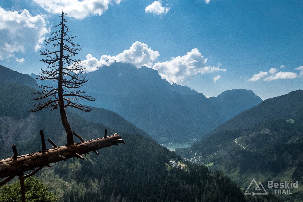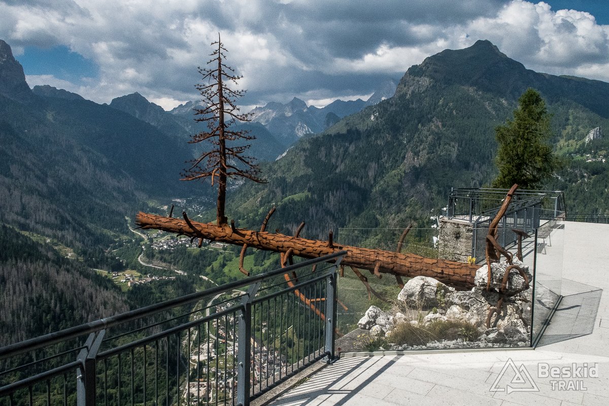 Na górze było ogólnie dość rześko, więc nie spędziłem na przełęczach jakoś więcej czasu, stąd od razu zacząłem zjazd na południe, w kierunku Caprile, by na koniec trawersującego odcinka drogi, skręcić z niej do Colle Santa Lucia. Miałem przed są krótki podjazd, do punktu widokowego, który powstał kilka lat temu, a upamiętnia nawałnicę, jaka nawiedziła okolicę, powalając przy tym tysiące drzew.