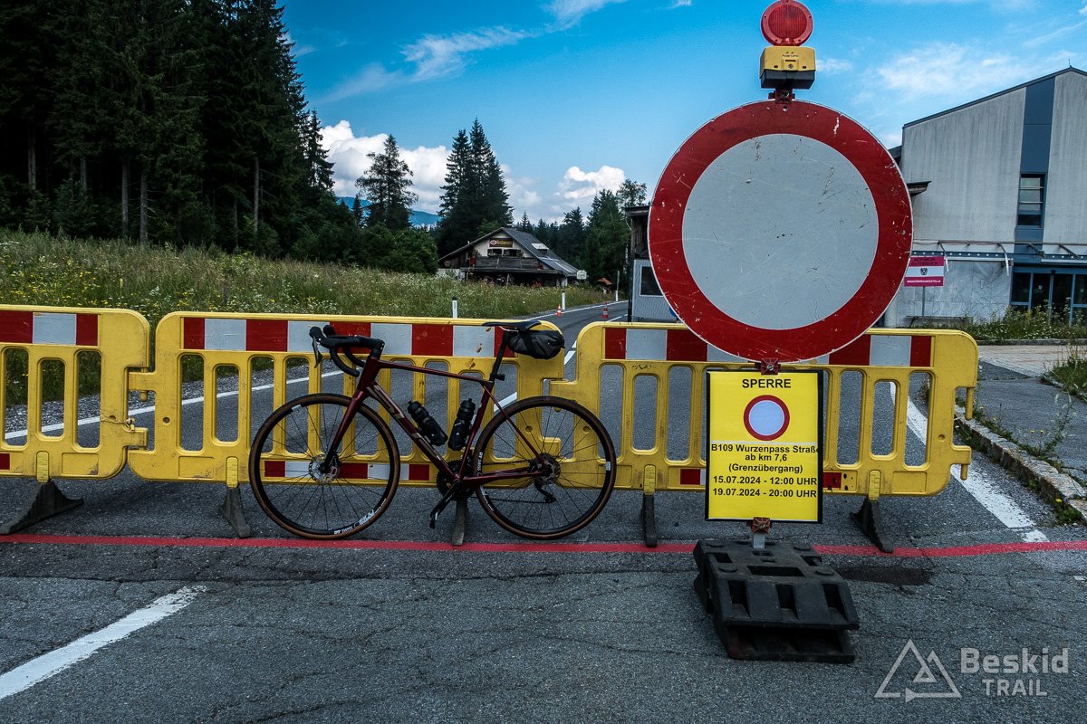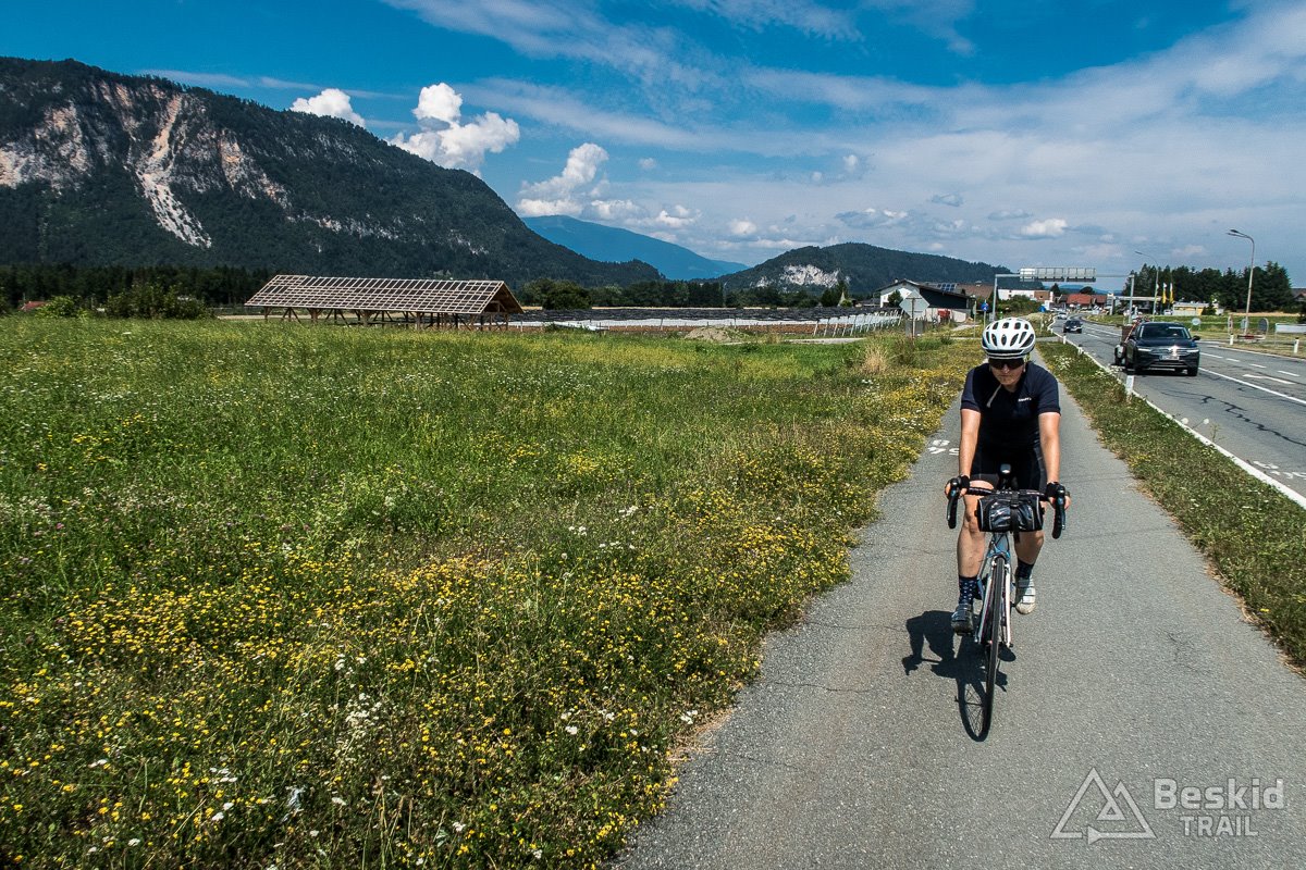 Dzień #2: Tarvisio – Villach – 80 km / 1100 m upNastępną trasą „dojazdową” do zasadniczej części urlopowych planów była, w zamierzeniu, łatwa i przyjemna pętla z Tarvisio do Villach, przez przełęcz Korensko sedlo / Wurzenpaß (1072 m n.p.m.). Po drodze zahaczyliśmy jeszcze o malowniczą dolinę z dwoma jeziorami Lago di Fusine, położonymi pod ścianami jednego z bardziej znanych szczytów Alp Julijskich – Mangartu (pod który nota bene można wjechać rowerem). I o ile część trasy włosko-słoweńskiej przebiegła nam bardzo sprawnie, o tyle na granicy SI/AT zostaliśmy zaskoczeni zamknięciem drogi, biegnącej do Villach, poniżej przełęczy, . Policjant wskazał na prowadzony remont drogi, jednocześnie mówiąc, że boczną drogą w lesie może udać nam się przejechać. Nie końca jednak było to zgodne z prawdą, i nie wgłębiając się w szczegóły, zaliczyliśmy najbardziej gravelowy zjazd w życiu, dodatkowo wzbogacony na koniec przejazdem po świeżo kładzionym lepiku, a potem asfalcie, przy głośnej aprobacie pracujących drogowców ;). Nasze opony po tym odcinku same chciały wyrzucić się do kosza… Przez wiele kolejnych kilometrów trwało zrzucanie tego, co się nam poprzylepiało. Na szczęście – na koniec dnia, było już względnie dobrze, a opony aż tak mocno – jak zdawało się na początku – nie ucierpiały.