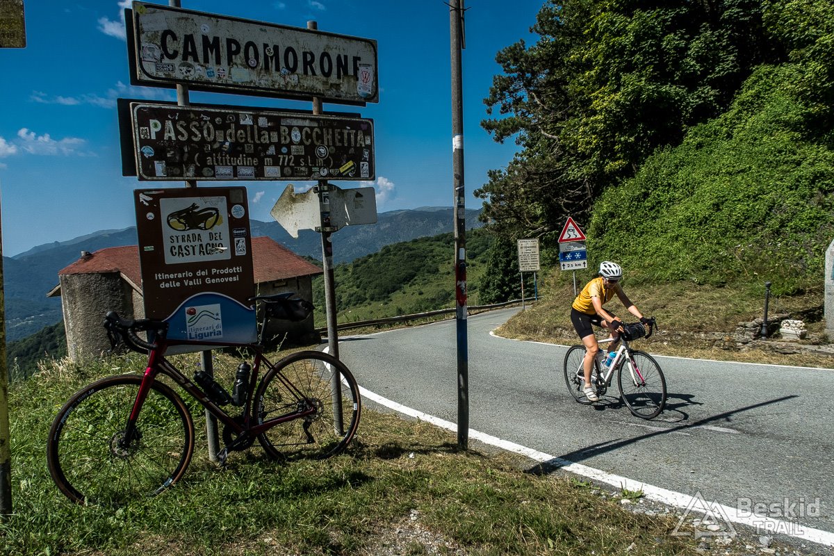 Trzeci podjazd – na Passo del Bocco (956 m n.p.m.), nawet już pomijając zmęczenie i skwar, był najtrudniejszy tego dnia. Szczególnie ostatnie trzy kilometry trzymały nachylenie do samego końca. Druga połowa podjazdu, to oczywiście także coraz lepsze widoki, które bez wątpienia były najrozleglejsze tego dnia i w zupełności warte były trudów podjazdu. Na przełęczy obiecaliśmy sobie solidny obiad wiedząc, że później czeka nas już tylko zjazd. Trochę się zawiedliśmy, bo oferta gastronomiczna okazała się dość skromna, lecz mimo to udało się zjeść jakieś smażone mięso i frytki, które z bąbelkami smakowały wyśmienicie. Sam bar prowadzony jest za to przez bardzo międzynarodową i ciekawą ekipę.
