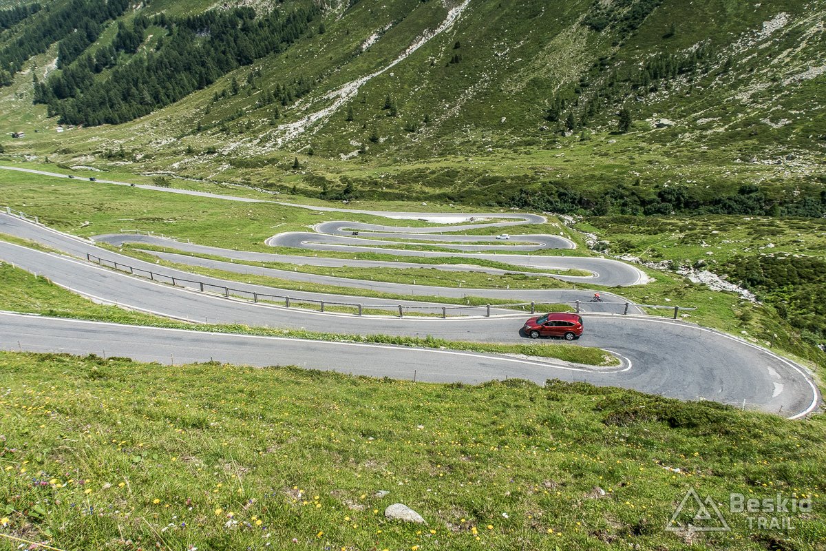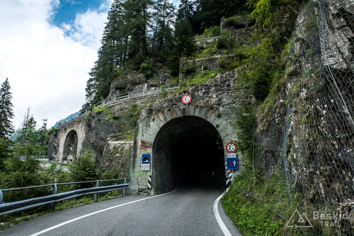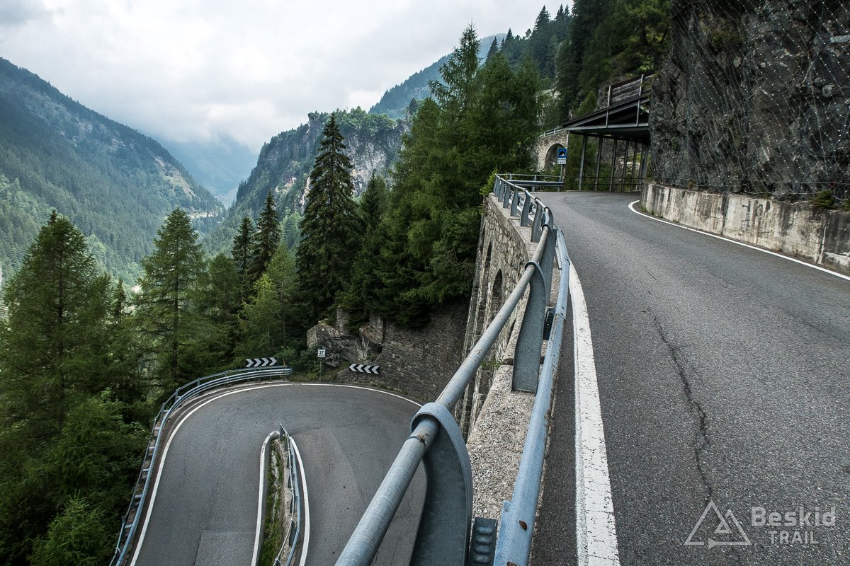 W trakcie przejazdu jedzie się przez kilkadziesiąt serpentyn, a mniej więcej na wysokości 1450-1600 m n.p.n. inżynieria drogowa dokonała niemalże cudu, wdzierając się drogą w zbocze licznymi tunelami, galeriami i zawieszonymi nad przepaścią fragmentami, oczywiście nie zapominając przy tym o zakrętach nierzadko większych niż 180 st. Tak wyjątkowych i skomplikowanych dróg w Alpach jest doprawdy niewiele, a niech smaku doda fakt, że wspomniany odcinek jest tak ciasno skradziony górom, że większe samochody nie mają tam czego szukać. Owszem, niewielki kamper czy bus przejedzie, lecz czeka go doprawdy męka (Stelvio przy tym to pryszcz 😉 ).