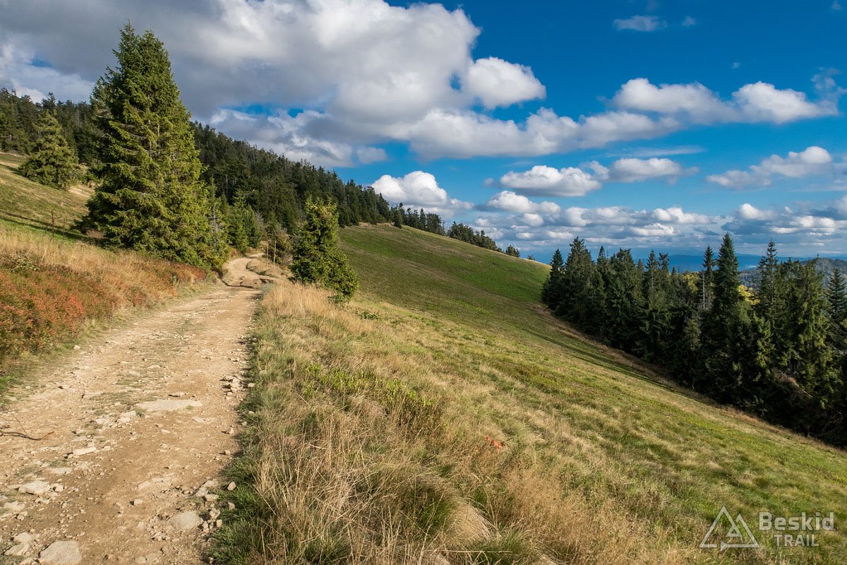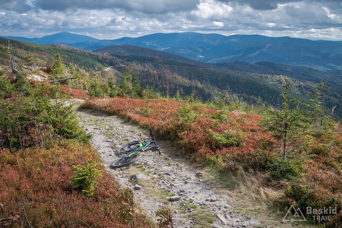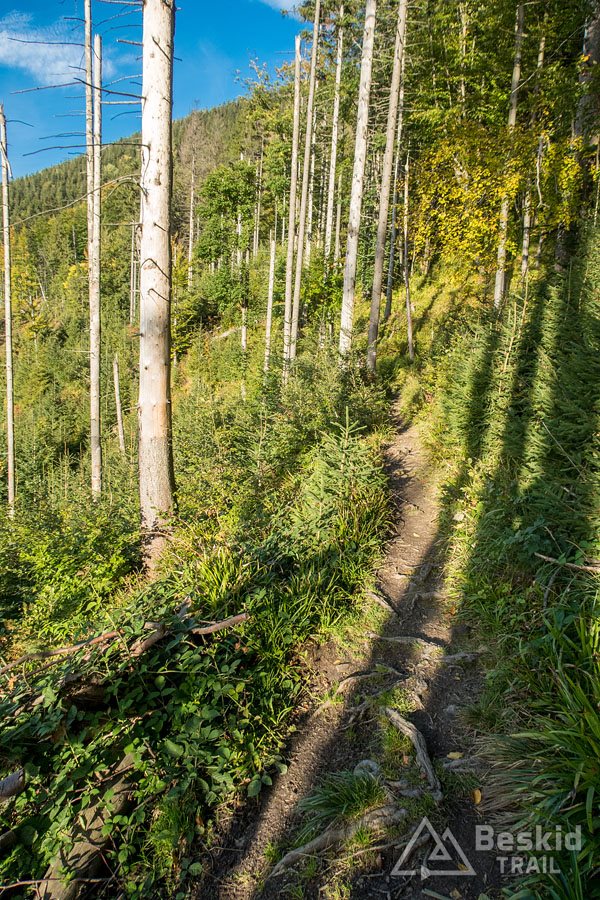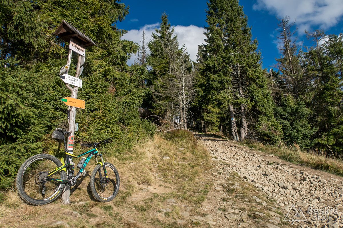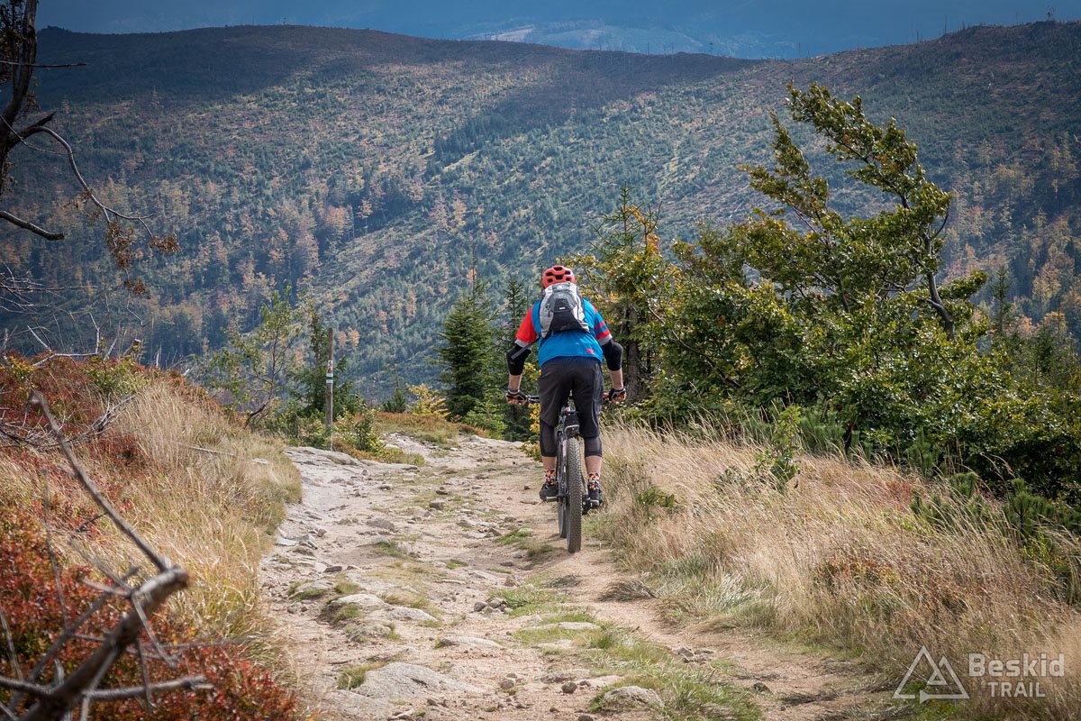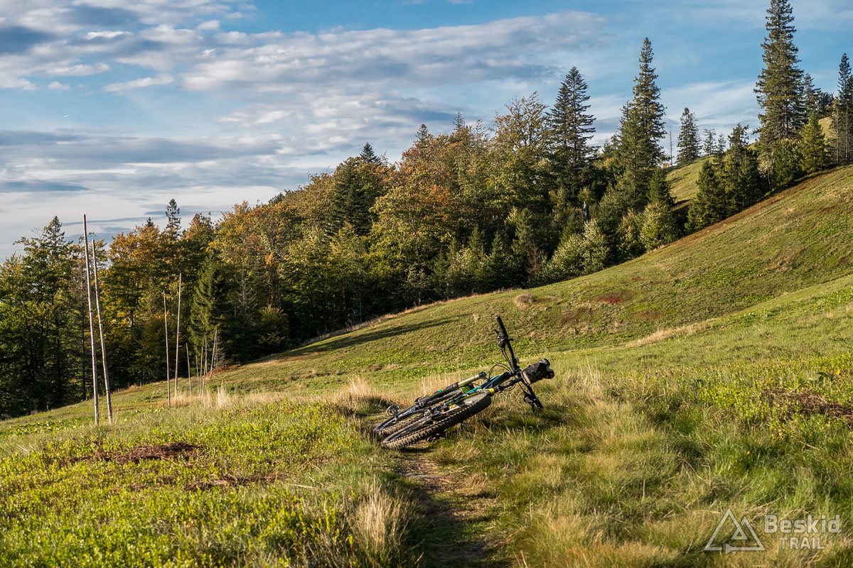 Na Magurce Wiślańskiej łapię czerwony szlak i zjeżdżam nim przez Halę Radziechowską i Glinne do Węgierskiej Górki. Bardzo lubię ten zjazd i zawsze z przyjemnością nim jadę – bardzo urozmaicony na całej swojej długości.
