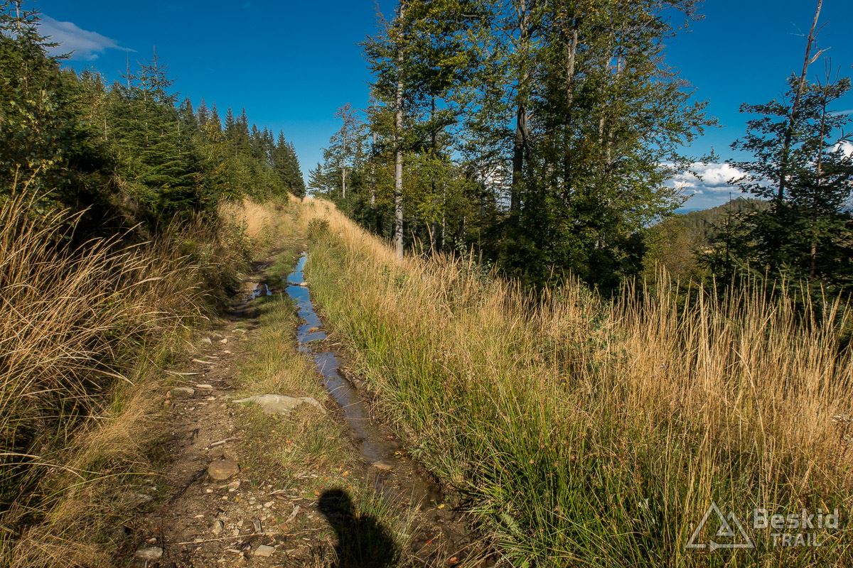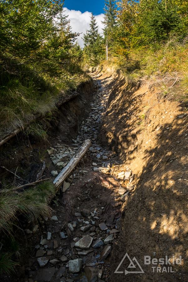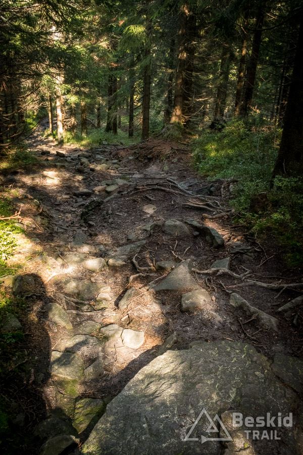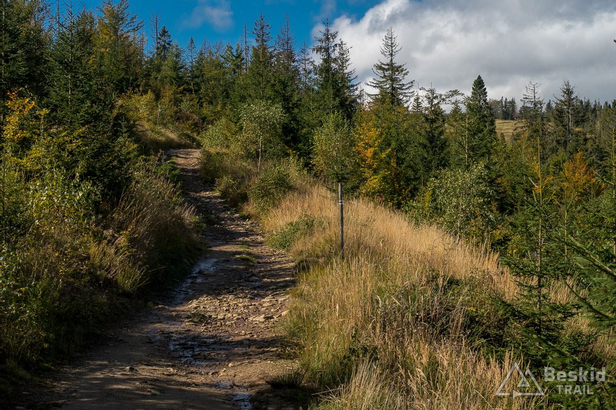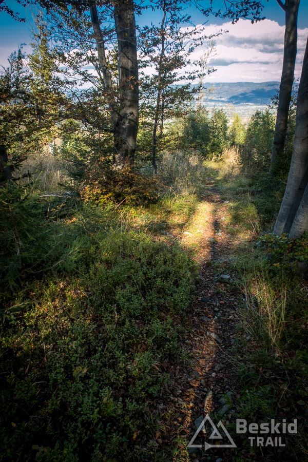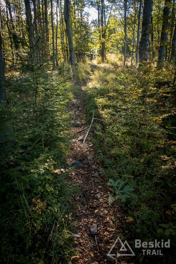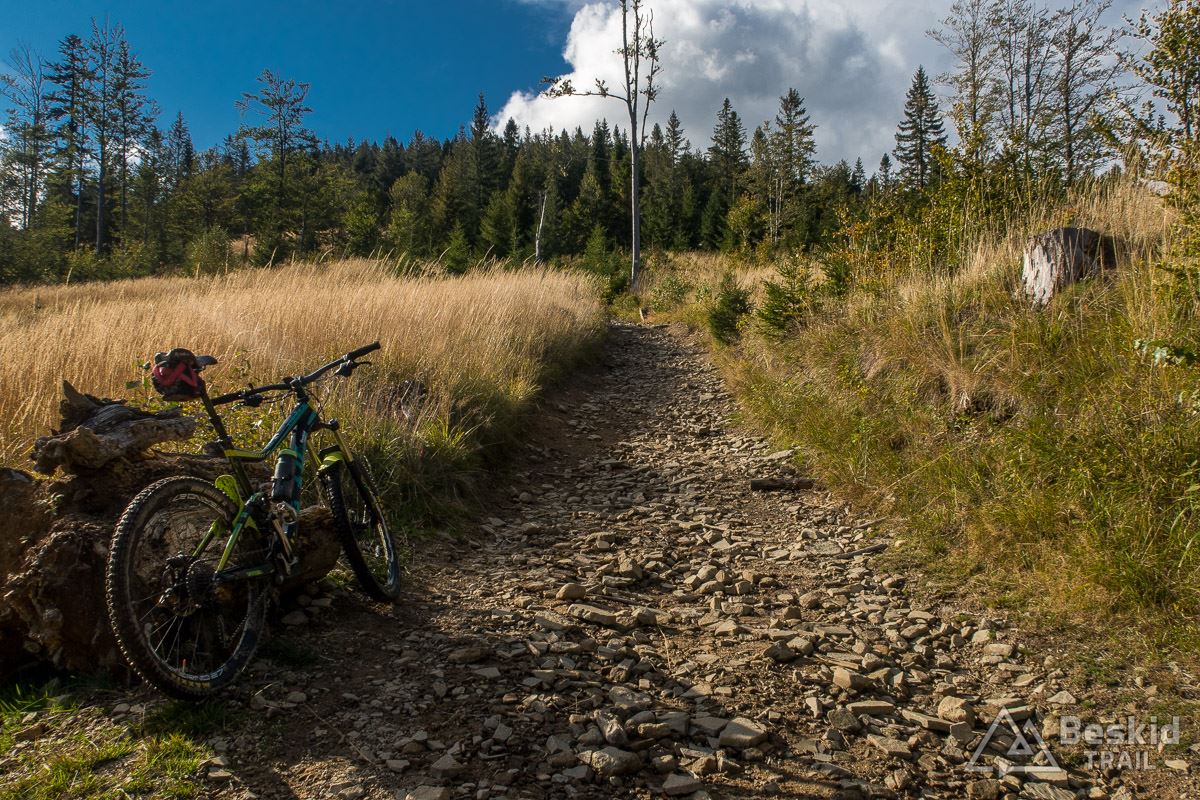 Z Magurki Radziechowskiej zjeżdżam początkowo zielonym szlakiem. Jego górny odcinek zdecydowanie jest charakterny, oj tak! Później nieco łagodnieje, ale wciąż wymaga uwagi. Warto! Odbijam nieco z niego, łatwo zdobywając Murońkę, by zdecydowanie niełatwą singlową ścieżką, stromo opadającą pośród borówek, zjechać do szlaku. Mała rzecz, a cieszy :).