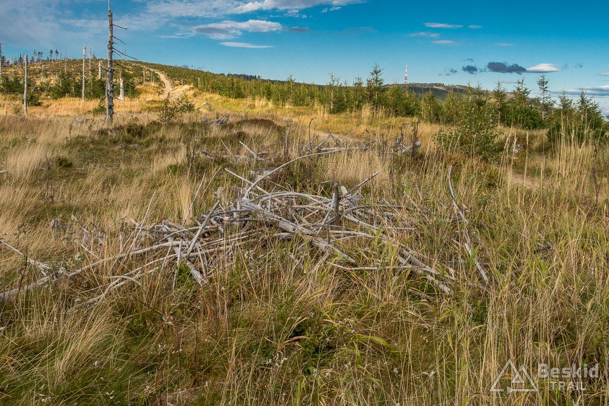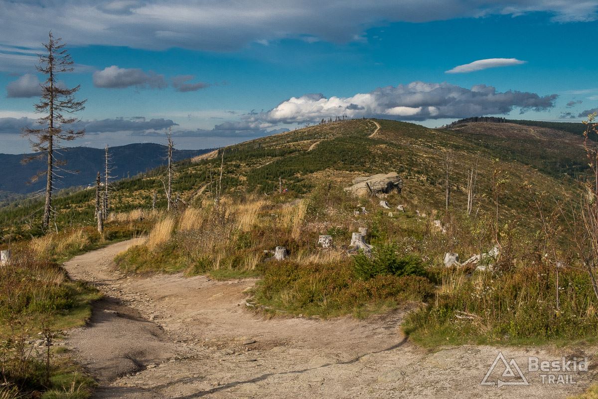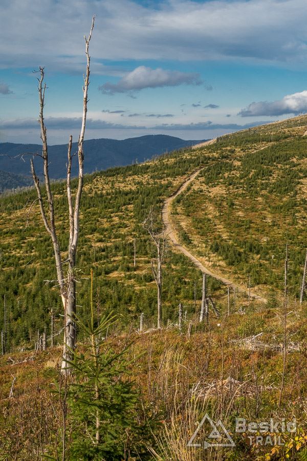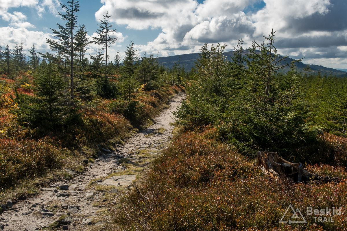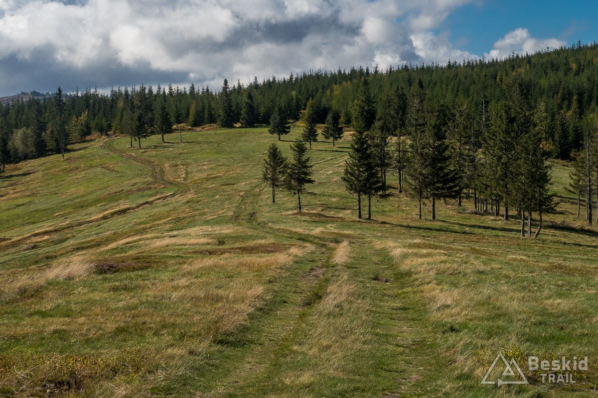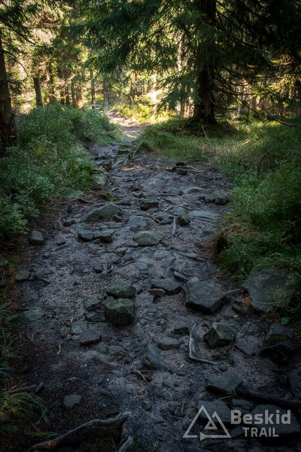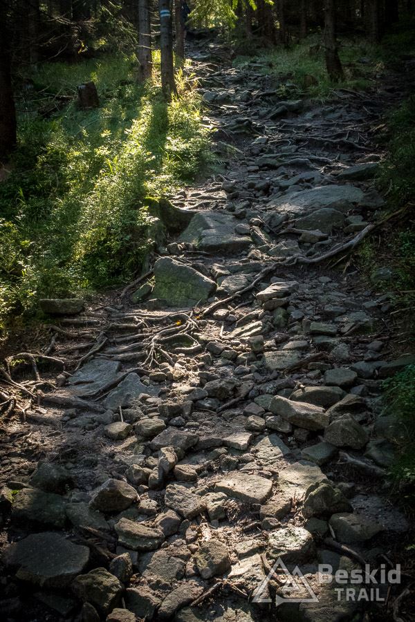 Z Magurki Radziechowskiej zjeżdżam początkowo zielonym szlakiem. Jego górny odcinek zdecydowanie jest charakterny, oj tak! Później nieco łagodnieje, ale wciąż wymaga uwagi. Warto! Odbijam nieco z niego, łatwo zdobywając Murońkę, by zdecydowanie niełatwą singlową ścieżką, stromo opadającą pośród borówek, zjechać do szlaku. Mała rzecz, a cieszy :).