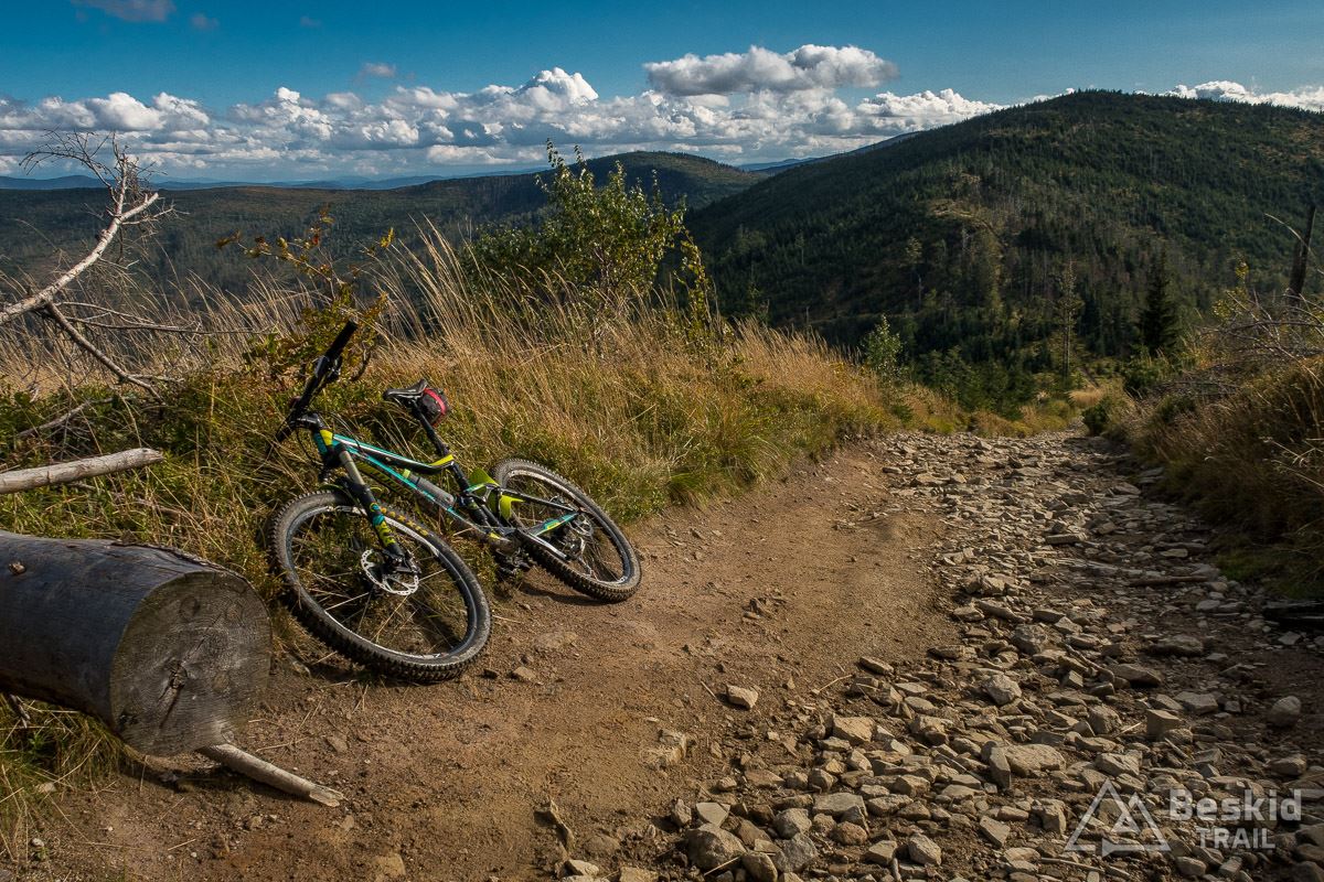 Późniejszy przejazd na Skrzyczne to już niemal formalność. Przyjemnie, bez większego wysiłku, za to z fantastycznymi widokami wokoło. Po dotarciu do schroniska, grzeję się nieco ciepłą kawą i postanawiam zjechać do Doliny Zimnika niebieskim szlakiem – tym razem z samej góry. Górny odcinek, po minięciu stokówki, jest zdecydowanie najbardziej wymagający i bez wątpienia luźne, większe kamienie nie pomagają w zjeździe. Czasem omijam ten fragment, dołączając do szlaku na drugim zakręcie szutrówki, którą też można zjechać do Doliny Zimnika. Dziś jednak chciałem zjechać prawilnie całość :).