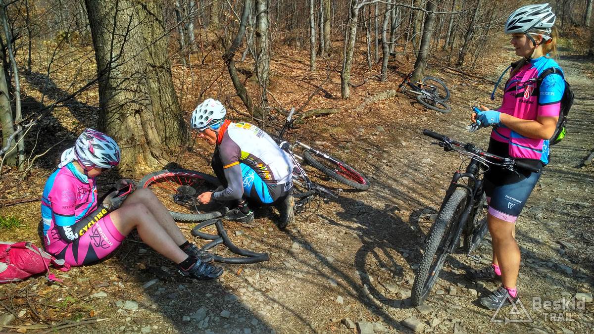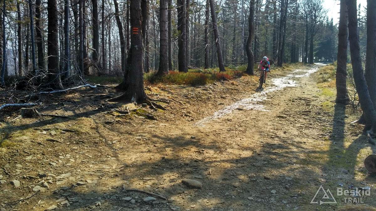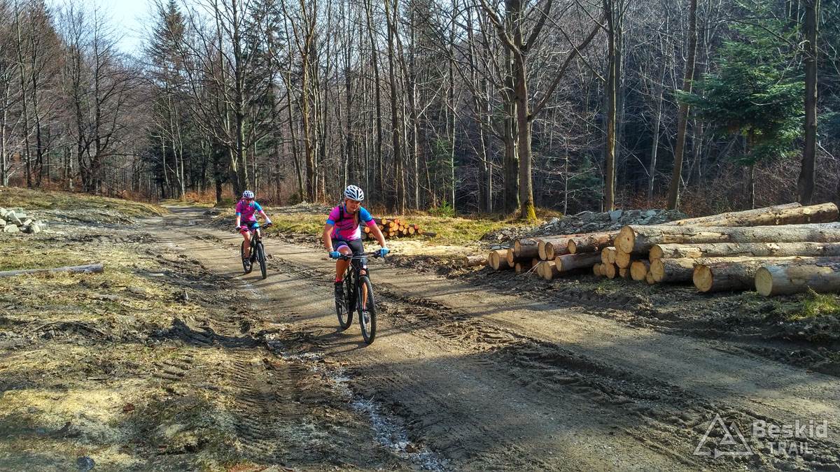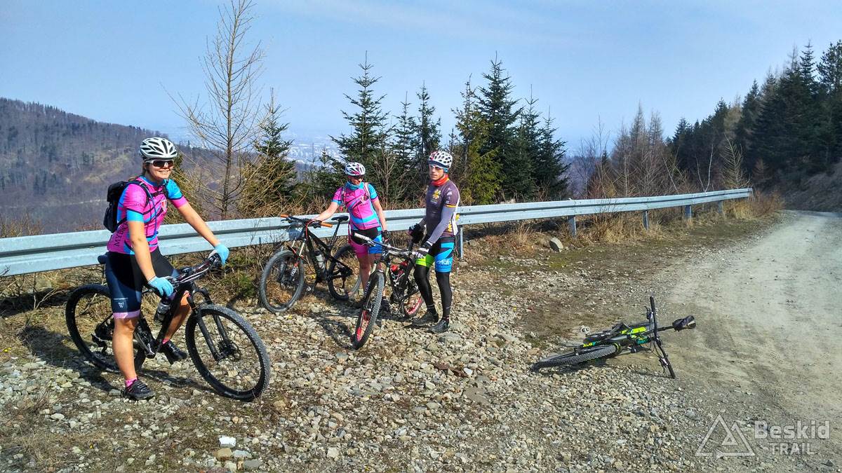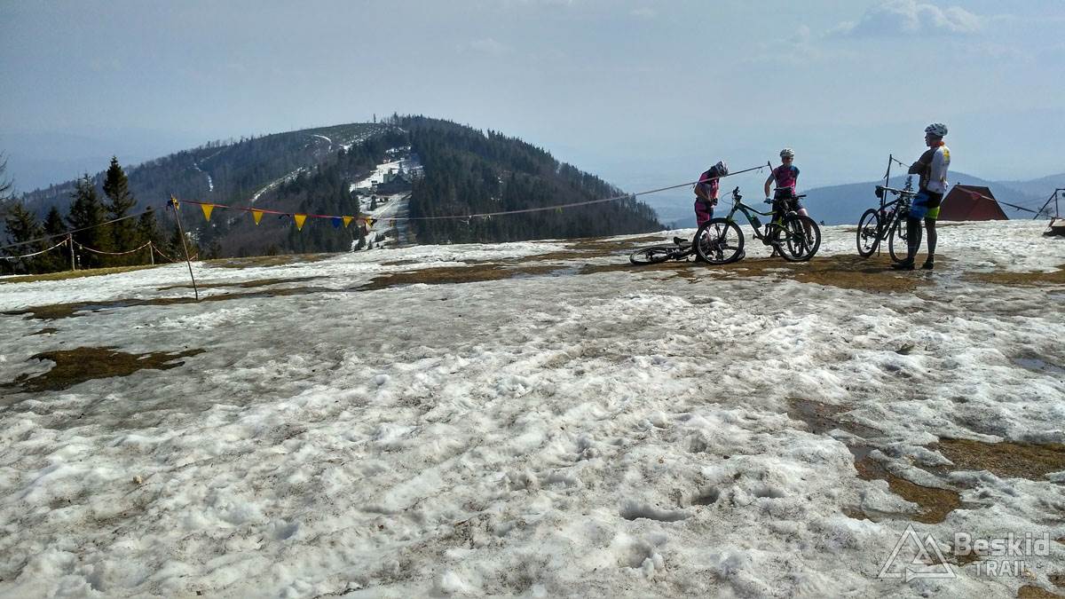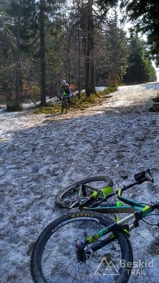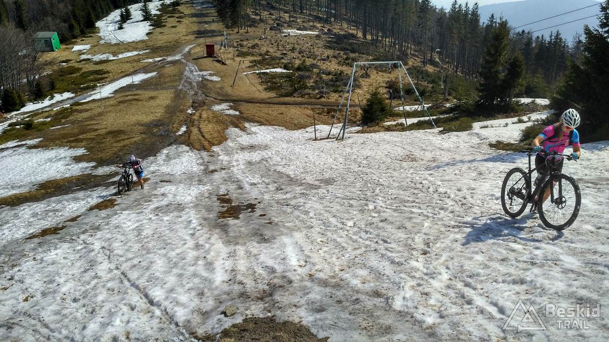 Wystartowaliśmy tego dnia z Bystrej Śląskiej, by szutrówkami stopniowo objechać zbocza Szyndzielni i przetrawersować Magurę. Nad Szczyrkiem wbiliśmy się na zielony szlak, którym już do końca wjechaliśmy do schroniska na Klimczoku. Tu okazało się, że stok wiodący na wierzchołek wciąż jest w śniegu, a trawers w kierunku Szyndzielni jeszcze dodatkowo dośnieżony… Wybraliśmy więc wariant podejściowy na szczyt, z nadzieją, że zjazd grzbietem będzie już „czysty”. Na górze okazało się, że nasze nadzieje złudnymi były… Na szczęście zjazd był stosunkowo przyjazdy, ponieważ śnieg był w wielu miejscach dość zbity, byśmy mogli po nim jako tako zjechać. Dopiero po dojechaniu do odbicia szlaku na w kierunku siodła pod Klimczokiem, szlak był prawie że bez śniegu.