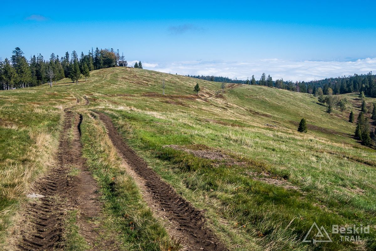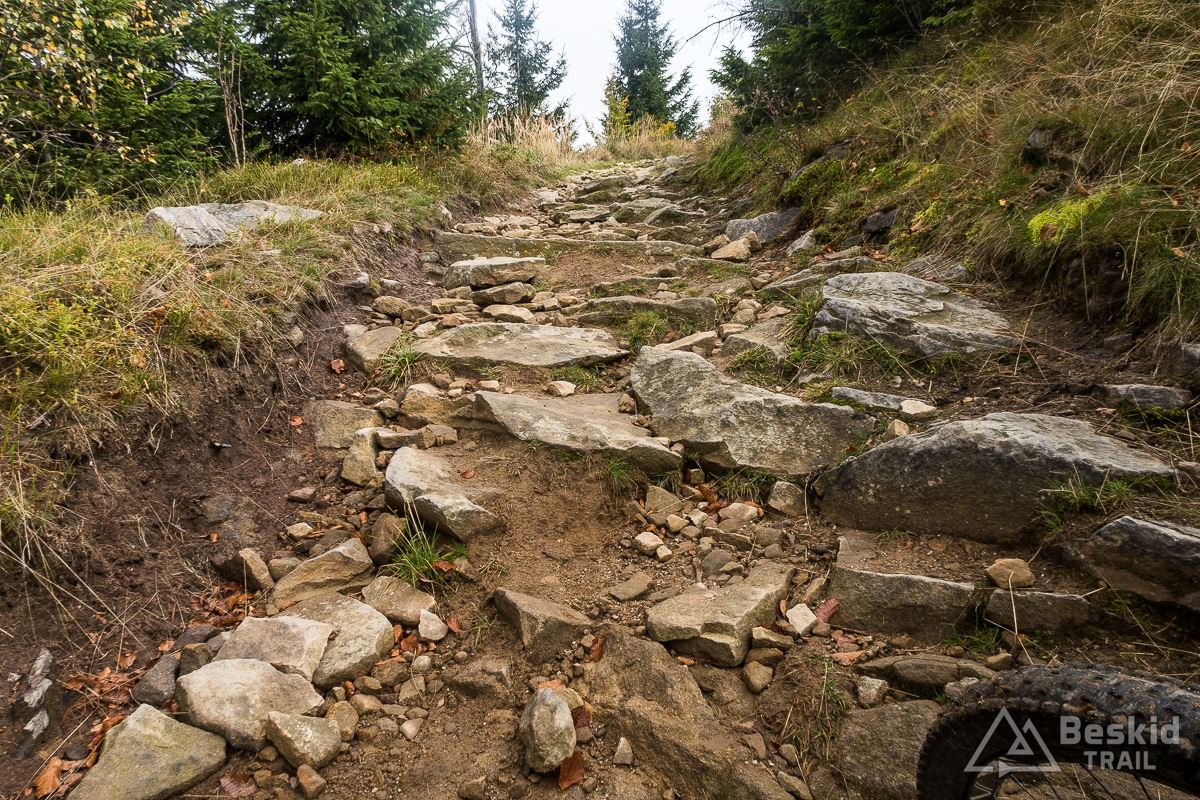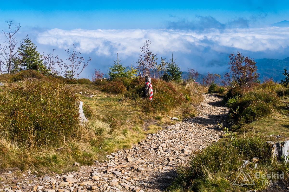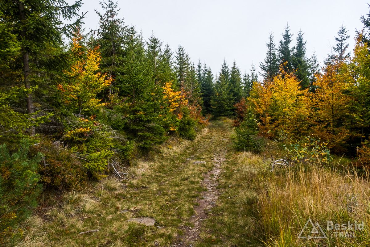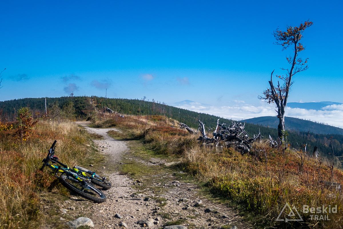 Górną szutrówką trawersuję Glinne, i korzystając z leśnego łącznika – wjeżdżam na Halę Radziechowską. Dalej już wygodnie, kontynuuję przejazd czerwonym szlakiem, kolejno wjeżdżając na Magurkę Radziechowską, Magurkę Wiślańską oraz… Baranią Górę. Pierwotnie celowo chciałem ją pominąć, jadąc tylko na Halę Baranią, ale bliskość szczytu i atrakcyjność zjazdu z niego, skusiła mnie do jego zdobycia. Co prawda wymagało to kilkuset metrów (w poziomie) pchania roweru, ale zjazd czerwonym szlakiem na północ, zdecydowanie jest tego wart.