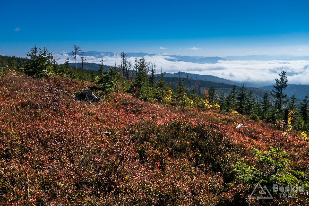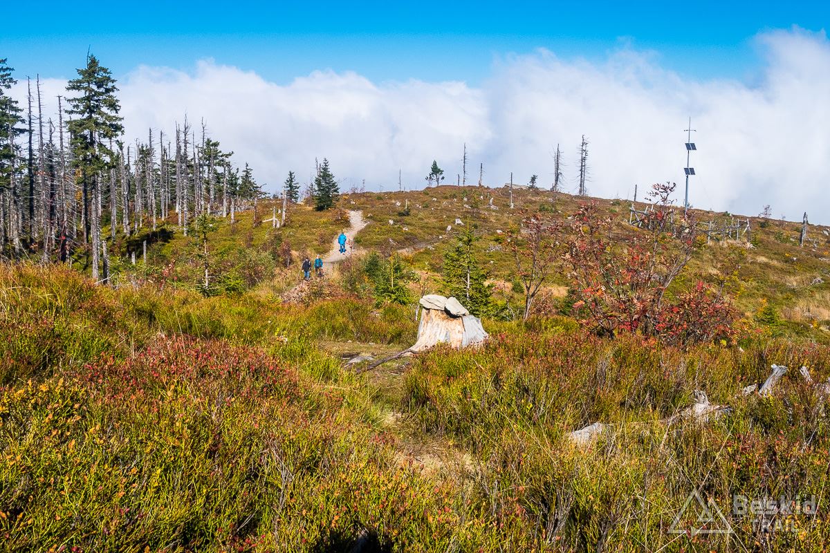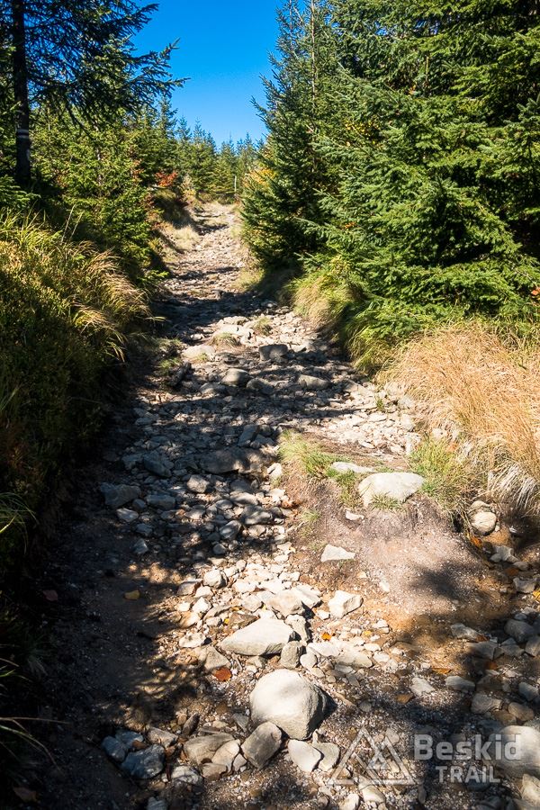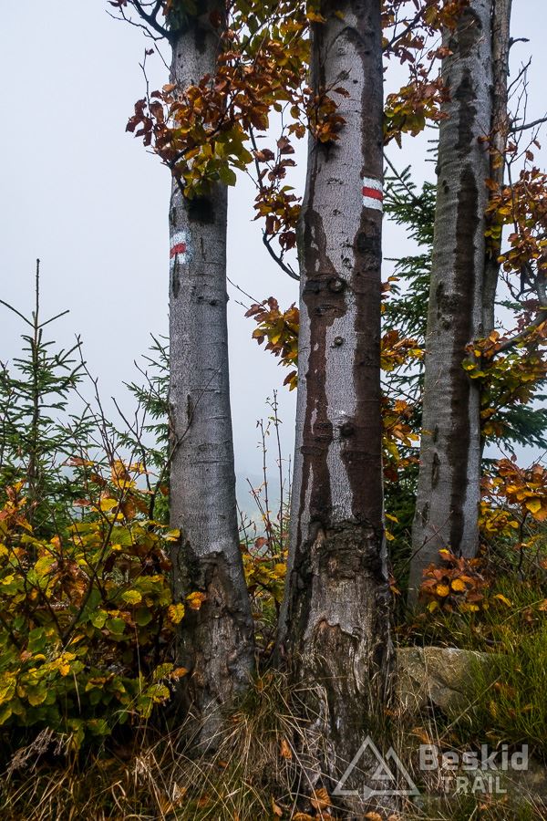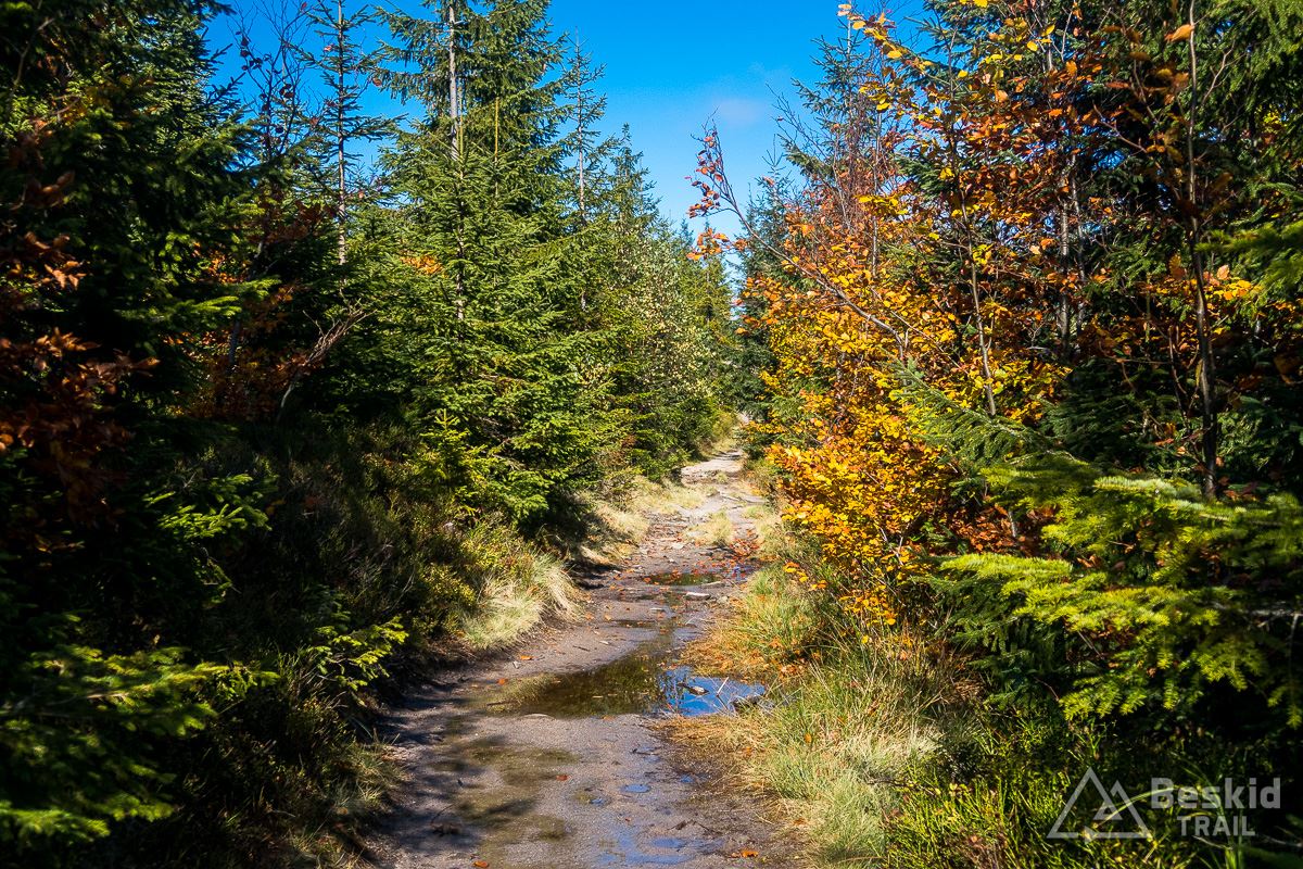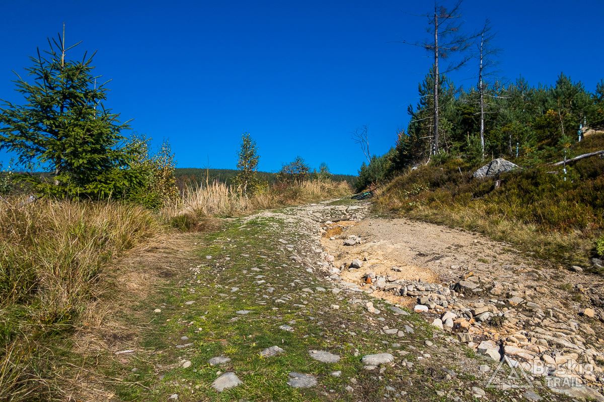 Górną szutrówką trawersuję Glinne, i korzystając z leśnego łącznika – wjeżdżam na Halę Radziechowską. Dalej już wygodnie, kontynuuję przejazd czerwonym szlakiem, kolejno wjeżdżając na Magurkę Radziechowską, Magurkę Wiślańską oraz… Baranią Górę. Pierwotnie celowo chciałem ją pominąć, jadąc tylko na Halę Baranią, ale bliskość szczytu i atrakcyjność zjazdu z niego, skusiła mnie do jego zdobycia. Co prawda wymagało to kilkuset metrów (w poziomie) pchania roweru, ale zjazd czerwonym szlakiem na północ, zdecydowanie jest tego wart.