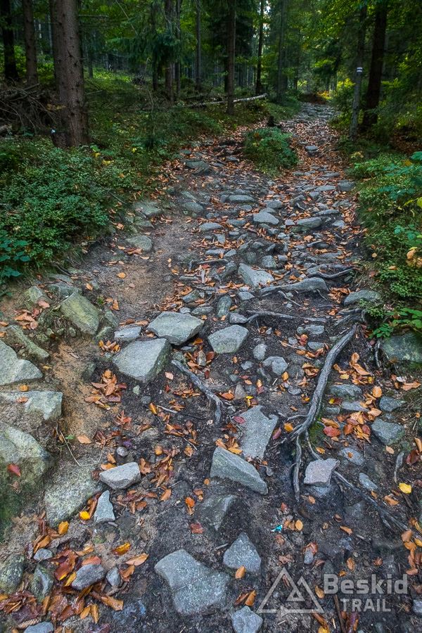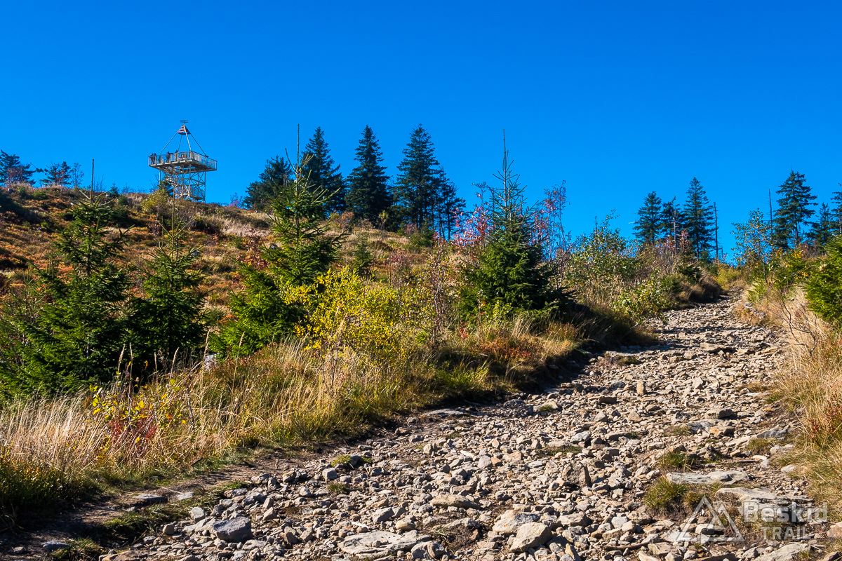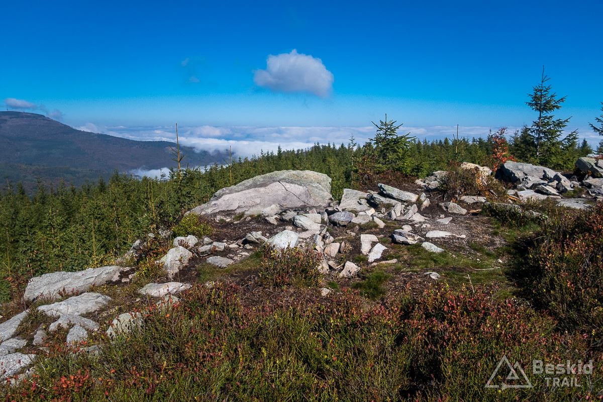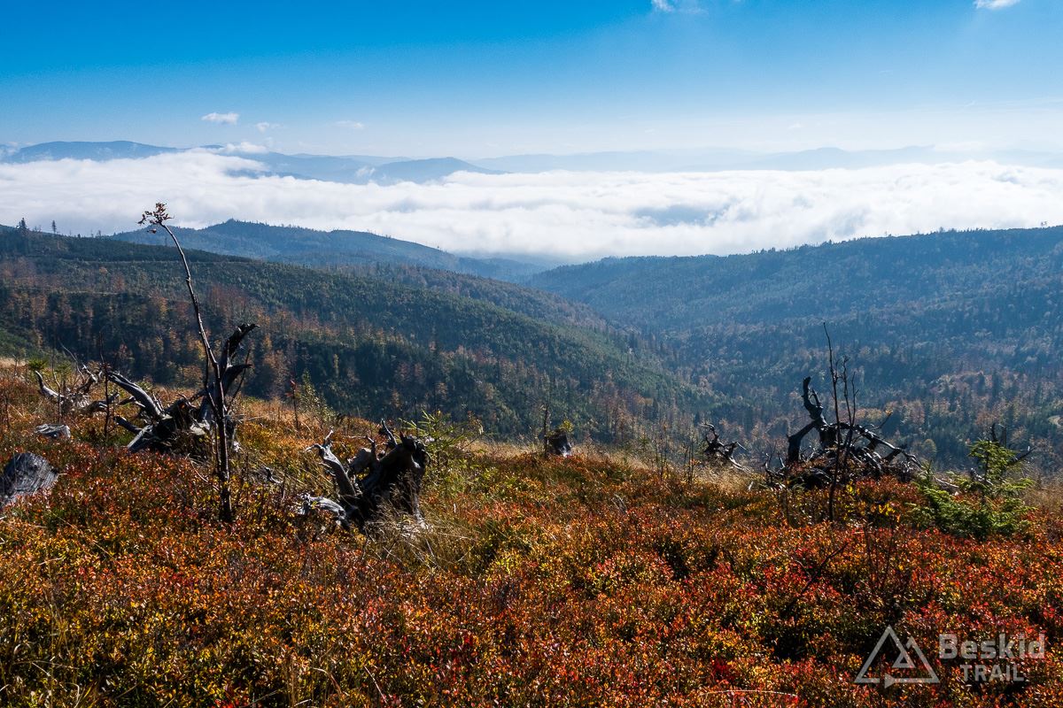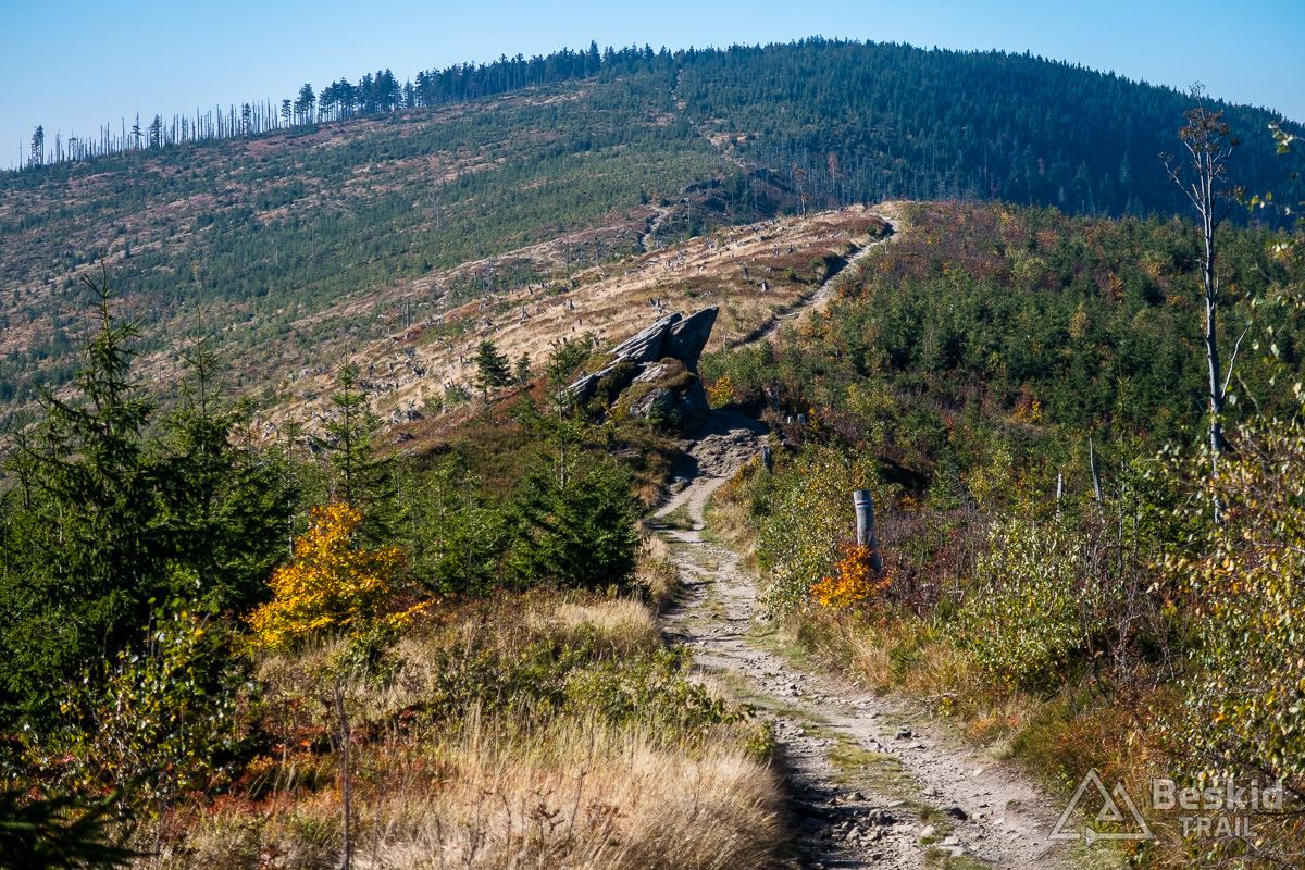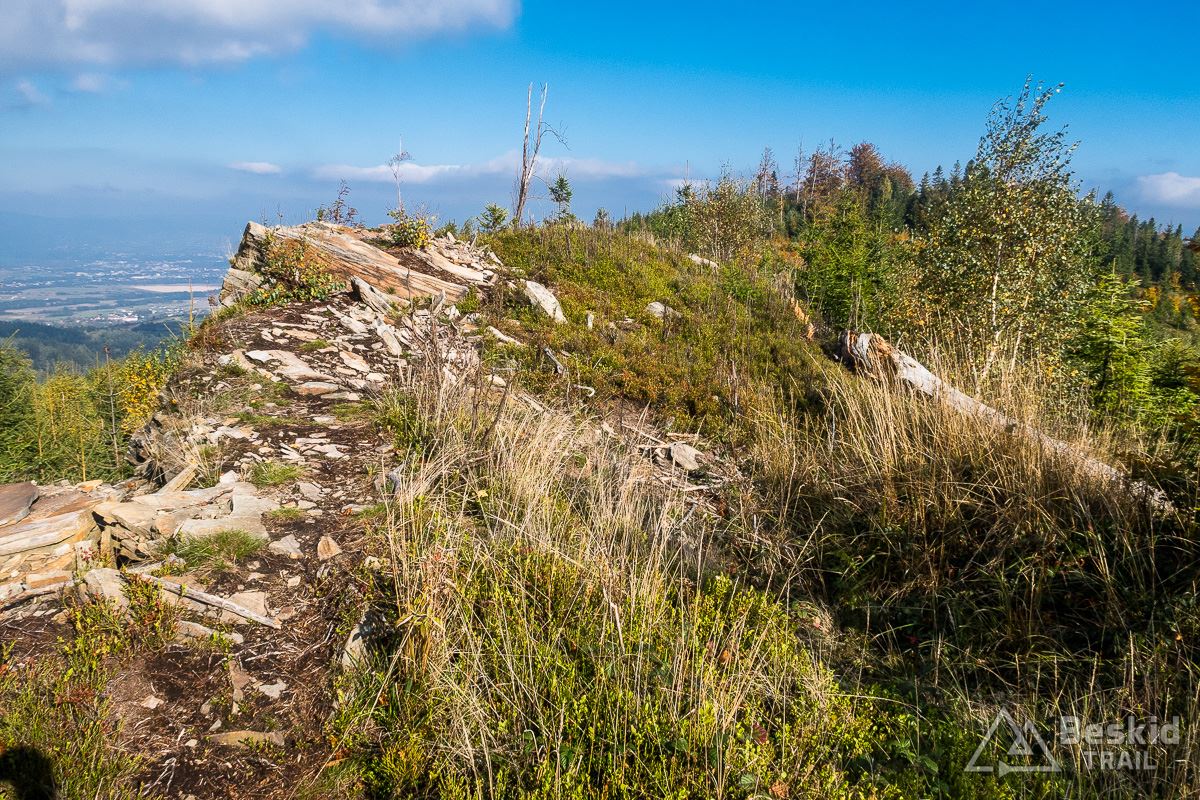 Górną szutrówką trawersuję Glinne, i korzystając z leśnego łącznika – wjeżdżam na Halę Radziechowską. Dalej już wygodnie, kontynuuję przejazd czerwonym szlakiem, kolejno wjeżdżając na Magurkę Radziechowską, Magurkę Wiślańską oraz… Baranią Górę. Pierwotnie celowo chciałem ją pominąć, jadąc tylko na Halę Baranią, ale bliskość szczytu i atrakcyjność zjazdu z niego, skusiła mnie do jego zdobycia. Co prawda wymagało to kilkuset metrów (w poziomie) pchania roweru, ale zjazd czerwonym szlakiem na północ, zdecydowanie jest tego wart.