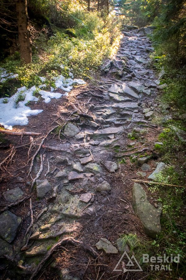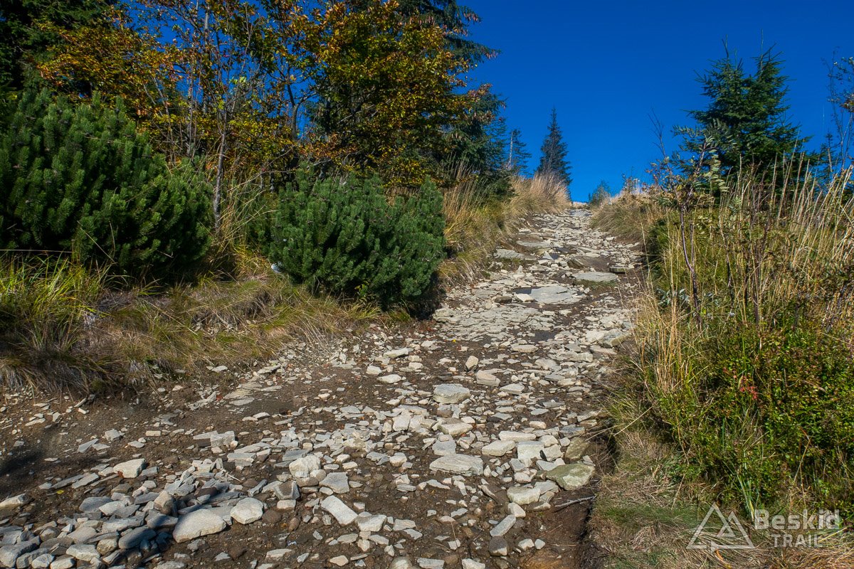 Całość trasy – lub będąc skrupulatnym – 85%, jest dość prosta technicznie, to tego stopnia, że całość da się wjechać (no, może poza fragmentem żółtego szlaku pod Malinowską Skałą, ale ten z kolei można ominąć dróżką poniżej) oraz zjechać. Przy czym od Magurki Radziechowskiej, zjazd zielonym szlakiem, zaraz na początku (jakieś 500 m), oraz końcówka (ok. 1,5km) jest dość trudna i wymagająca.