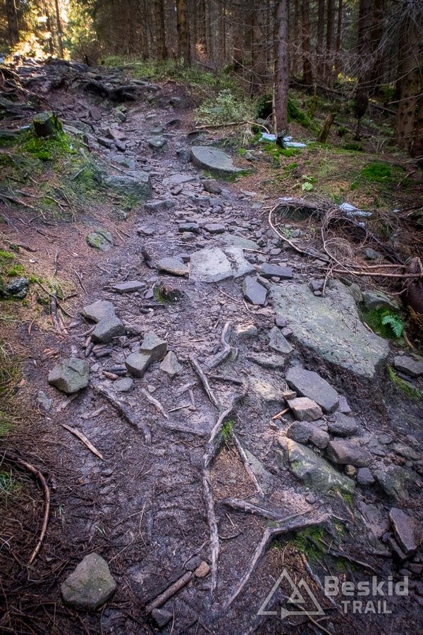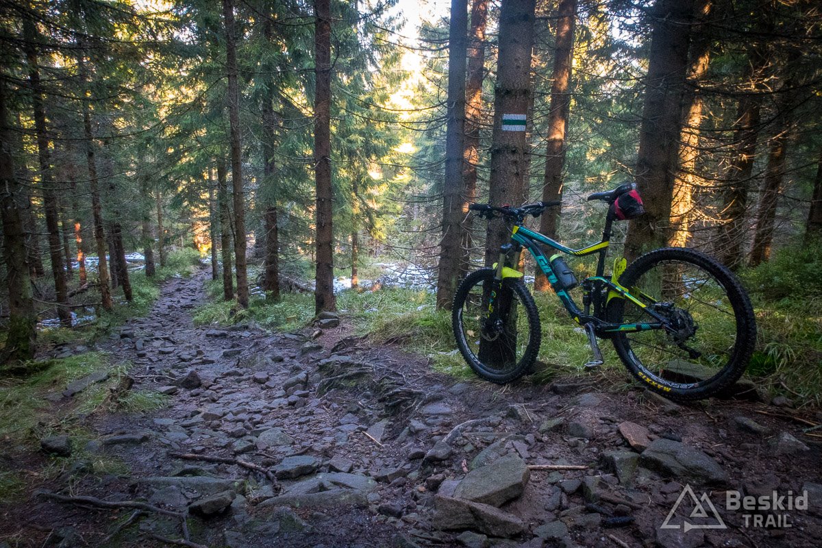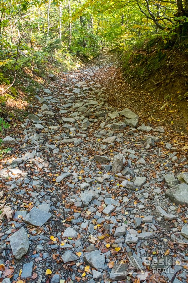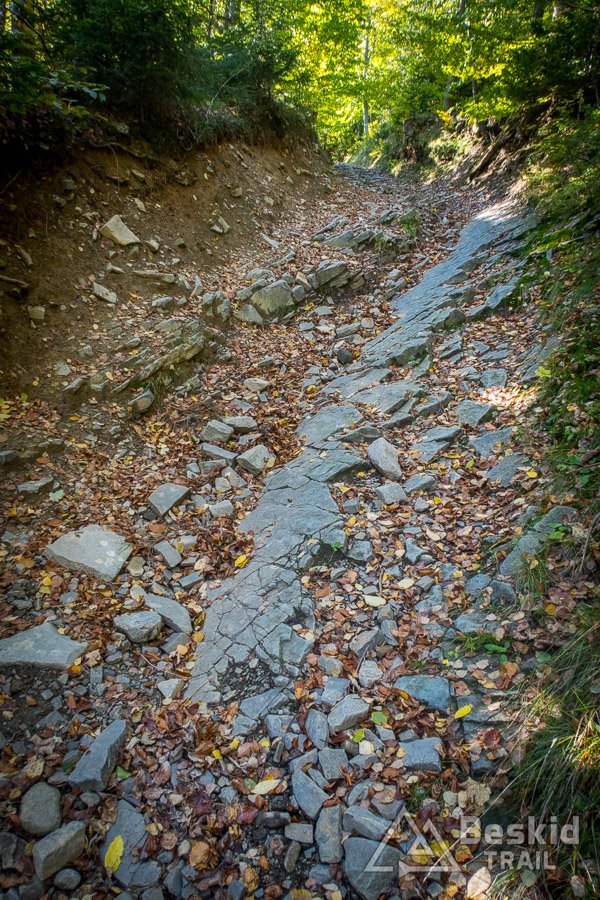 Górny odcinek to zdecydowanie najciekawszy fragment, lecz i  najtrudniejszy. Z kolei dolny to już zabawa z luźniejszymi, mniejszymi czy większymi, kamieniami (ale nie jest to typowa beskidzka rąbanka), które nieraz dowolnie są ułożone na podłożu. Póki jeszcze liści na ziemi niewiele – da się dość bezpiecznie przejechać (później to już kwestia loteryjna 😉 ).