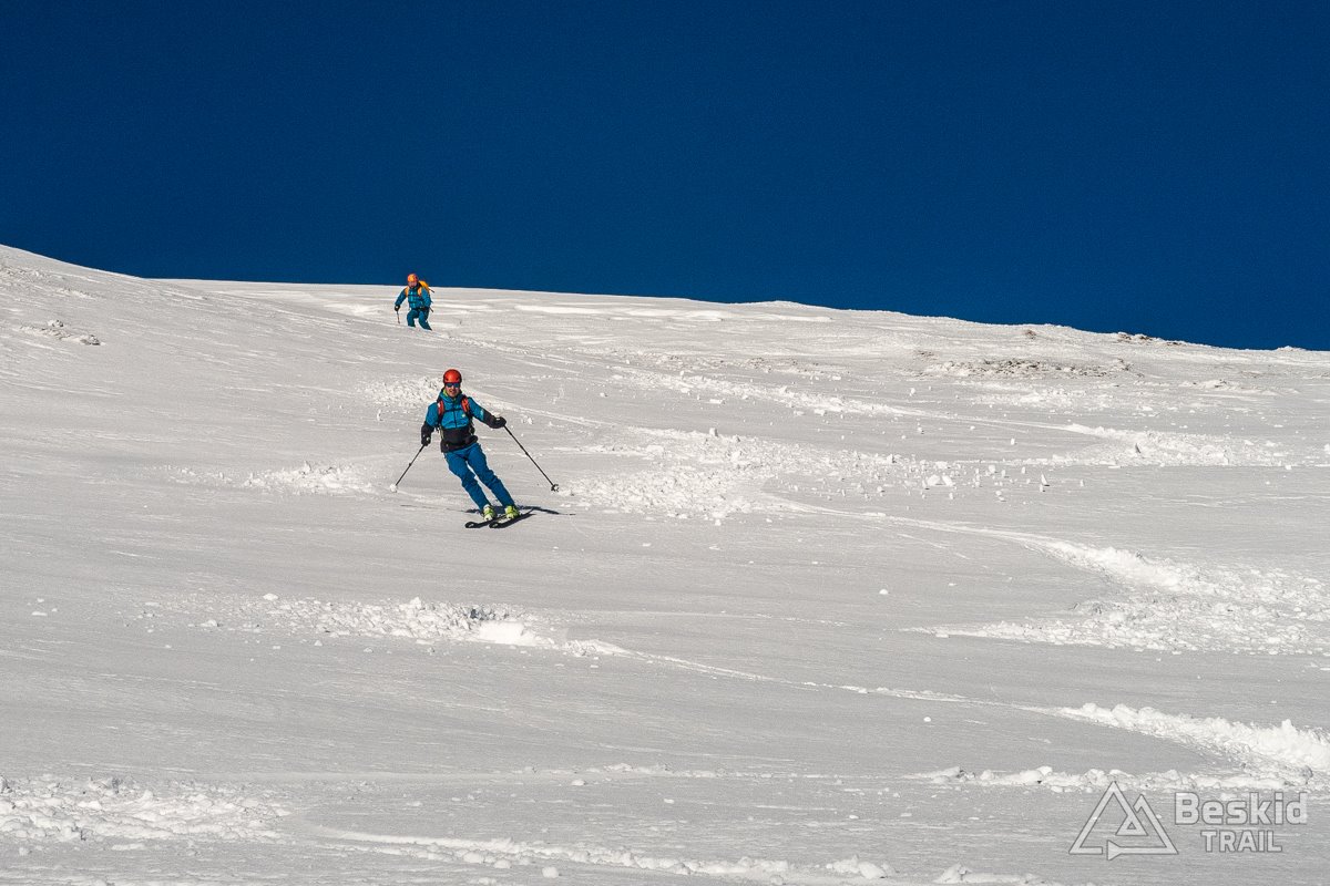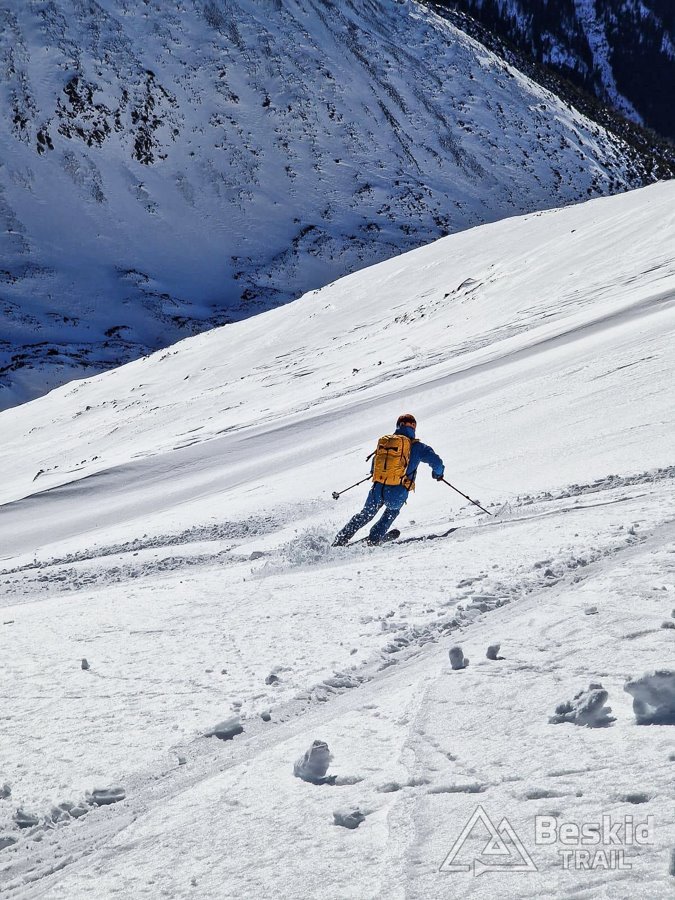 Dwa zjazdy – wystawione do słońca – na wschód i południe – były najlepsze/najbardziej przyjemne. Trzeci, centralnym żlebem, skierowanym ku północy, wymagał już więcej umiejętności i uwagi, lecz warunki sprzyjały dobremu pokonaniu tego zjazdu.