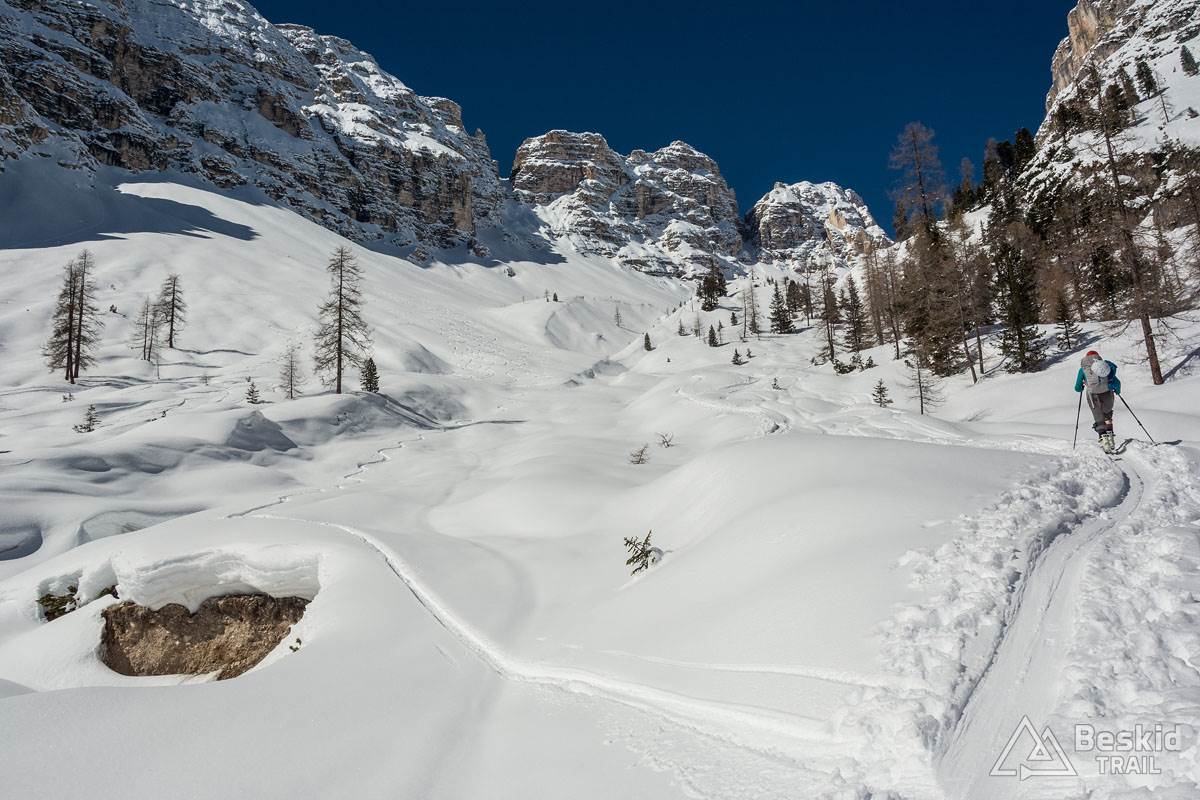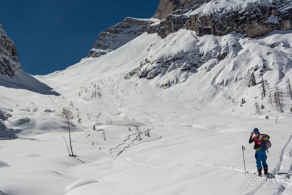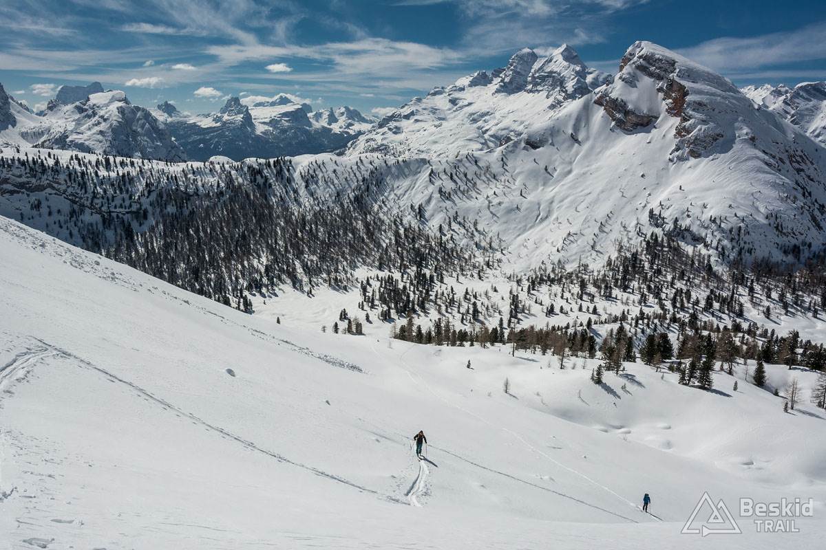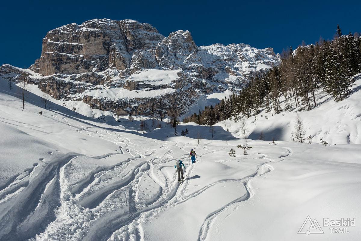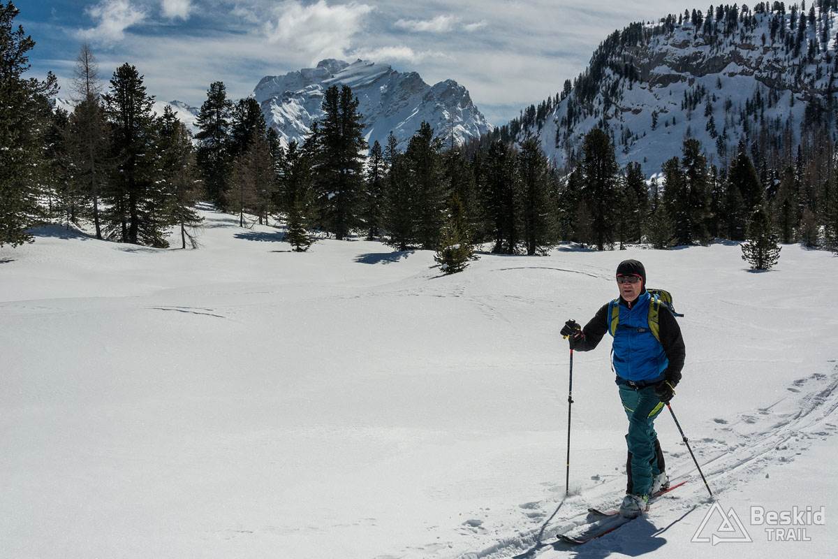 Wycieczkę rozpoczęliśmy tuż po dziewiątej, po o dziwo dość sprawnym „przeobrażeniu się” z ciuchów podróżnych w ubiór skiturowy. Początkowo wygodną leśną drogą, po założonym śladzie, doszliśmy pod przełęcz Forcella Lerosa. Po krótkim odpoczynku, skierowaliśmy się na północ, w dolinę Valbones. Stopniowo zdobywaliśmy kolejne jej piętra, by po 45 minutach ponownie skręcić w prawo, w kierunku widocznego już w oddali naszego celu – Forcella Colfiedo. W międzyczasie chłonęliśmy rozległe panoramy, które z każdym zdobytym metrem, stawały się bardziej imponujące. Śnieg na podejściu był przyjemnie miękki – jak to zsiadły puch. Tylko miejscami nieco twardawy.