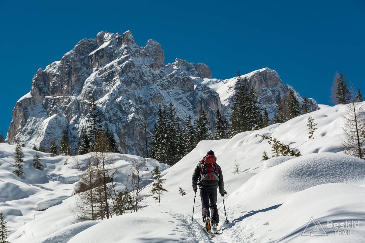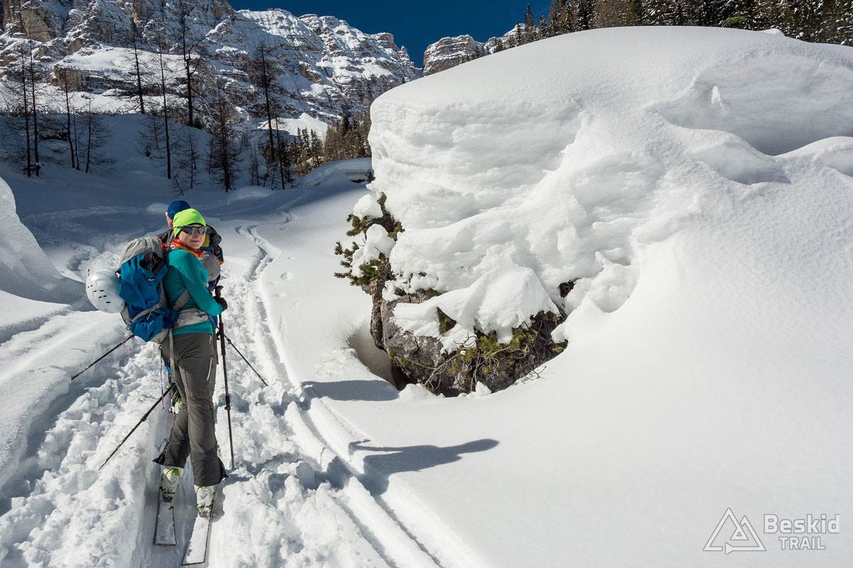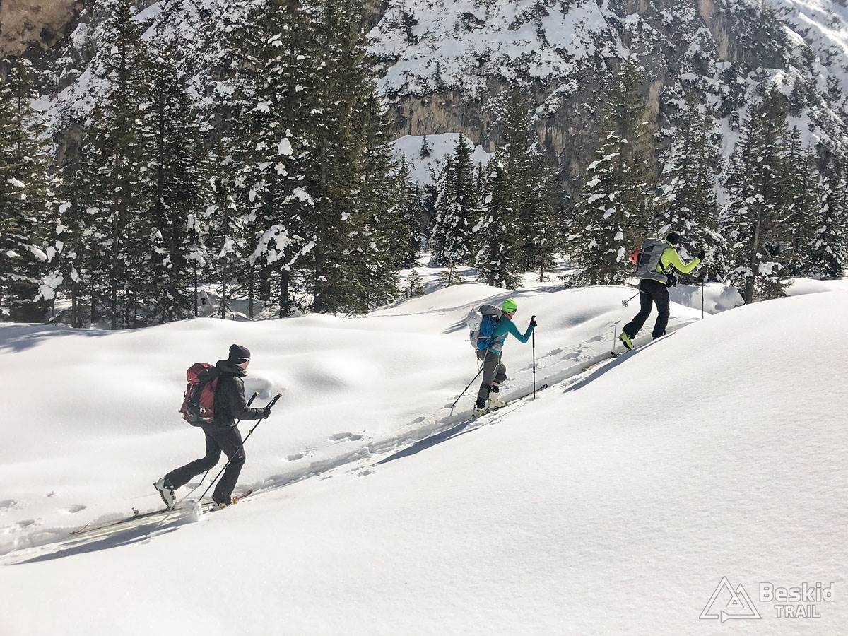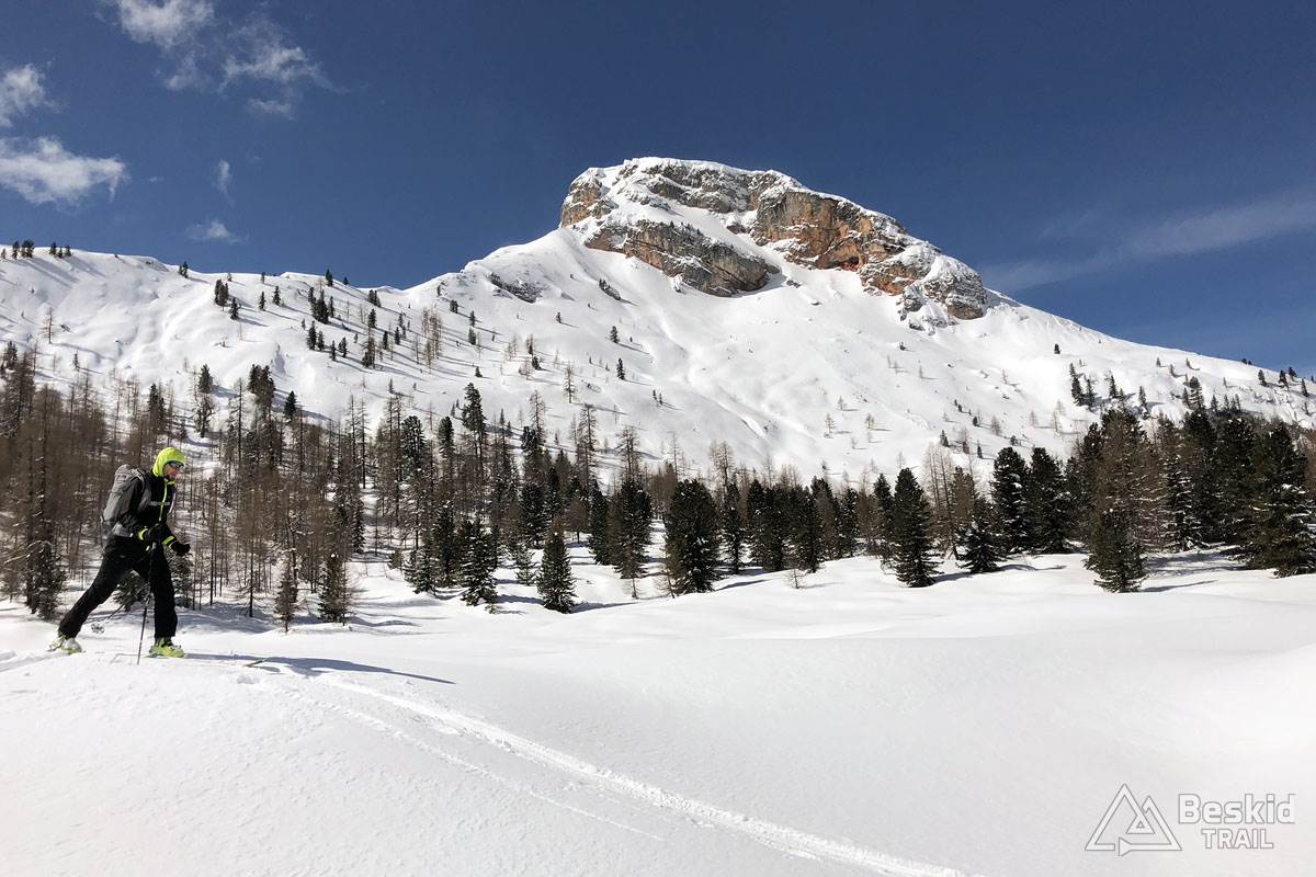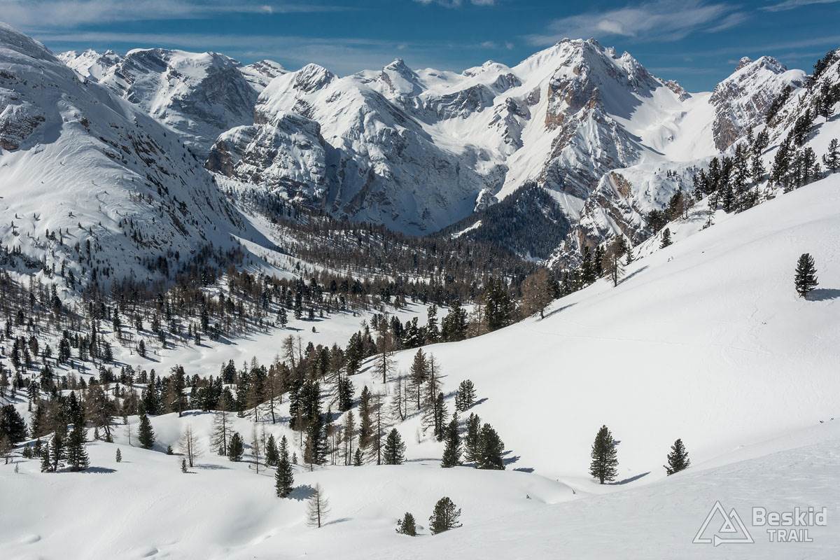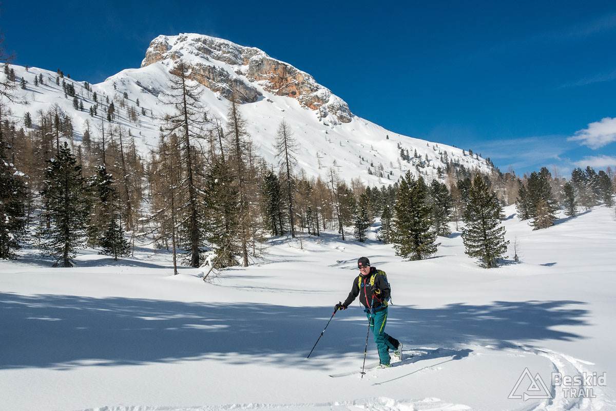 Wycieczkę rozpoczęliśmy tuż po dziewiątej, po o dziwo dość sprawnym „przeobrażeniu się” z ciuchów podróżnych w ubiór skiturowy. Początkowo wygodną leśną drogą, po założonym śladzie, doszliśmy pod przełęcz Forcella Lerosa. Po krótkim odpoczynku, skierowaliśmy się na północ, w dolinę Valbones. Stopniowo zdobywaliśmy kolejne jej piętra, by po 45 minutach ponownie skręcić w prawo, w kierunku widocznego już w oddali naszego celu – Forcella Colfiedo. W międzyczasie chłonęliśmy rozległe panoramy, które z każdym zdobytym metrem, stawały się bardziej imponujące. Śnieg na podejściu był przyjemnie miękki – jak to zsiadły puch. Tylko miejscami nieco twardawy.