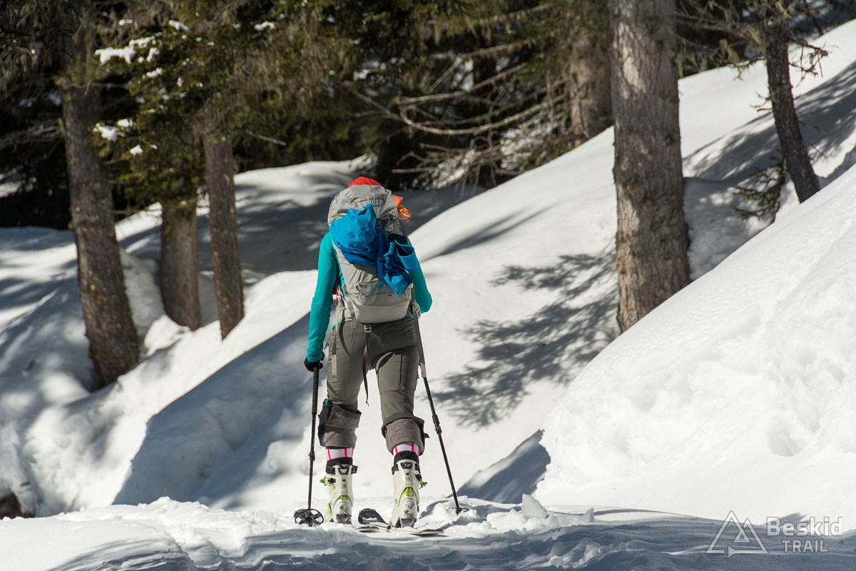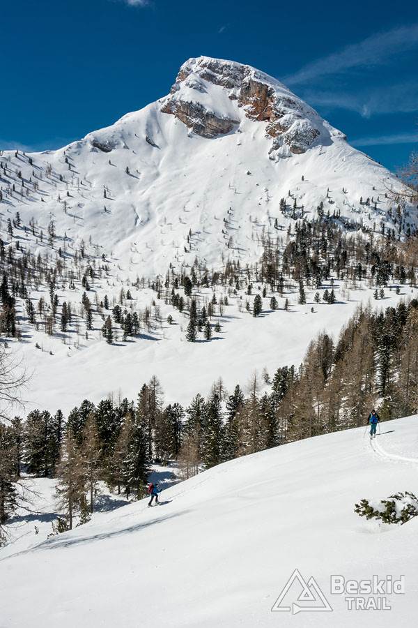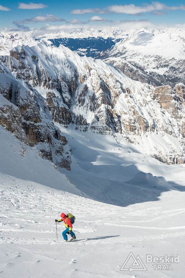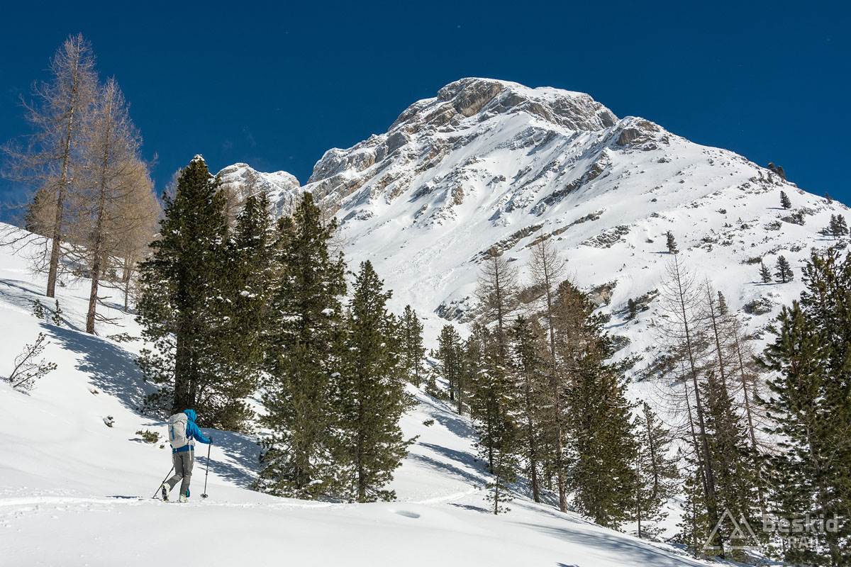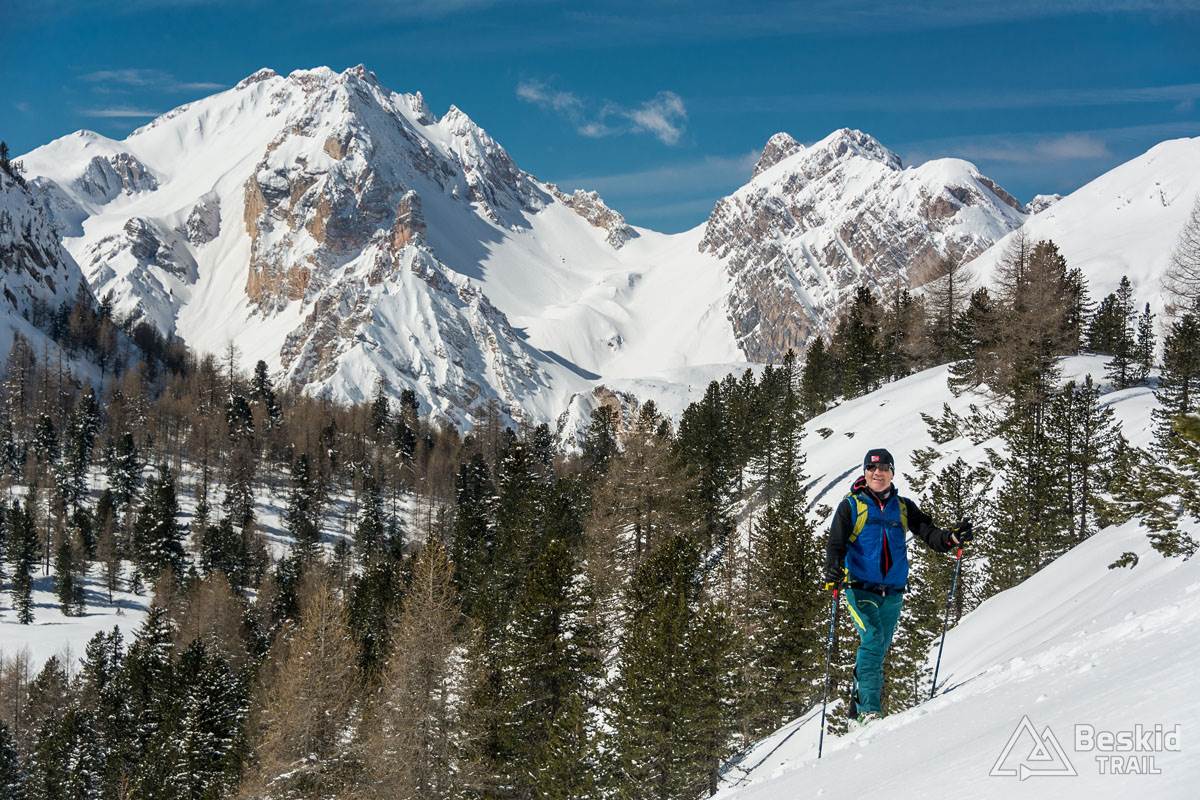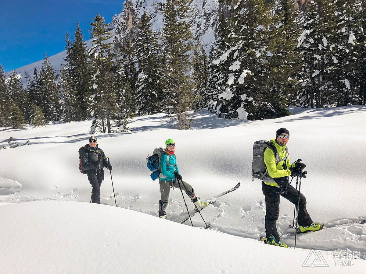 Wycieczkę rozpoczęliśmy tuż po dziewiątej, po o dziwo dość sprawnym „przeobrażeniu się” z ciuchów podróżnych w ubiór skiturowy. Początkowo wygodną leśną drogą, po założonym śladzie, doszliśmy pod przełęcz Forcella Lerosa. Po krótkim odpoczynku, skierowaliśmy się na północ, w dolinę Valbones. Stopniowo zdobywaliśmy kolejne jej piętra, by po 45 minutach ponownie skręcić w prawo, w kierunku widocznego już w oddali naszego celu – Forcella Colfiedo. W międzyczasie chłonęliśmy rozległe panoramy, które z każdym zdobytym metrem, stawały się bardziej imponujące. Śnieg na podejściu był przyjemnie miękki – jak to zsiadły puch. Tylko miejscami nieco twardawy.