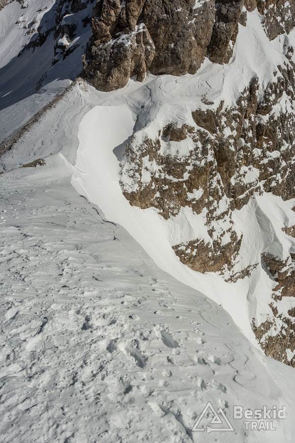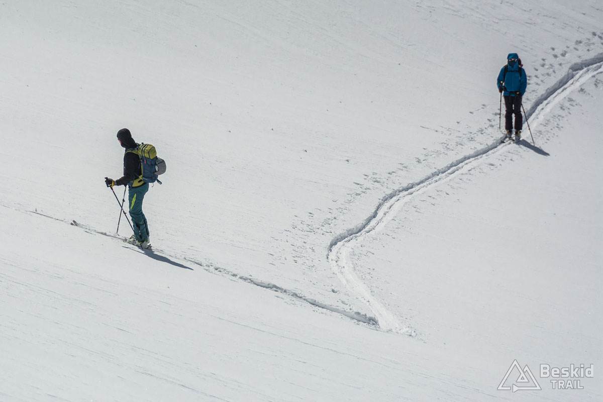 Wspomnianą przełęcz udało mi się zdobyć już 2 lata temu, tyle że od strony południowej. Jest to bardziej wymagająca skitura, dostępna tylko przy pewnych warunkach śniegowych. Gdy teraz byłem na przełęczy, nie było widać jeszcze żadnych śladów podejścia i zjazdu na tamtą stronę.
