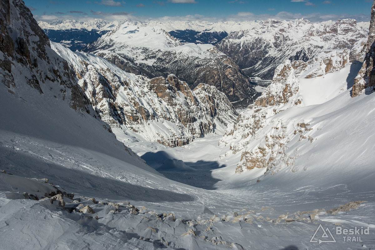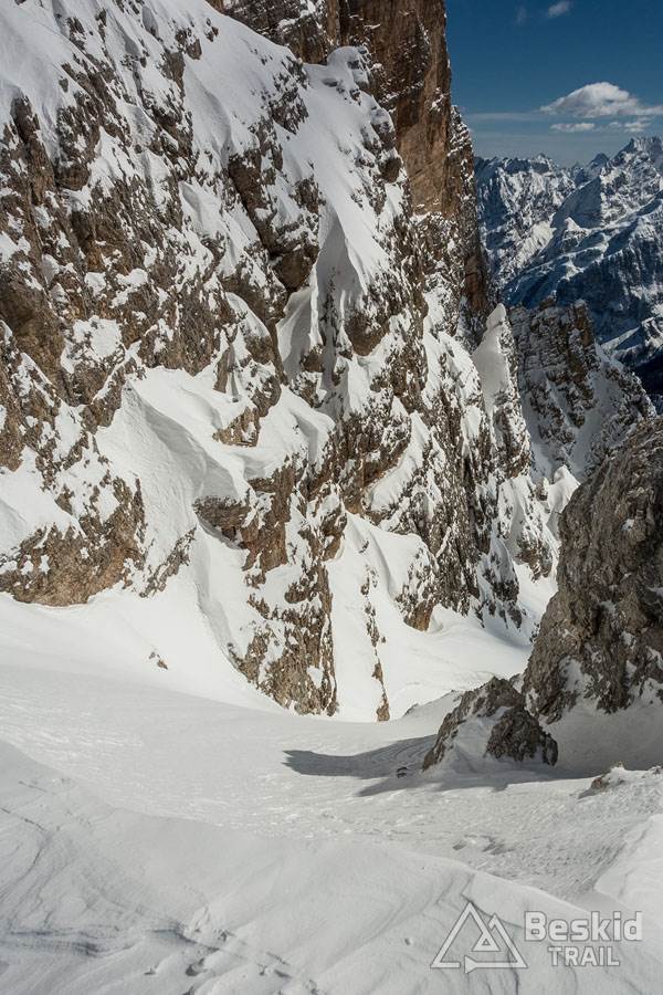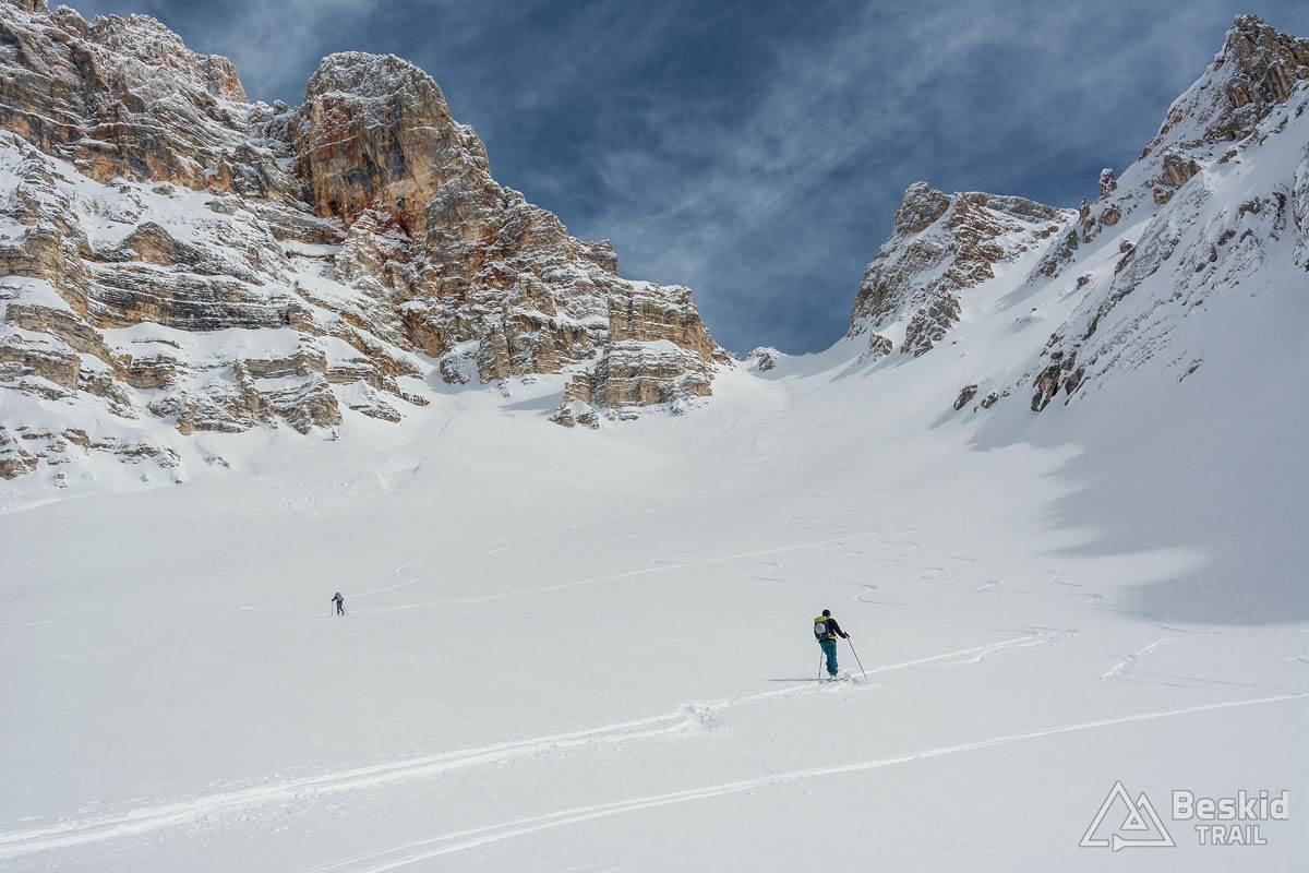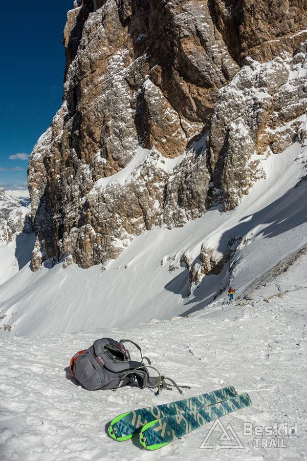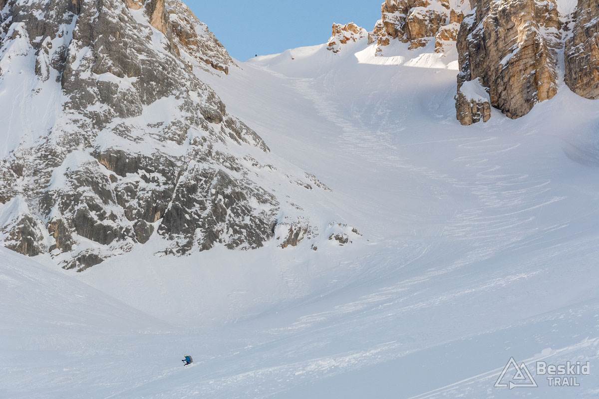 Do przełęczy zostało nam jeszcze sporo podejścia, lecz nie było ono specjalnie trudne. W niespełna 2 godziny pokonujemy tę część trasy i ok. 13.30 meldujemy się na Forcelli Cristallo. Nie spędzamy na niej wiele czasu, ponieważ zerwał się dość chłodny wiatr, który skutecznie nas wychładzał. Robimy kilka zdjęć i przepinamy się do zjazdu. Pierwsze 100 metrów dość twarde i zryte przez innych narciarzy, ale wraz z rozszerzaniem się żlebu, trafiamy na nietknięte połacie miękkiego śniegu. Zabawa jest doprawdy przednia – cudowny zjazd w pięknych okolicznościach przyrody.