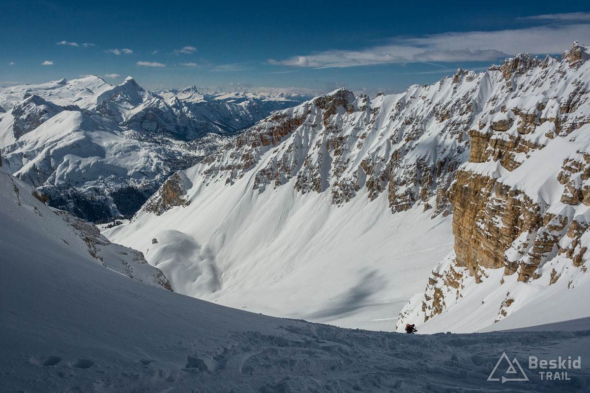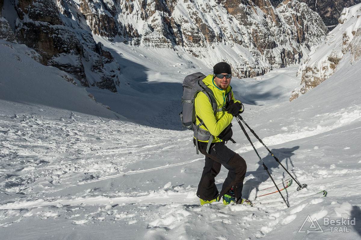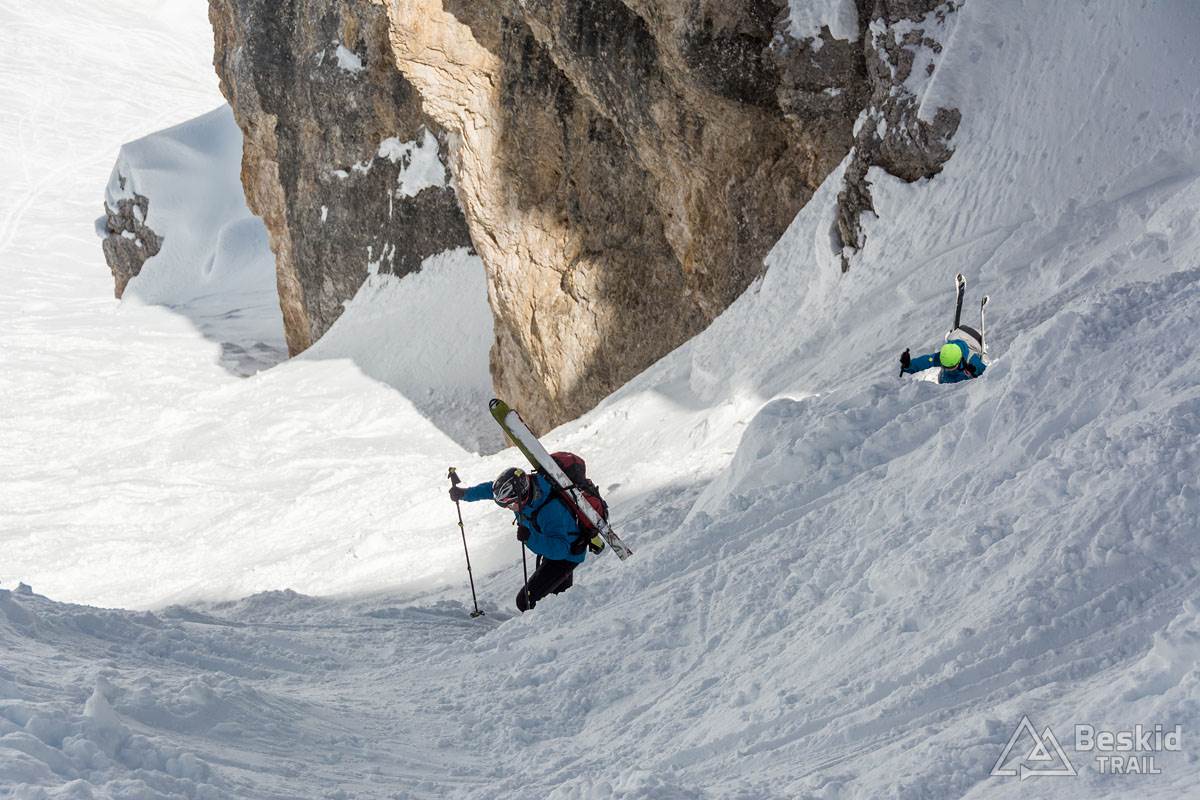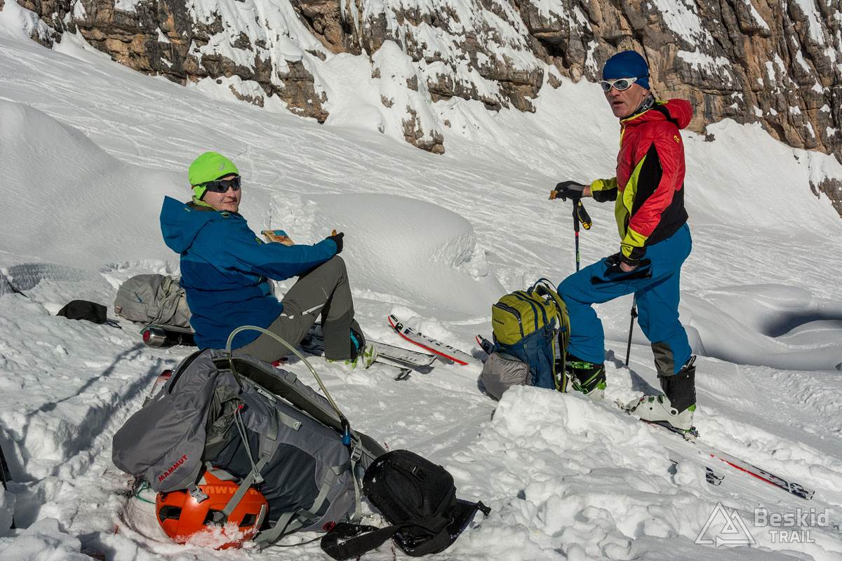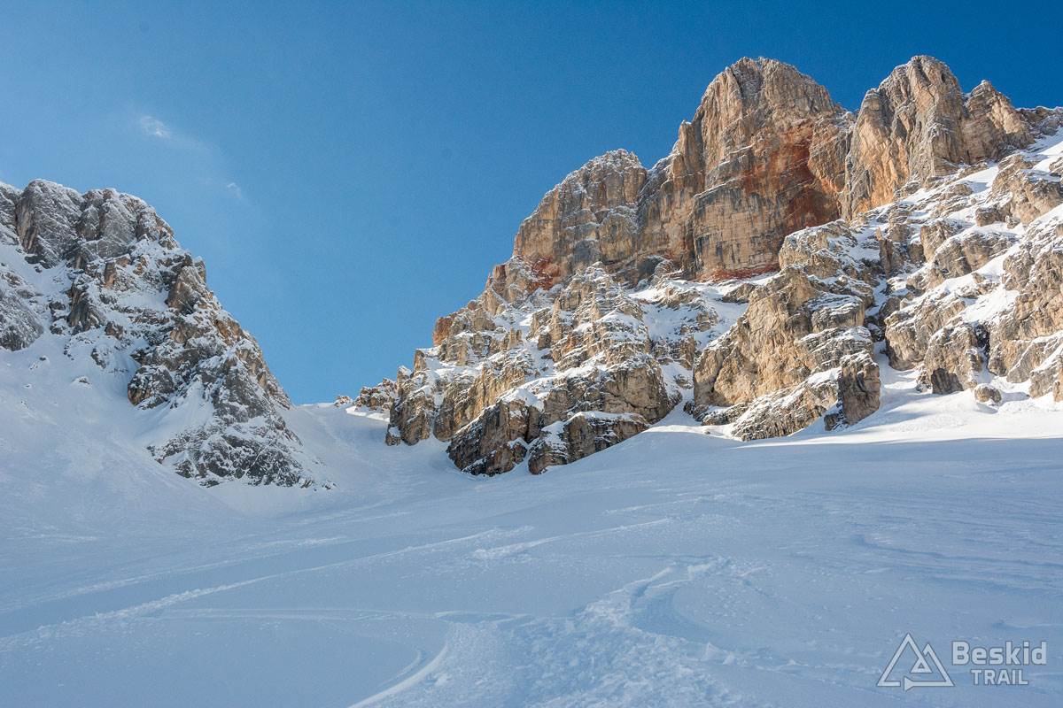 Do przełęczy zostało nam jeszcze sporo podejścia, lecz nie było ono specjalnie trudne. W niespełna 2 godziny pokonujemy tę część trasy i ok. 13.30 meldujemy się na Forcelli Cristallo. Nie spędzamy na niej wiele czasu, ponieważ zerwał się dość chłodny wiatr, który skutecznie nas wychładzał. Robimy kilka zdjęć i przepinamy się do zjazdu. Pierwsze 100 metrów dość twarde i zryte przez innych narciarzy, ale wraz z rozszerzaniem się żlebu, trafiamy na nietknięte połacie miękkiego śniegu. Zabawa jest doprawdy przednia – cudowny zjazd w pięknych okolicznościach przyrody.