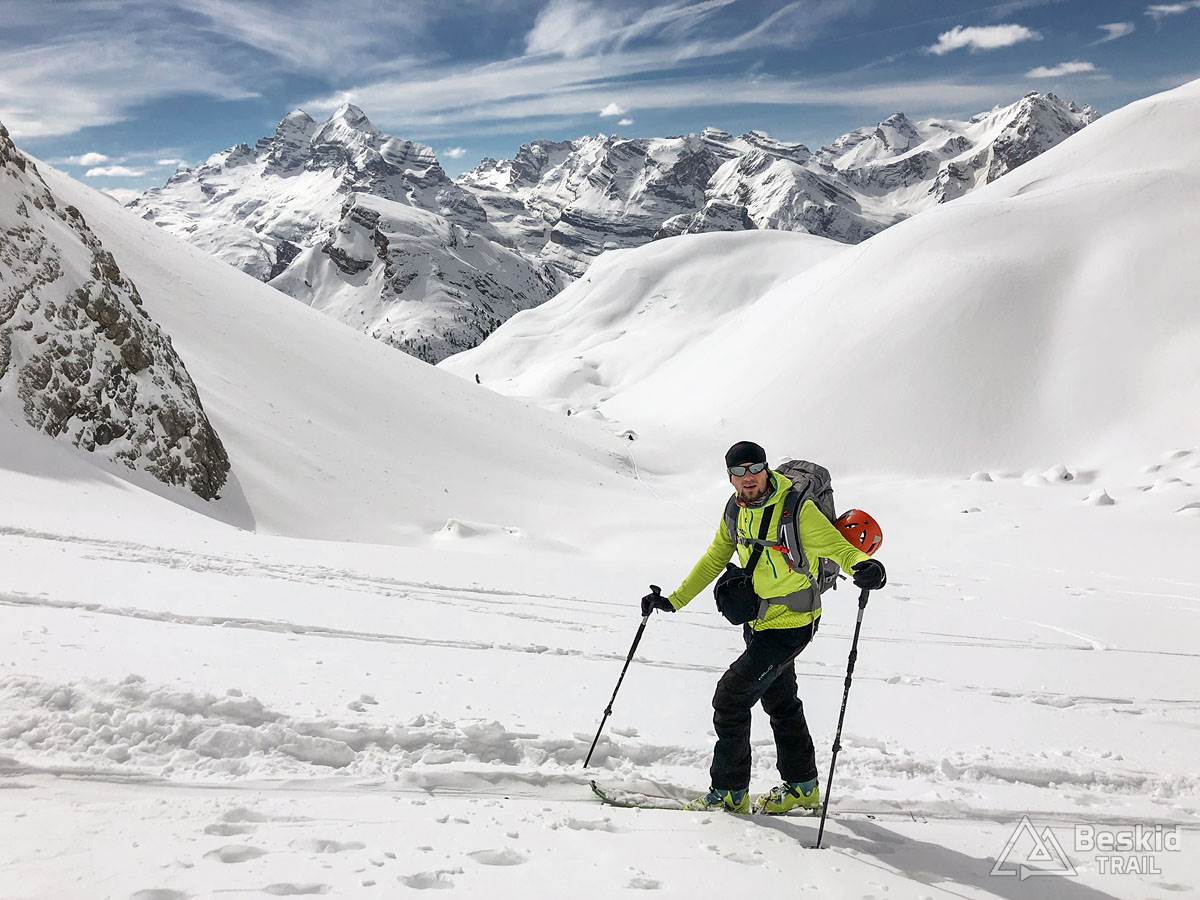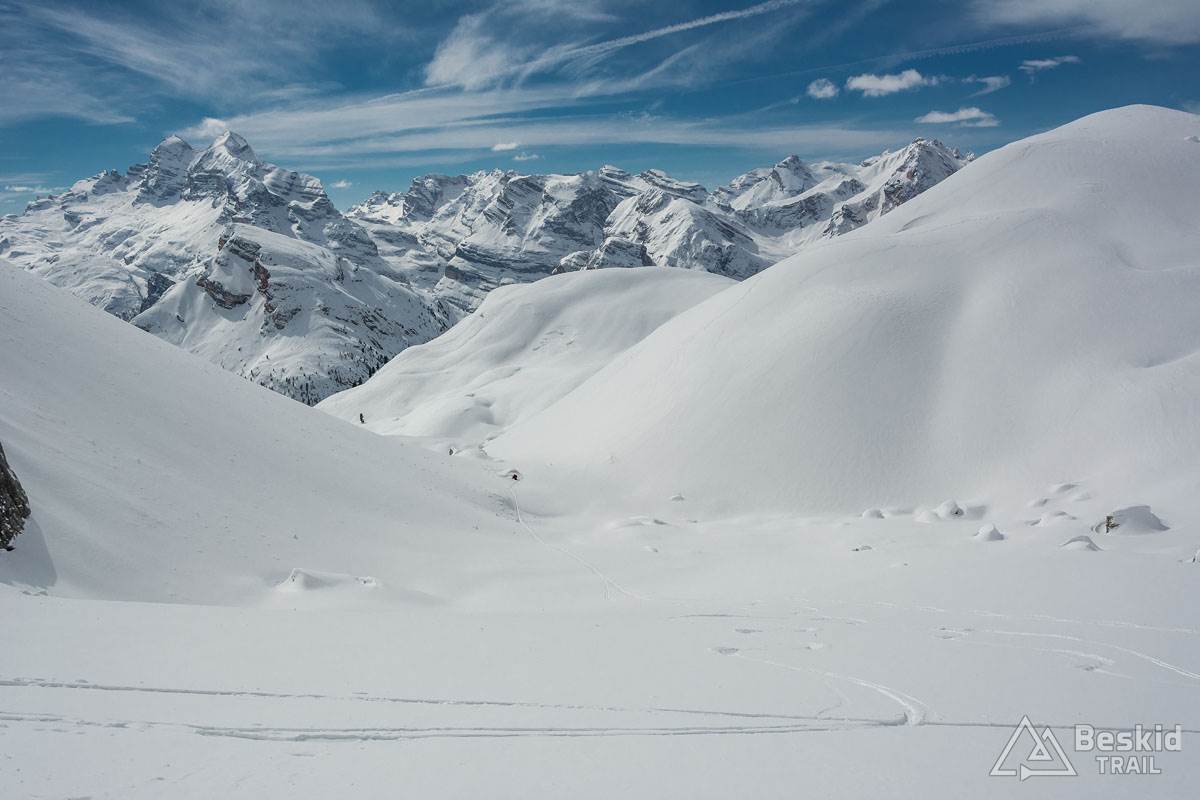 Podczas kolejnych metrów wznoszenia, podziwialiśmy coraz bardziej wyjątkową górską scenerię. W międzyczasie widzieliśmy wiele innych celów skiturowych, które może nie były wybitnymi przełęczami czy szczytami, ale oferowały wyborne śniegi do zjazdu. My jednak chcieliśmy dotrzeć do planowanego celu, mając także nadzieję na przyjemny zjazd.