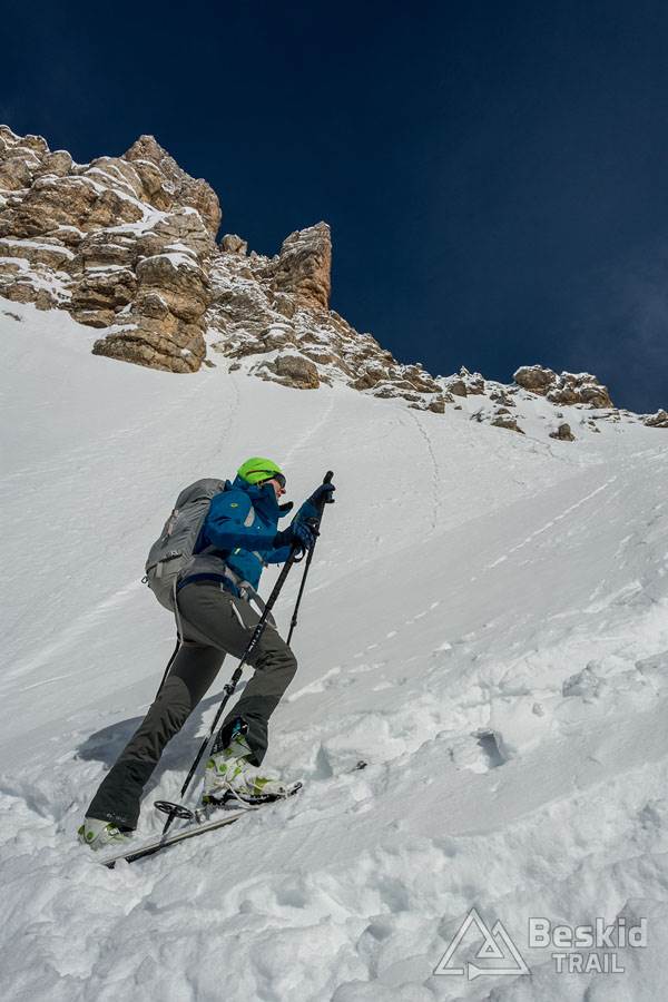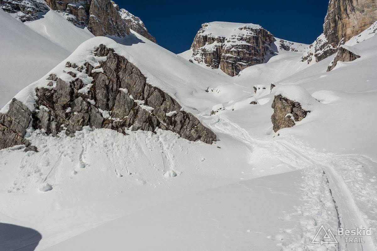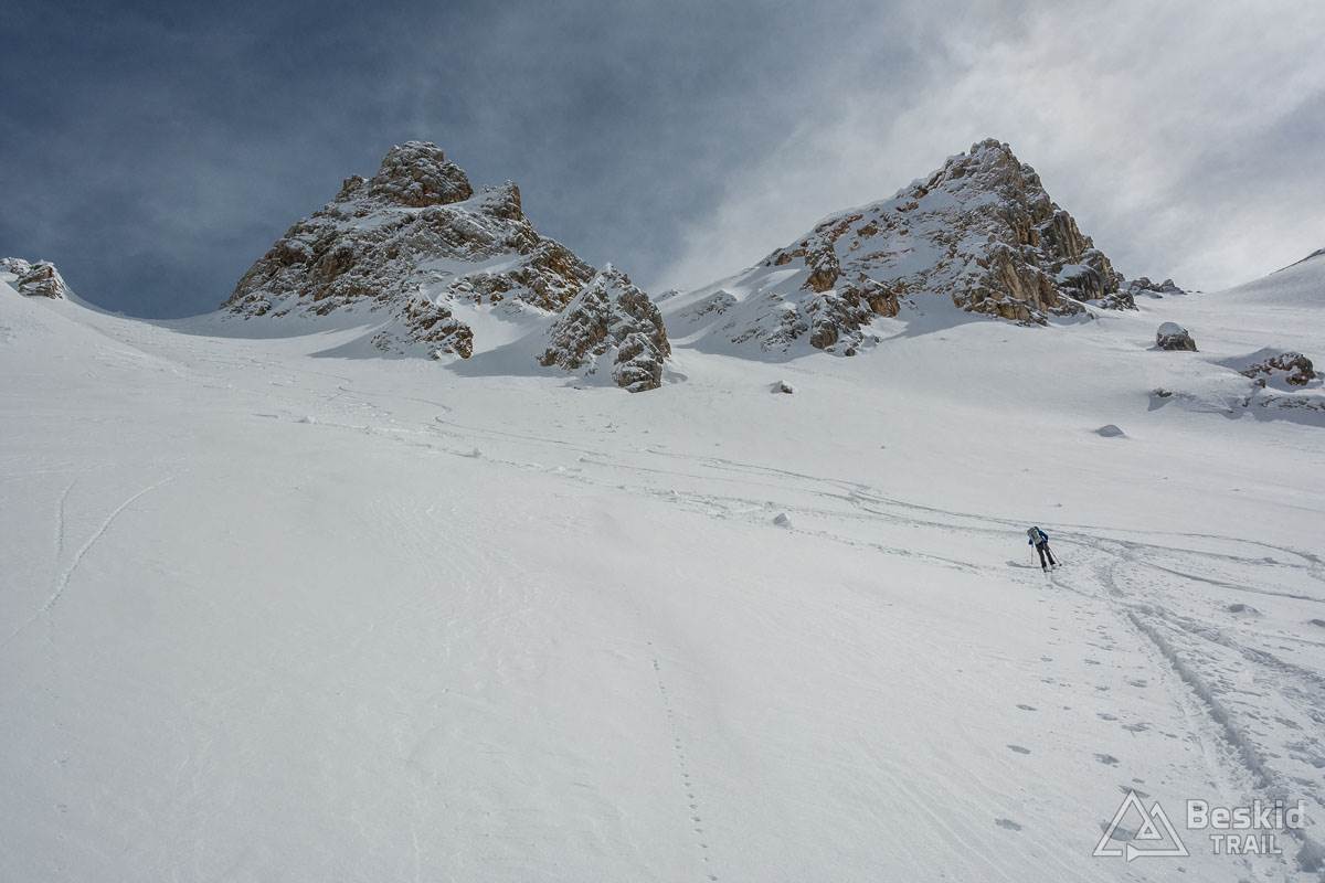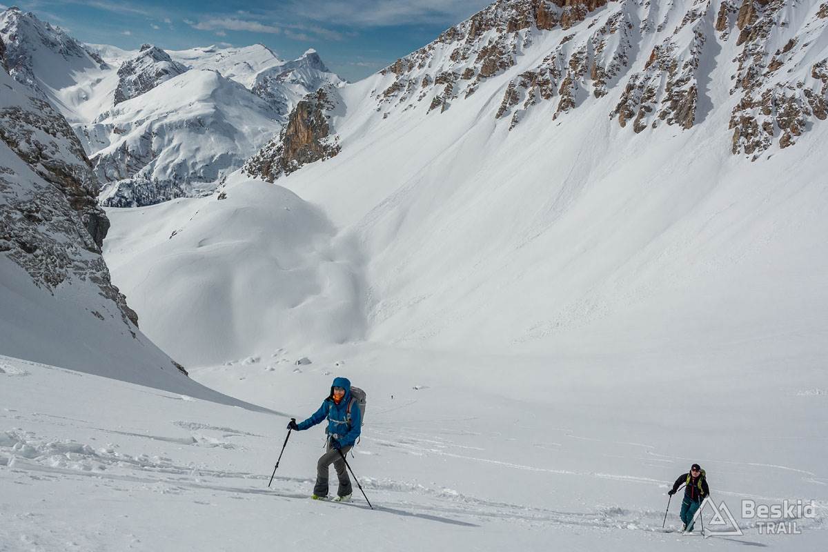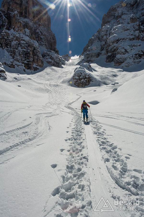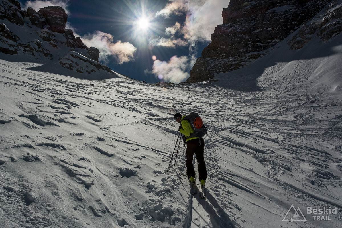 Początkowo płaskim dnem doliny dochodzimy pod interesującą bramę skalną. Za nią powoli wznosimy się, chcąc czym prędzej dojść do słońca, ponieważ w cieniu było zdecydowanie za rześko ;). W promieniach słońca, pokonawszy już 400 metrów podejścia, robimy odpoczynek. Przy okazji obserwujemy w jaki sposób inni skiturowcy pokonują czekające nas przejście wąskiego progu, oddzielającego 2 poziomy doliny. 3/4 da się przejść „na foce”, lecz ostatnie 30 metrów wymaga już zdjęcia nart i przypięcia ich do plecaka. Po pokonaniu tych trudności, naszym oczom ukazują się rozległe zbocza, pełne świetnych terenów zjazdowych.