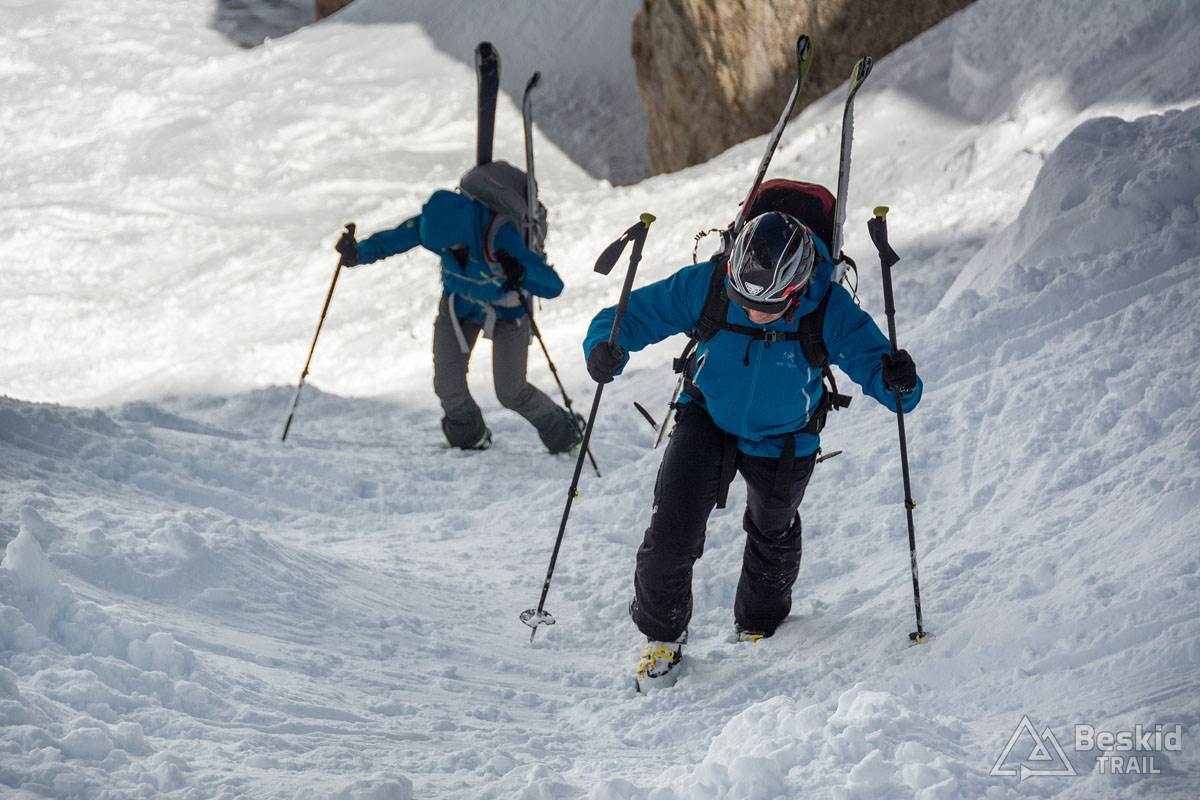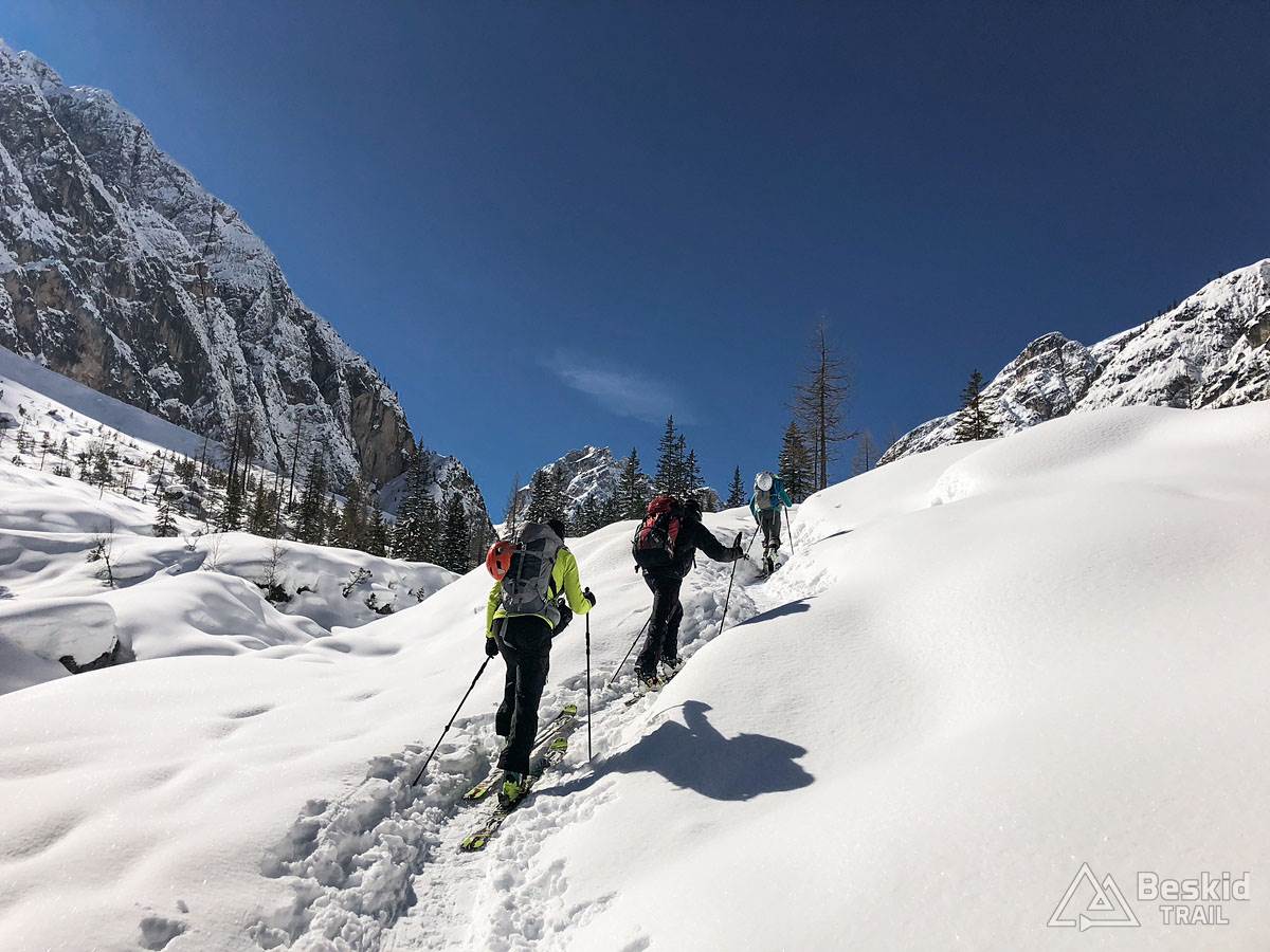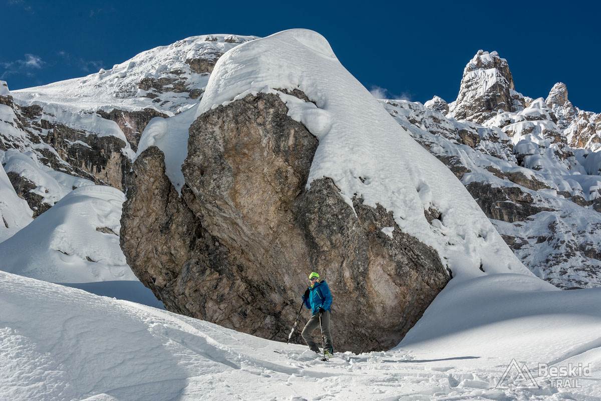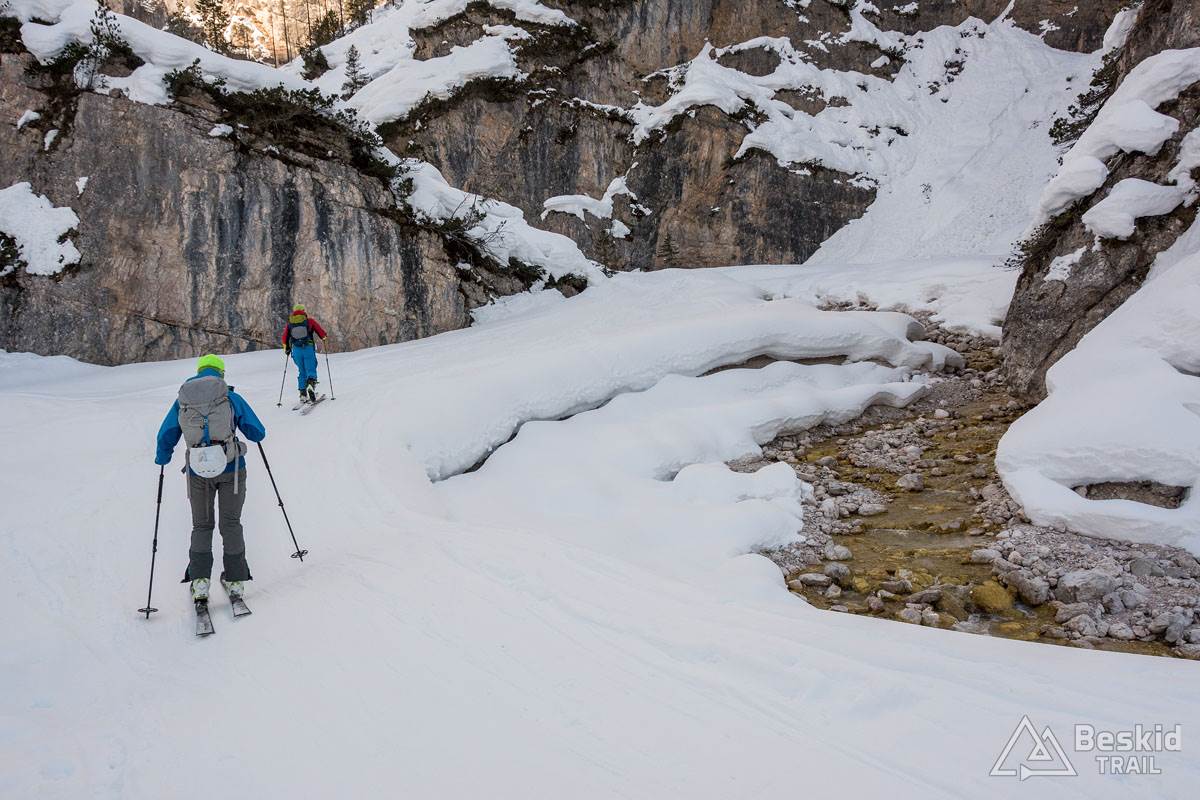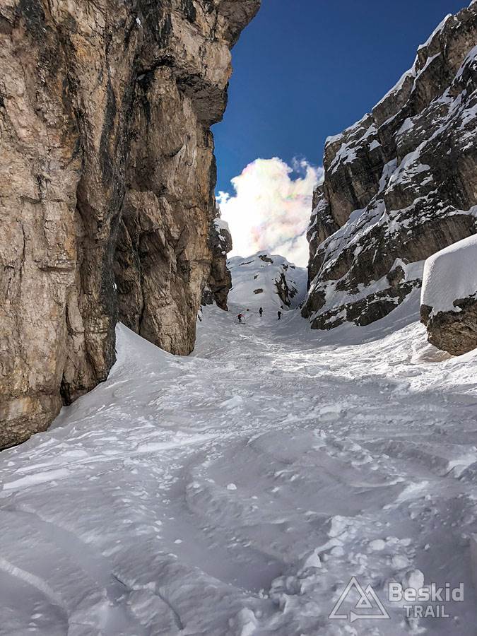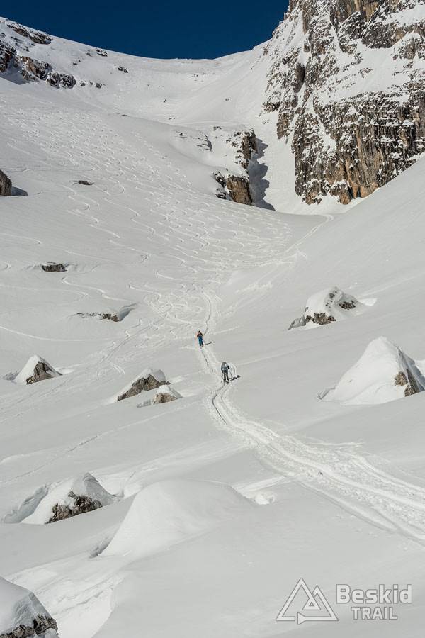 Początkowo płaskim dnem doliny dochodzimy pod interesującą bramę skalną. Za nią powoli wznosimy się, chcąc czym prędzej dojść do słońca, ponieważ w cieniu było zdecydowanie za rześko ;). W promieniach słońca, pokonawszy już 400 metrów podejścia, robimy odpoczynek. Przy okazji obserwujemy w jaki sposób inni skiturowcy pokonują czekające nas przejście wąskiego progu, oddzielającego 2 poziomy doliny. 3/4 da się przejść „na foce”, lecz ostatnie 30 metrów wymaga już zdjęcia nart i przypięcia ich do plecaka. Po pokonaniu tych trudności, naszym oczom ukazują się rozległe zbocza, pełne świetnych terenów zjazdowych.