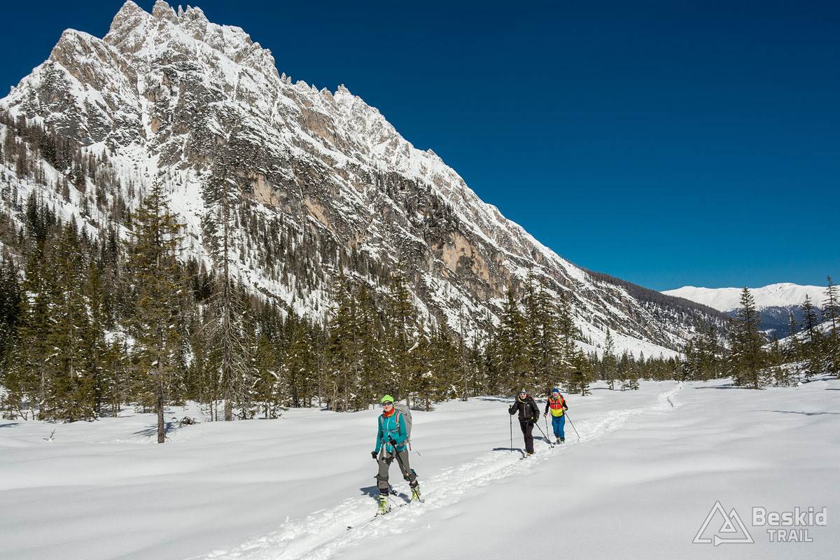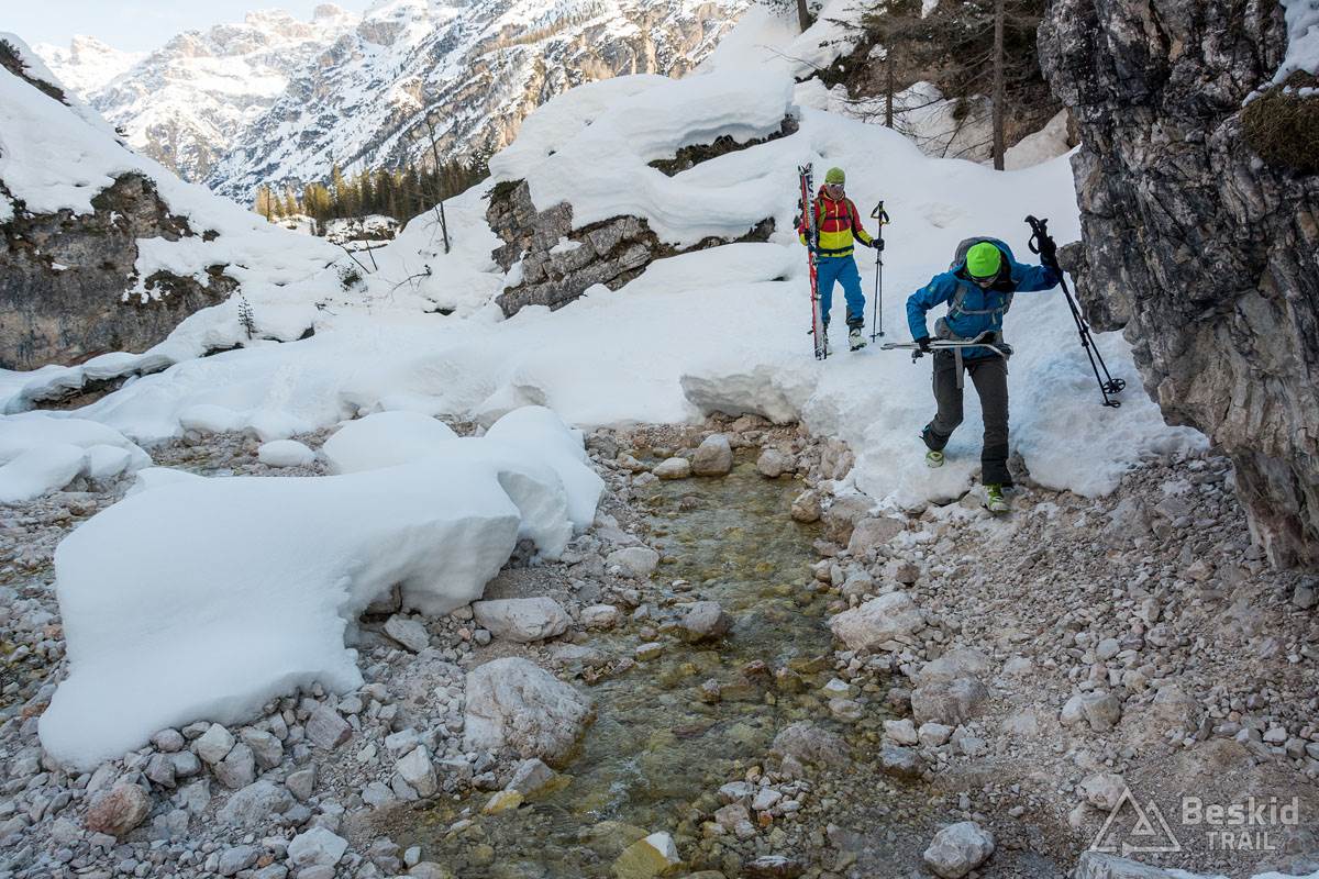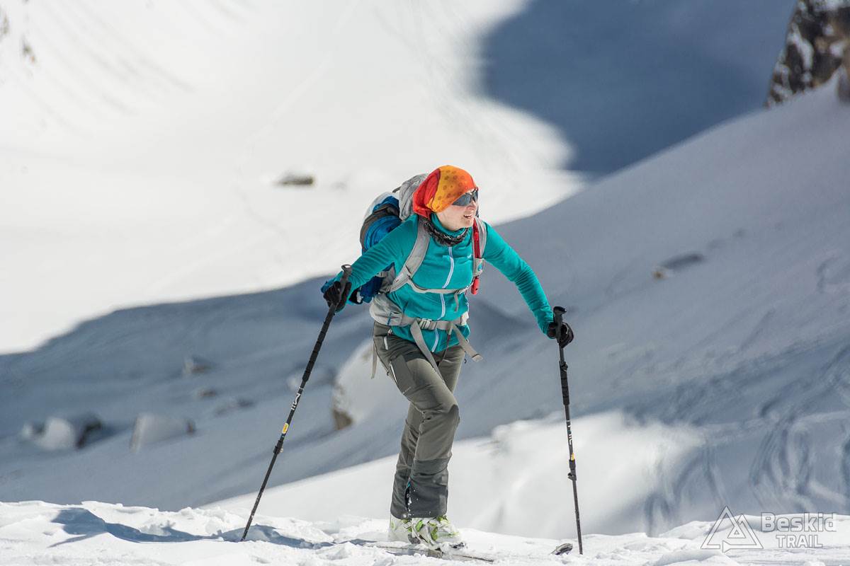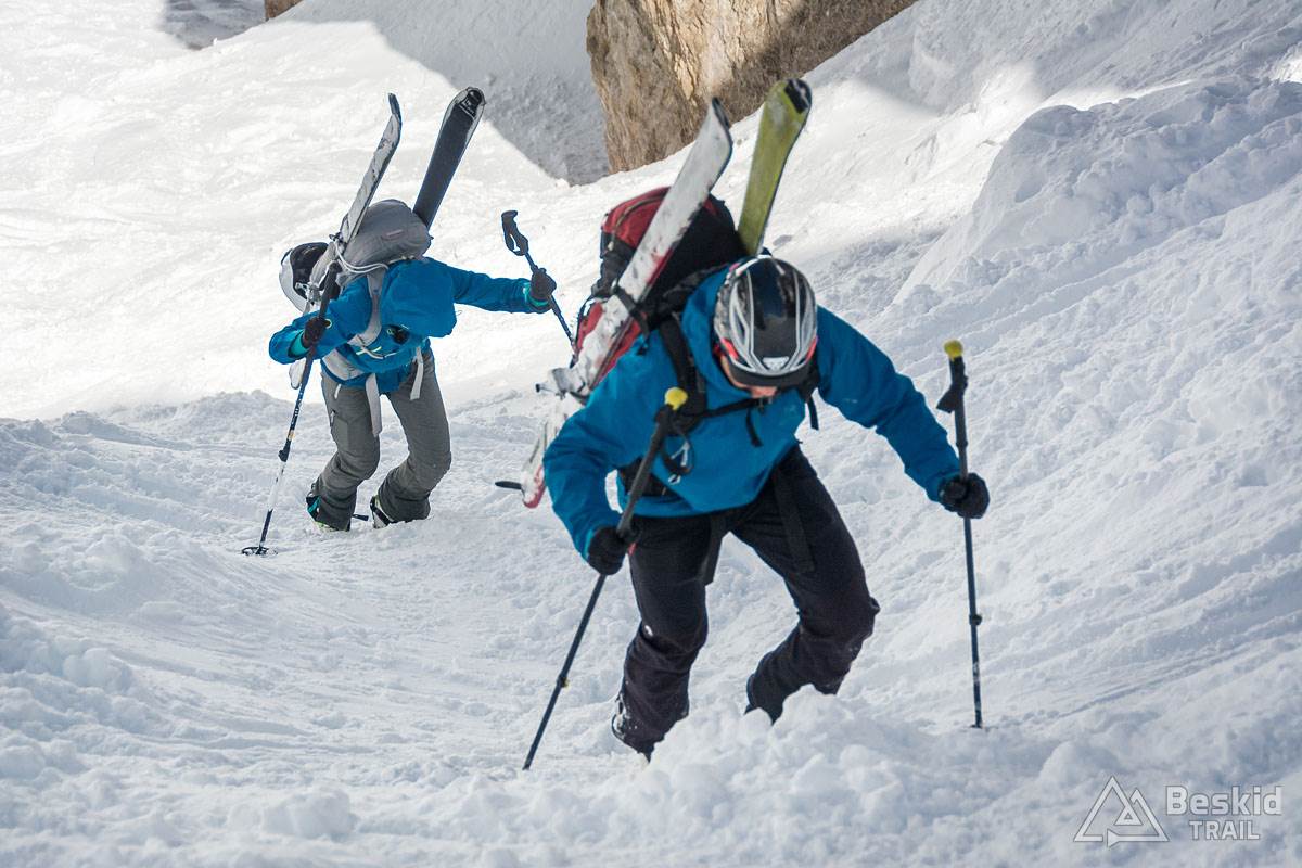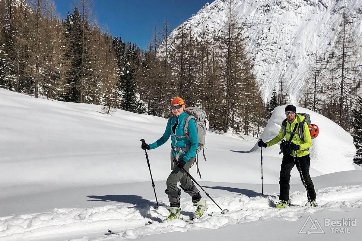 Początkowo płaskim dnem doliny dochodzimy pod interesującą bramę skalną. Za nią powoli wznosimy się, chcąc czym prędzej dojść do słońca, ponieważ w cieniu było zdecydowanie za rześko ;). W promieniach słońca, pokonawszy już 400 metrów podejścia, robimy odpoczynek. Przy okazji obserwujemy w jaki sposób inni skiturowcy pokonują czekające nas przejście wąskiego progu, oddzielającego 2 poziomy doliny. 3/4 da się przejść „na foce”, lecz ostatnie 30 metrów wymaga już zdjęcia nart i przypięcia ich do plecaka. Po pokonaniu tych trudności, naszym oczom ukazują się rozległe zbocza, pełne świetnych terenów zjazdowych.