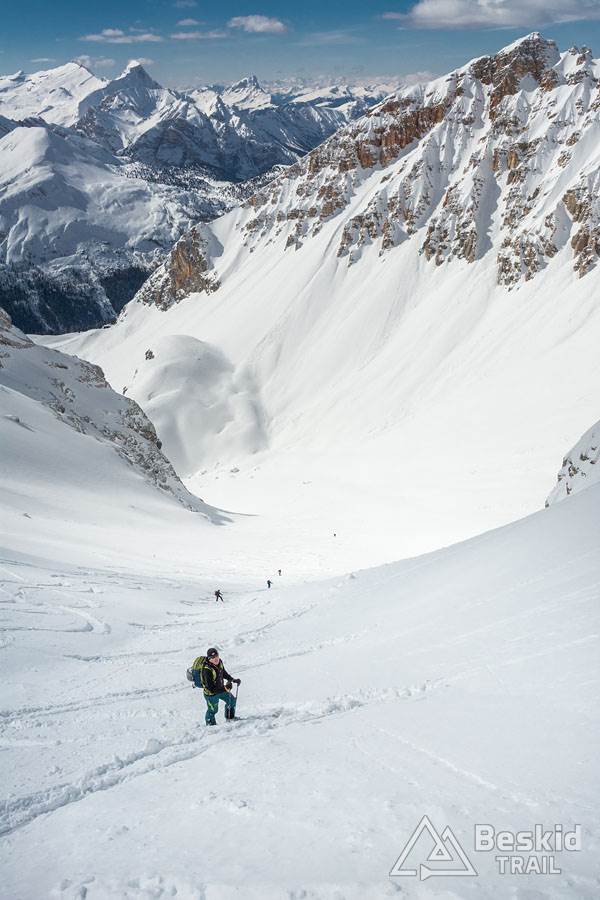 Przełęcz Forcella Colfiedo udało się zdobyć całkiem sprawnie. Bałem się, że po nieprzespanej nocy i braku aklimatyzacji, wystąpią jakieś większe problemy, lecz tych na szczęście udało się uniknąć. Na górze mieliśmy do wyboru: zjazd drogą podejścia (po wybornym śniegu, lecz drogą niżej w twardym śniegu, niczym w szynach) lub dziewiczy zjazd na wschód. Po kilku przemyśleniach i wzajemnych konsultacjach, postanowiliśmy zjechać nieruszonym do tej pory żlebem. Górny fragment pełny był dobrego śniegu, więc można było niemal swobodnie kręcić. Nieco niżej zaczął pojawiać się zbetoniały śnieg i miejscami szreń. Lecz udawało się pokonać te nieprzyjemności, szukając chociażby niewielkich wklęśnięć, w których znajdował się lepszy śnieg. Dopiero ostatnie 400 metrów zjazdu stało większym problemem, ponieważ był on już poważnie „skażony” operacją słońca. Z każdym kolejnym metrem w dół śnieg twardniał, by finalnie w najniższej części zjazdu, przemienić się niemalże w lód. Na szczęście udało się pokonać i te trudności, a na dole mogliśmy cieszyć się zjazdem i pokonaniem go jako pierwsi (nota bene tego dnia dopiero po naszym zjeździe kilka osób zdecydowało się tam pojechać).