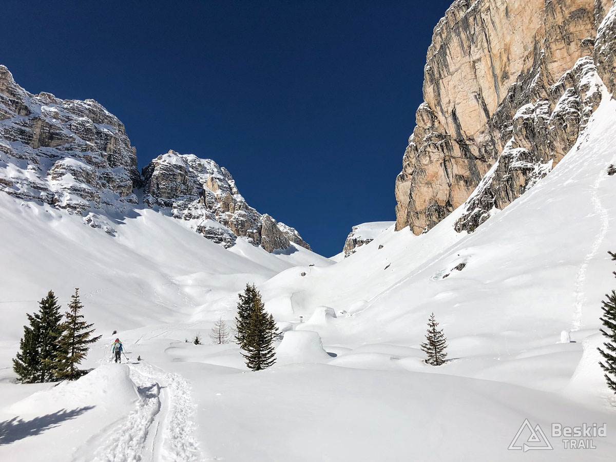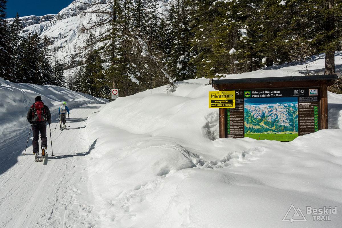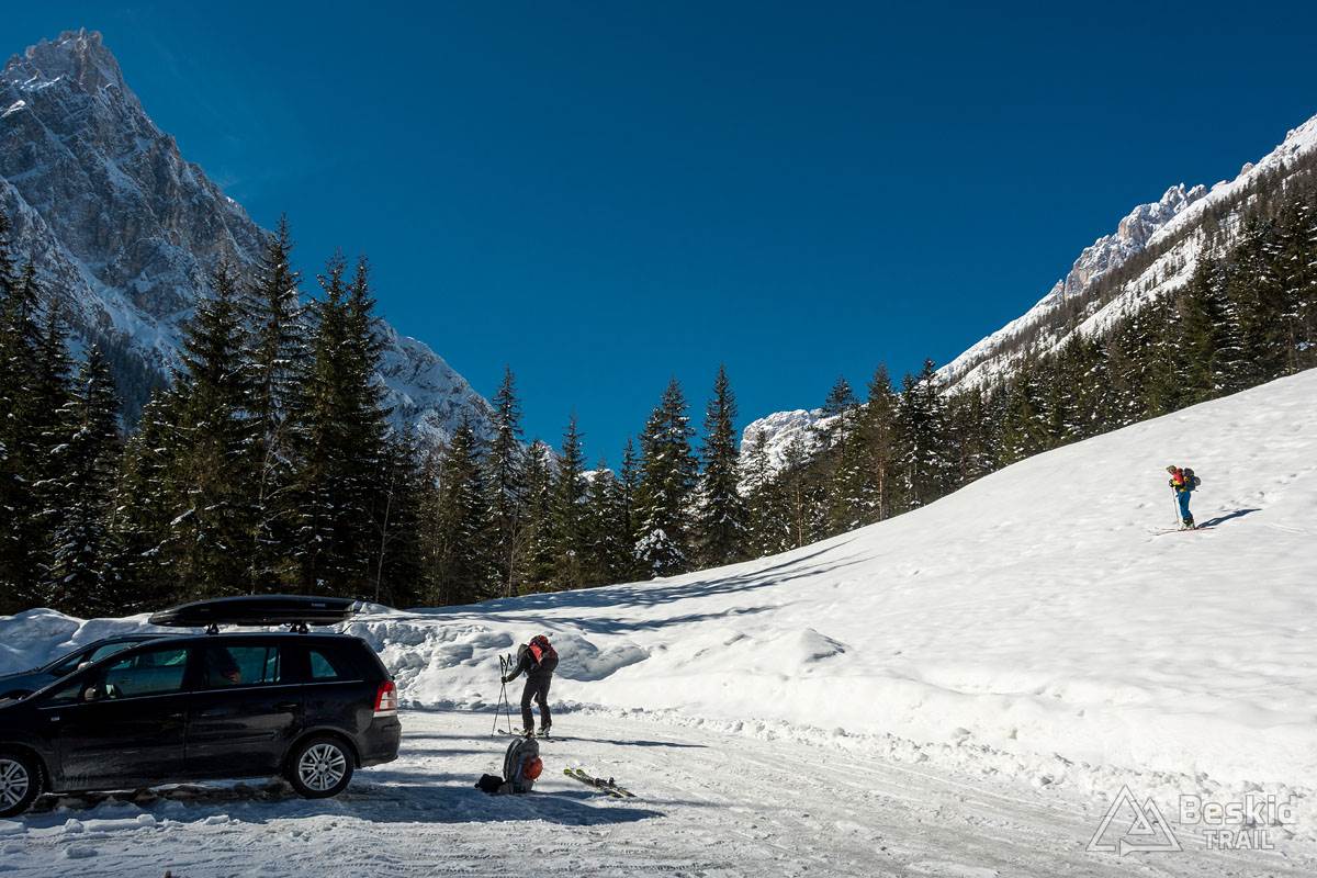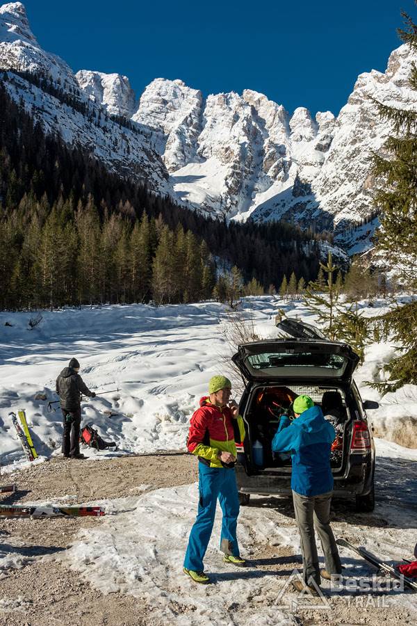 Kilka minut po ósmej stawiliśmy się na parkingu u wylotu doliny Fonda. Darzę to miejsce wielkim sentymentem, ponieważ podczas pierwszego kilkudniowego wyjazdu na skitury w Dolomity, udało mi się, wraz z kolegami, zjechać do tej pory najtrudniejszy zjazd – Canale Staunies Nord (wycena 4+)