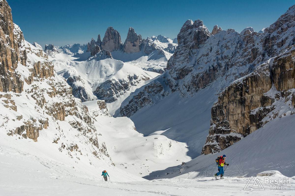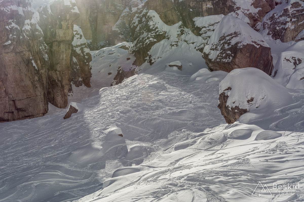 Próg pomiędzy dolną a górną częścią doliny ja zjeżdżam na nartach a Bolek i Przemek bardziej asekuracyjnie w rakach pokonują te trudności. Po tym fragmencie przejazd dnem doliny mocno przejeżdżonej przez poprzedników jest średnio przyjemny. W godzinę od rozpoczęcia zjazdu, melduję się z powrotem na parkingu i w promieniach chylącego się ku zachodowi słońca, podziwiam urodę masywu Cristallo.