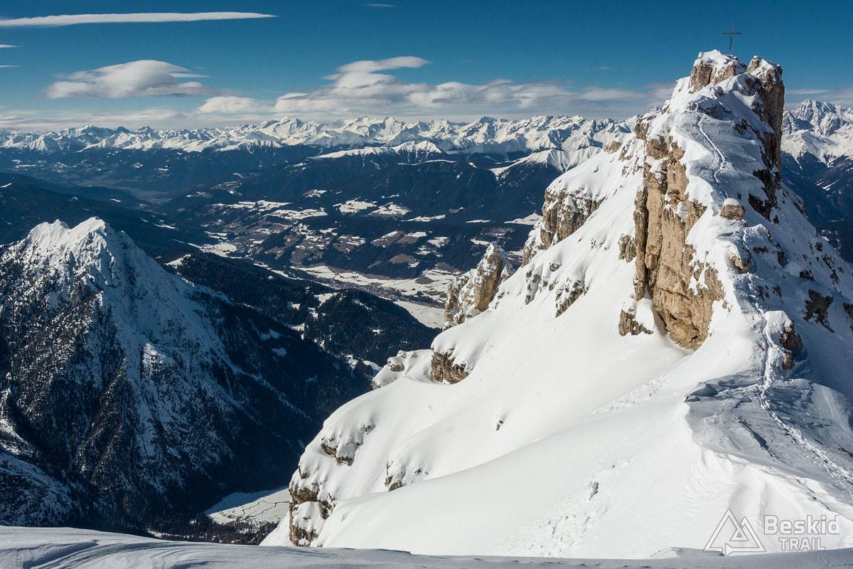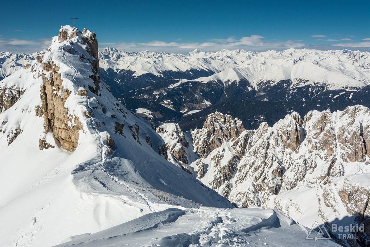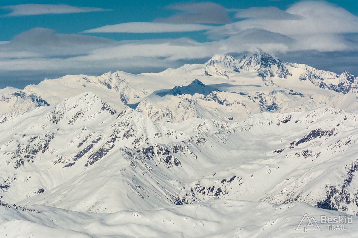 Cima Alta Piatte zdobyliśmy dość późno, kilkanaście minut przed 15. Z wierzchołka roztaczały się przecudne widoki, w zasadzie w każdą stronę. Wyjątkowa przejrzystość pozwalała dostrzec dalekie pasma Alp, z wieloma wybitnymi szczytami. Na górze w zasadzie spędziliśmy tylko tyle czasu, by coś zjeść, napić się i porobić kilka zdjęć, wiedząc, że z każdą minutą warunki do zjazdu będą się pogarszać (część doliny zaczęła zachodzić cieniem, tworząc nieprzyjemną szreń).