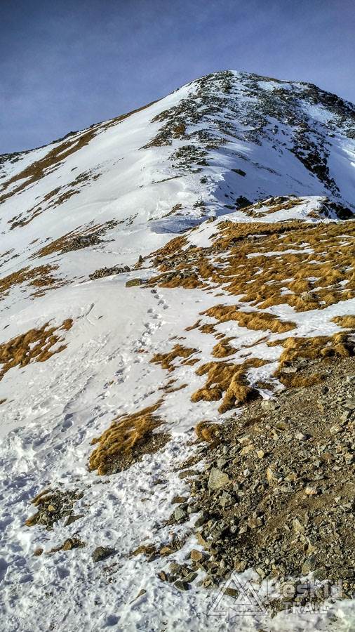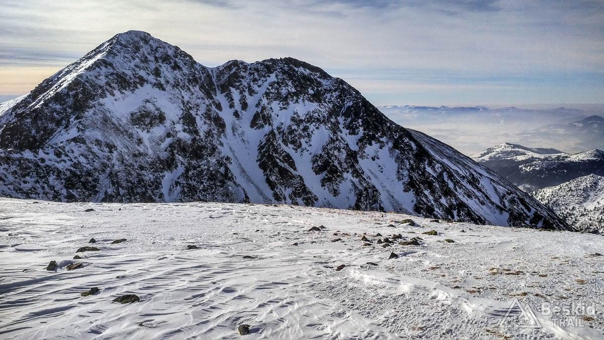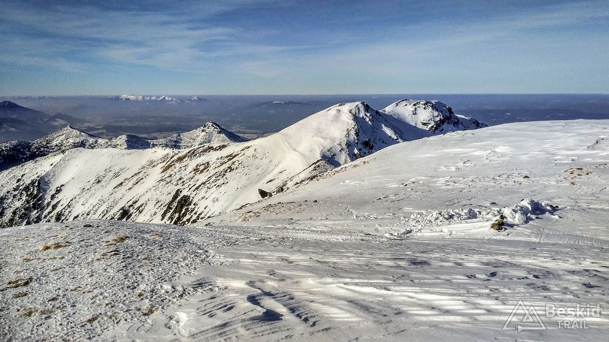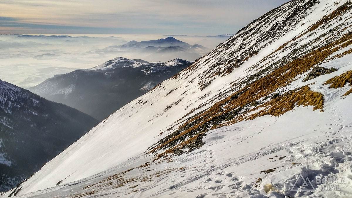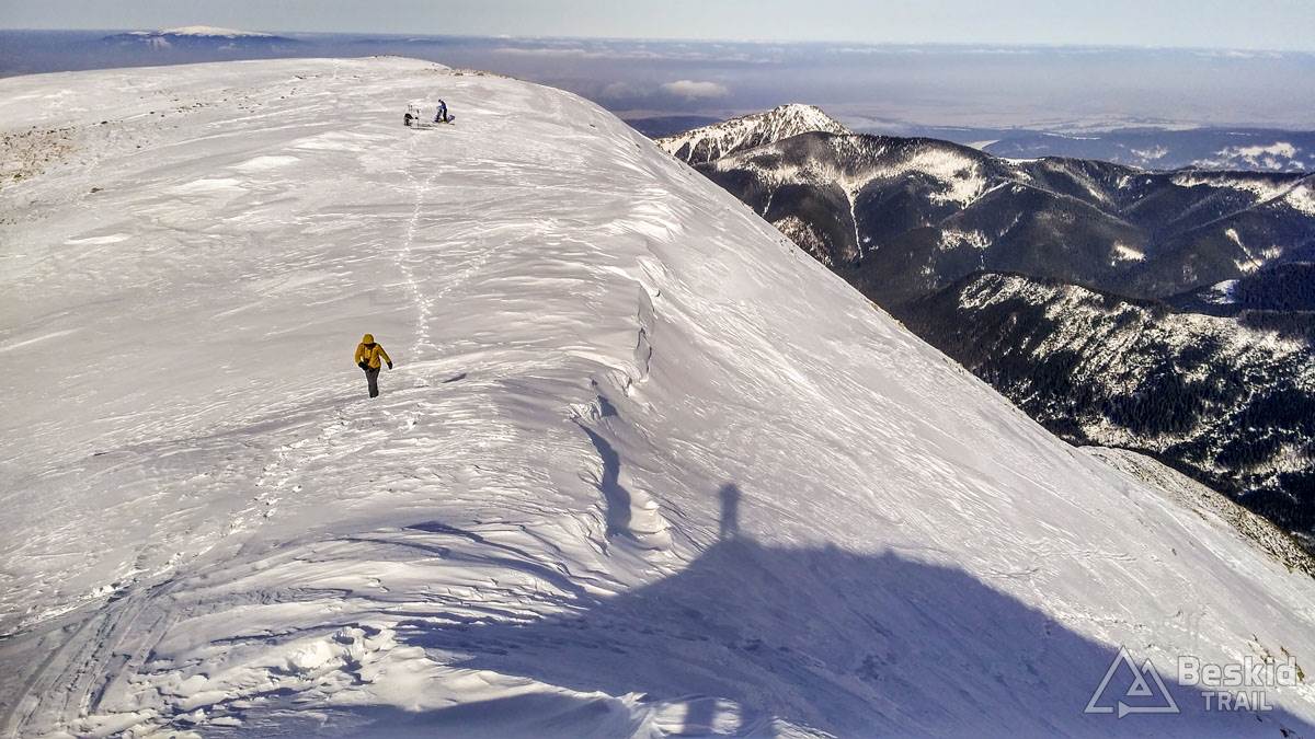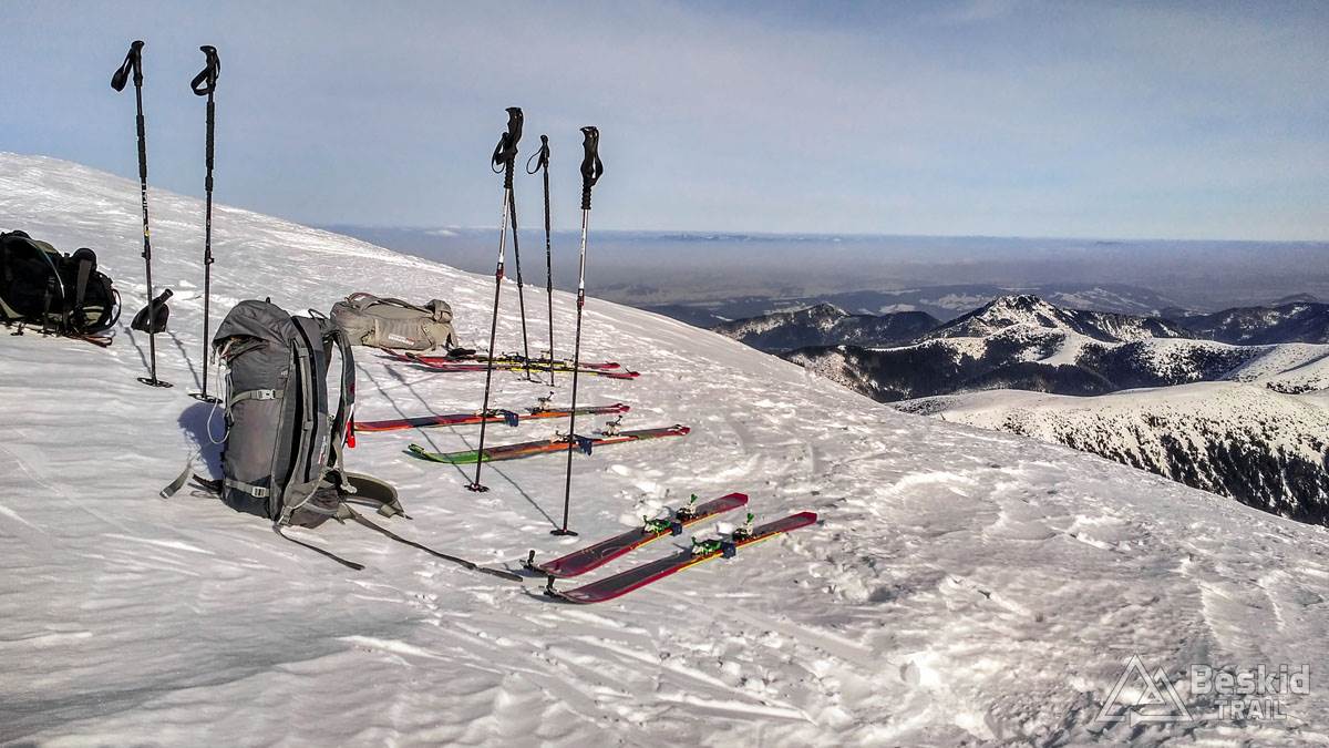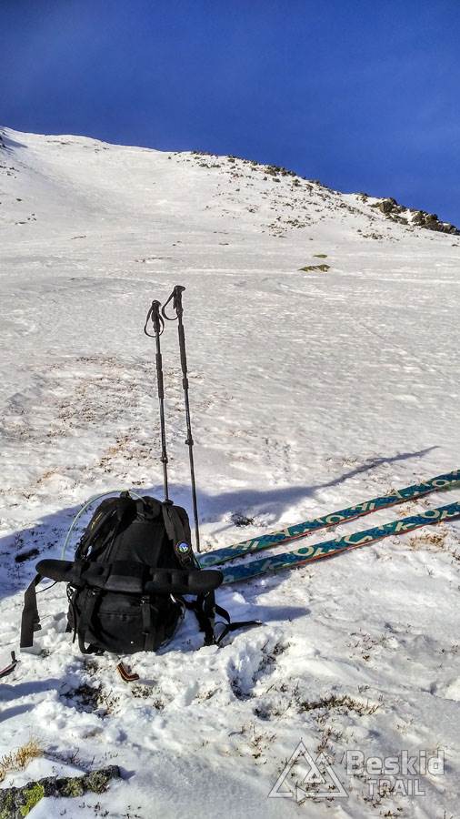Zjadłszy drugie śniadanie, w międzyczasie już ciesząc się z otaczającej nas przestrzeni gór, kontynuowaliśmy podejście na Spaloną. Na wierzchołek udało się wyjść na nartach, choć harszle i mocne ramiona wybitnie się przydały. Miejscami śnieg twardy i zbity, a miejscami świeża szreń, przez którą łatwo można było przebić się do gruntu (tak, tak – śniegu miejscami było tylko „w sam raz”, nic więcej).