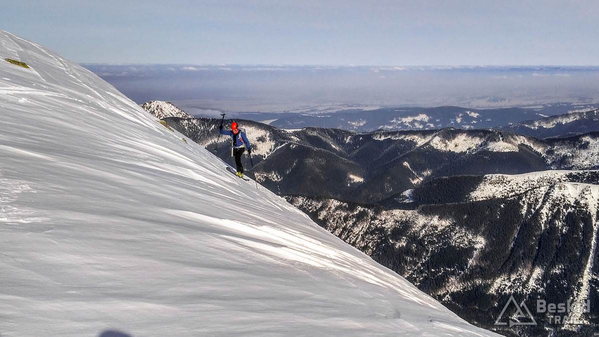 Grzecznie więc szybko wróciliśmy na przełęcz i z niej, już bez przerw, zjechaliśmy do Doliny Rohackiej. Warunki mieliśmy ciut lepsze niż na Spalonej, ponieważ nie było szreni. Natomiast wciąż było temu daleko od oczekiwań. Widać było, że wiatr spore depozyty śniegu przenosił z grzbietów i zboczy w las i doliny.