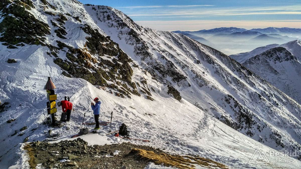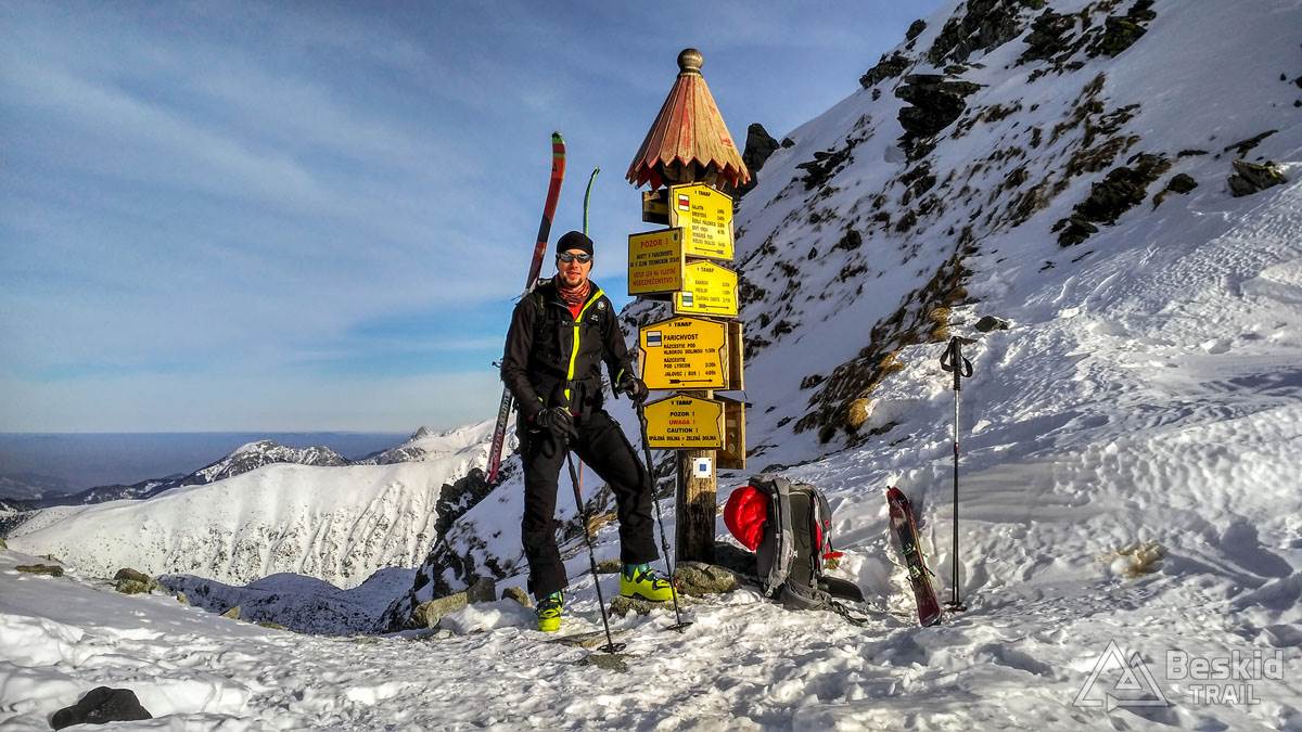 Mimo średnich warunków zjazdowych, korzystając z bliskości Przełęczy Banikowskiej, postanowiliśmy wyjść i na nią. Podejście ponownie w całości w cieniu, ale w już nieco wyższej temperaturze. A na przełęczy niemalże Afryka – ciepłe słoneczko, brak wiatru – tylko hostess z parasolkami brakowało :).