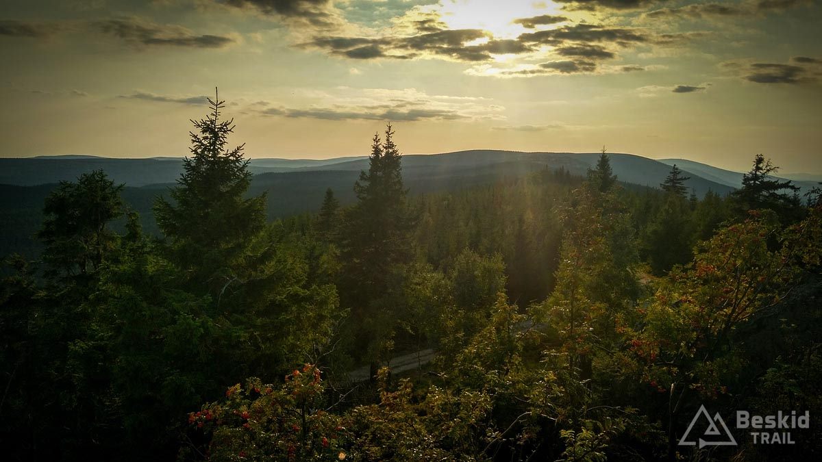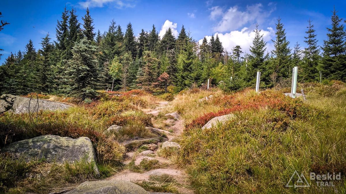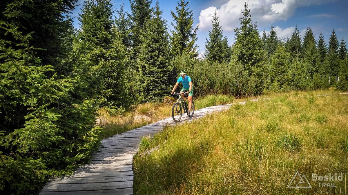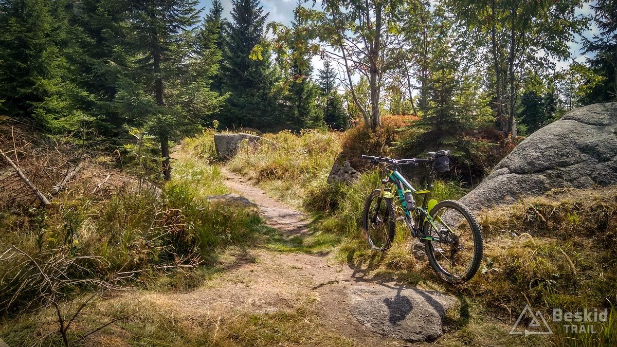 Z Jizerki podjeżdżamy pod Bukowiec i świetnym zielonym szlakiem z powrotem zjeżdżamy do doliny Izery. Później już malowniczy przejazd do Chatki Górzystów i świetny podjazd żółtym, a potem czerwonym szlakiem pod Sine Skałki. Potem już tylko niedługi grzbietowy fragment przez Kopalnię Stanisław w kierunku Wysokiego Kamienia, i niebieskim szlakiem zjeżdżamy do Szklarskiej Poręby.