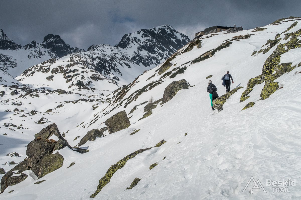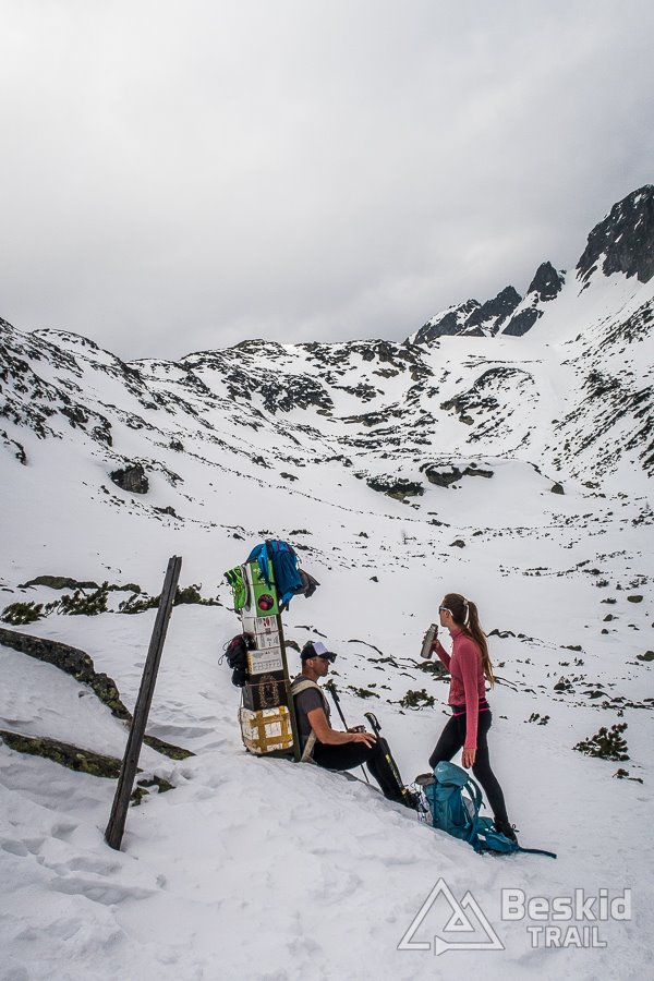 Podczas naszej wycieczki za cel obraliśmy Świstowy Szczyt (2382 m n.pm.) oraz przełęcz Rohatka (2288 m n.pm.). Oba miejsca leżą niemal obok siebie, więc naturalnym było połączenie ich w jedną całość. Na początku czekało nas podejście ze Starego Smokowca na Hrebeniok z przytroczonymi nartami do plecaka, ponieważ śniegu na tej wysokości już praktycznie nie ma w Tatrach, szczególnie po południowej ich stronie. Dopiero po tym odcinku udało się założyć narty na nogi i już bez problemów ze śniegiem doszliśmy do Zbójnickiej chaty (1960 m n.p.m.). W schronisku zrobiliśmy sobie krótki odpoczynek, jednocześnie jedząc drugie śniadanie.