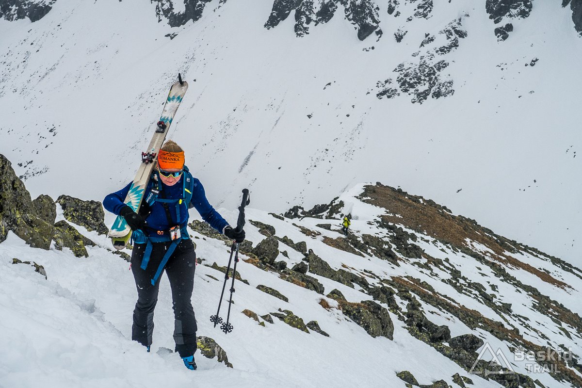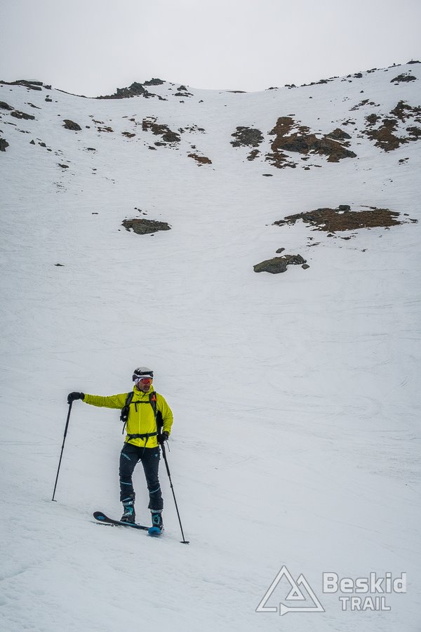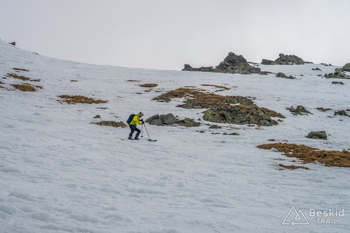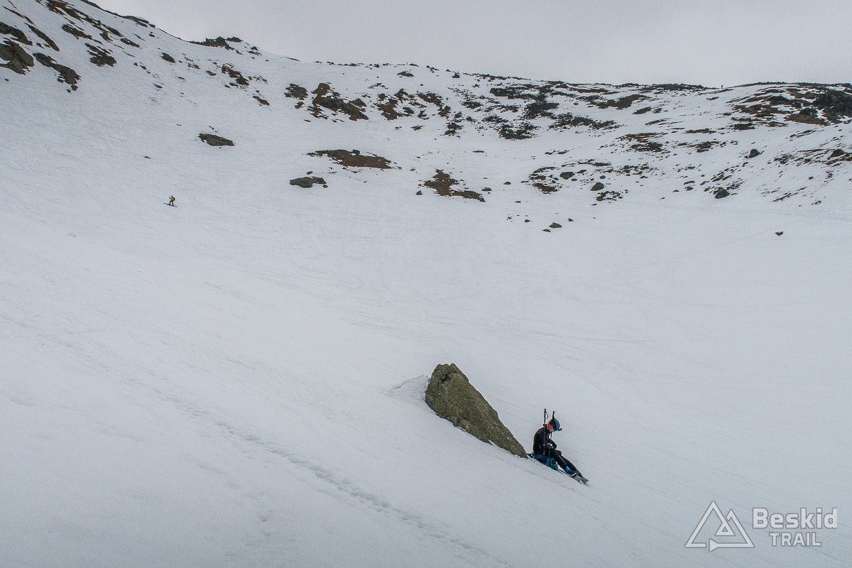 Na szczęście po „zjeździe” ze Świstowego Szczytu mieliśmy jeszcze motywację do kolejnego celu, by na niego wejść. Zbocze, którym prowadziły zakosy (a potem już z nartami przypiętymi do plecaka), było wystarczająco równe, a śnieg na nim był co prawda twardy, ale dobrze trzymający nartę w zjeździe. Dzięki temu zjazd z Rohatki podbudował nasze morale i cieszyliśmy się z drugiego wyboru.