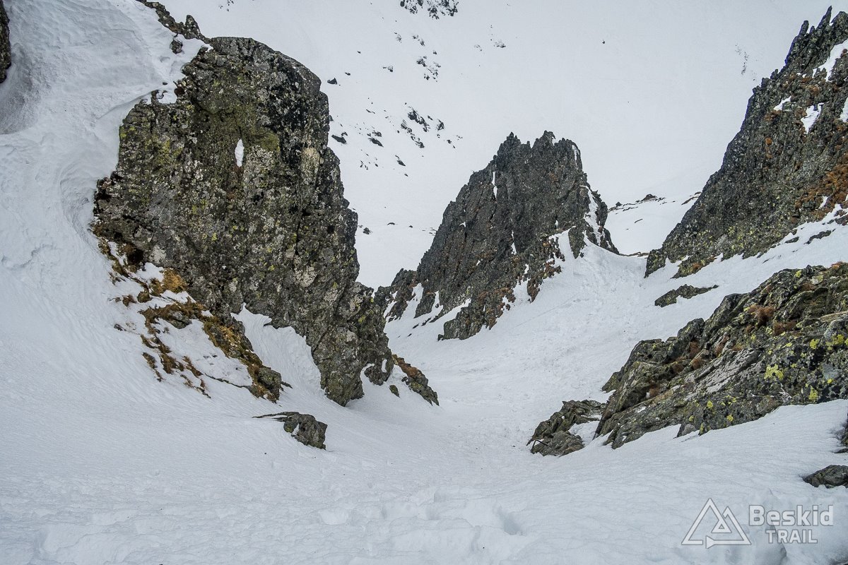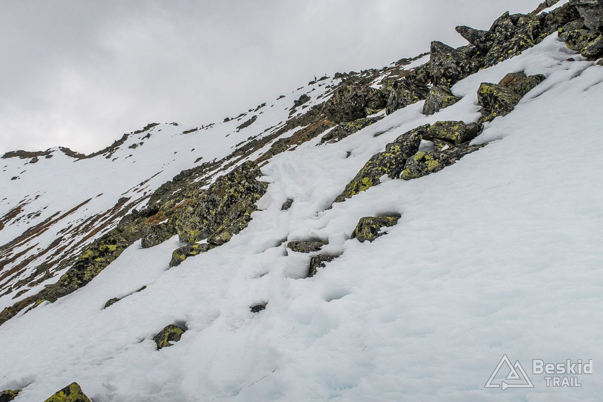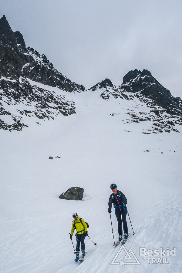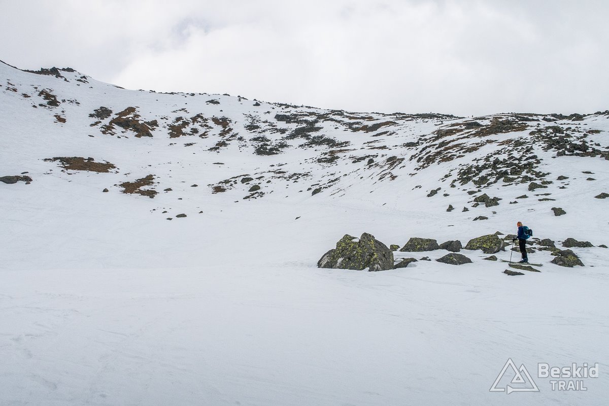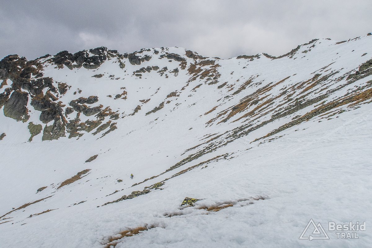 Na szczęście po „zjeździe” ze Świstowego Szczytu mieliśmy jeszcze motywację do kolejnego celu, by na niego wejść. Zbocze, którym prowadziły zakosy (a potem już z nartami przypiętymi do plecaka), było wystarczająco równe, a śnieg na nim był co prawda twardy, ale dobrze trzymający nartę w zjeździe. Dzięki temu zjazd z Rohatki podbudował nasze morale i cieszyliśmy się z drugiego wyboru.